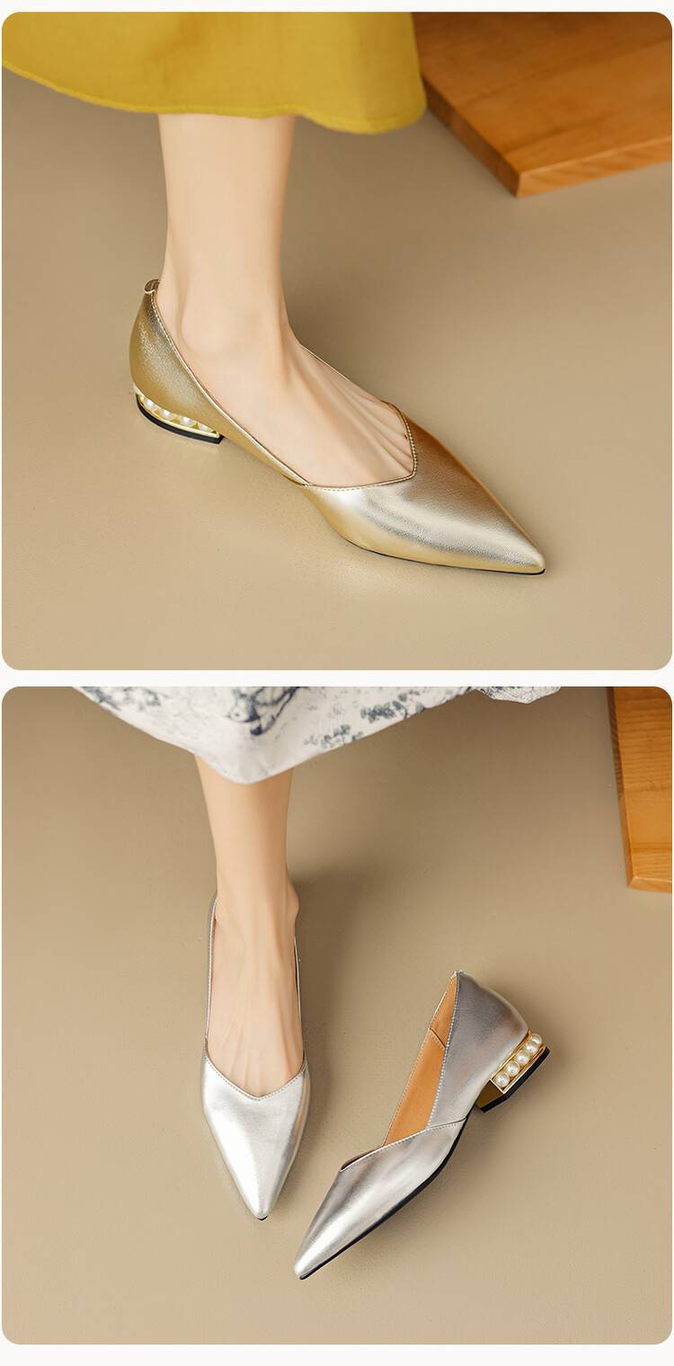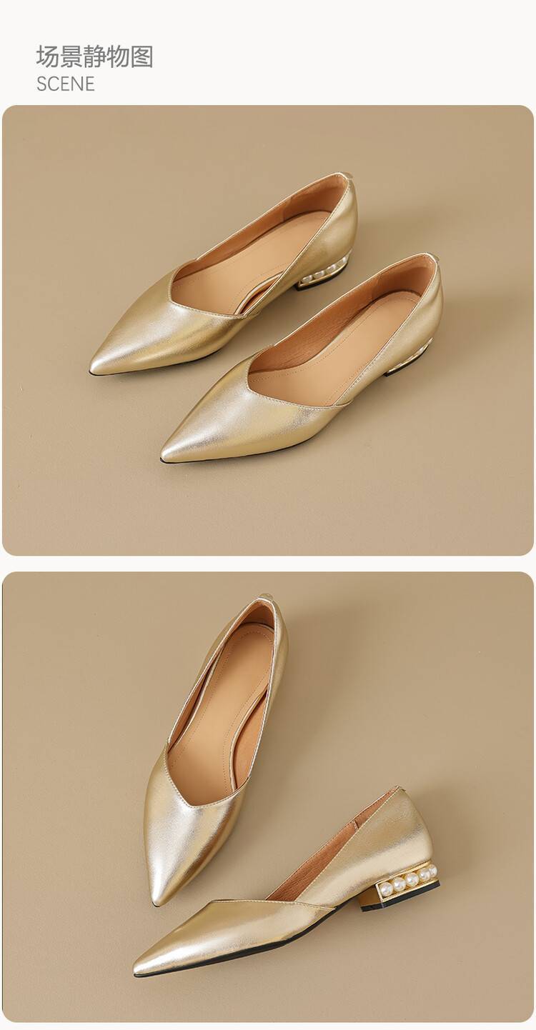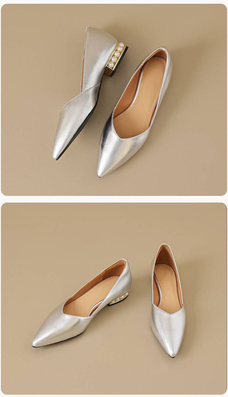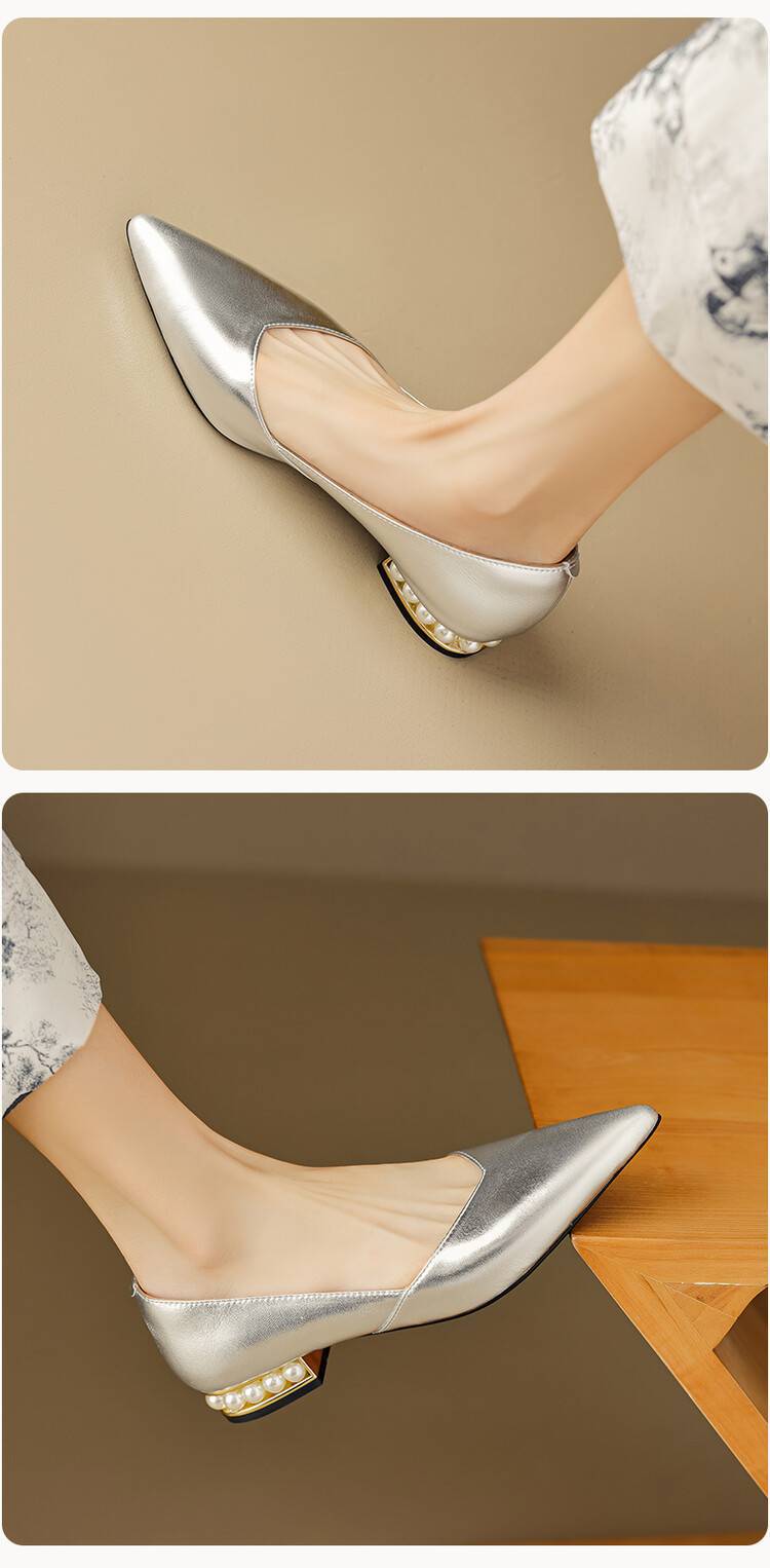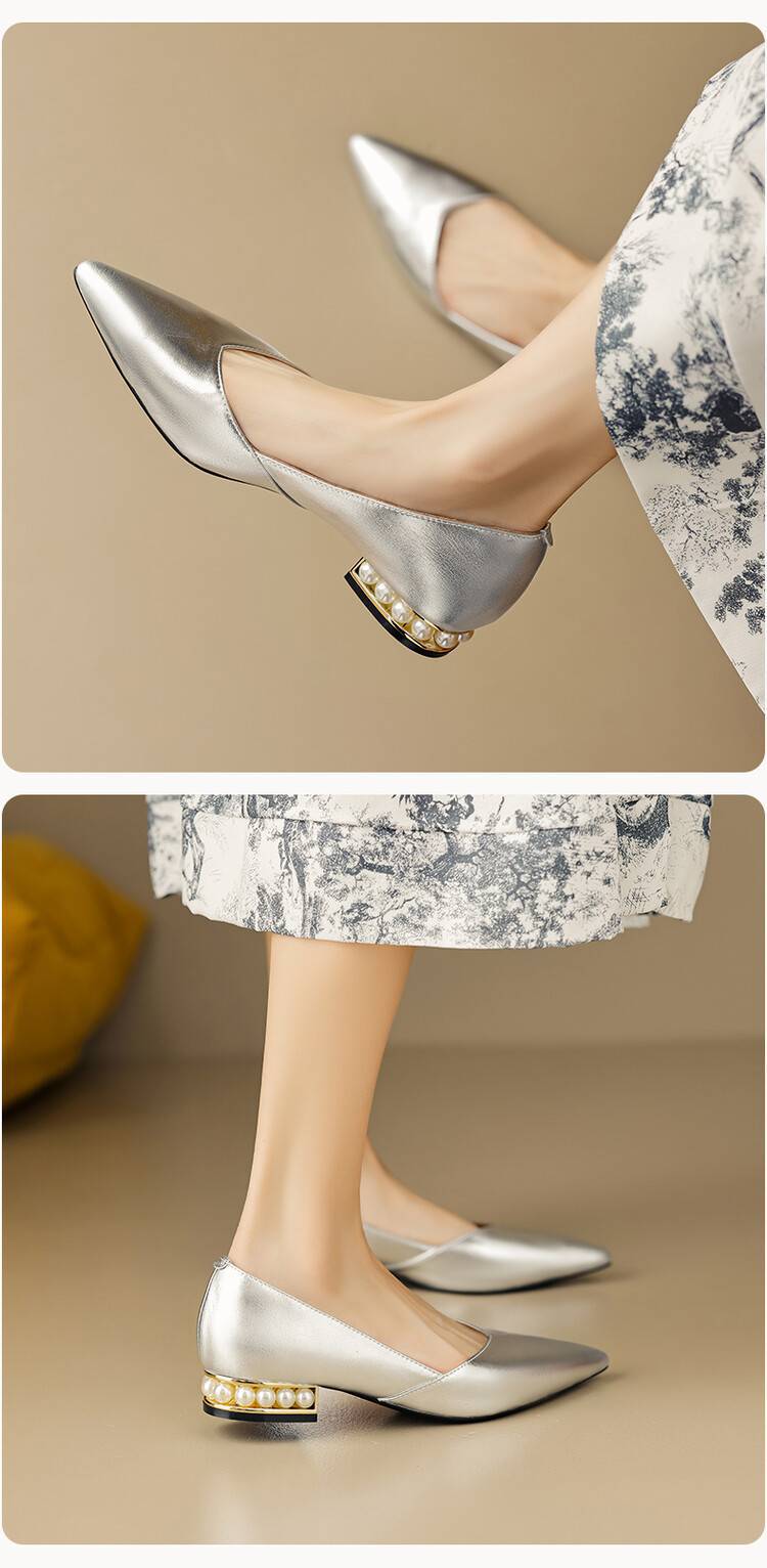 【预售7天】韩系高级感牛皮珍珠银色单鞋舒适又洋气尖头粗跟小个子上班鞋DQ&DQ623