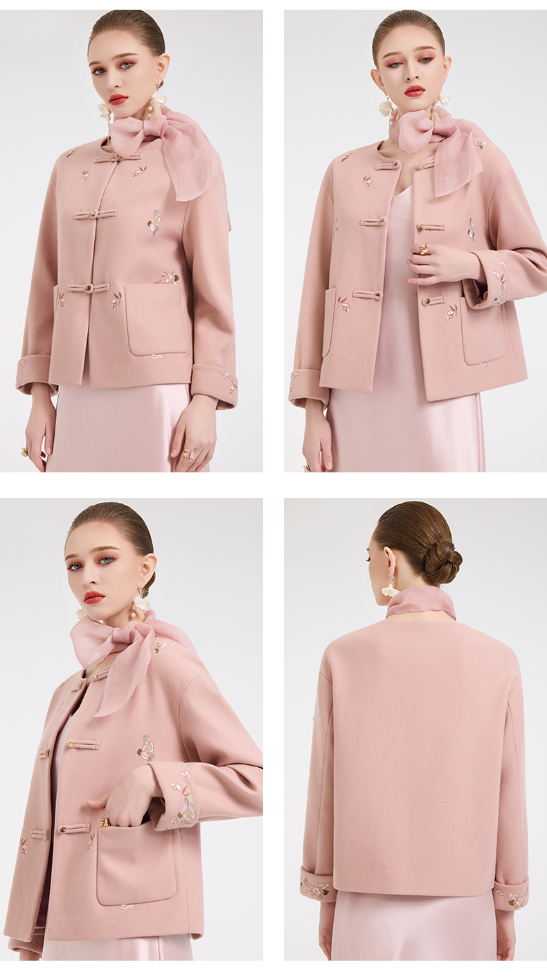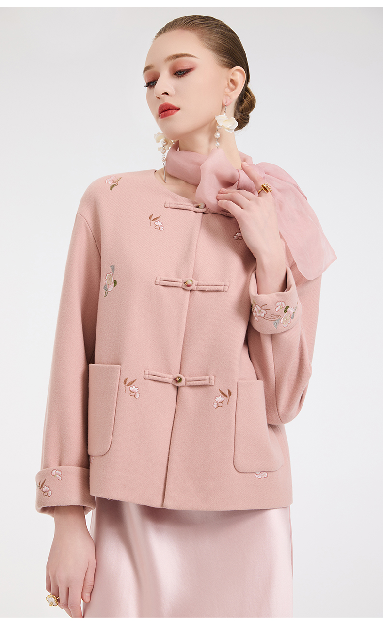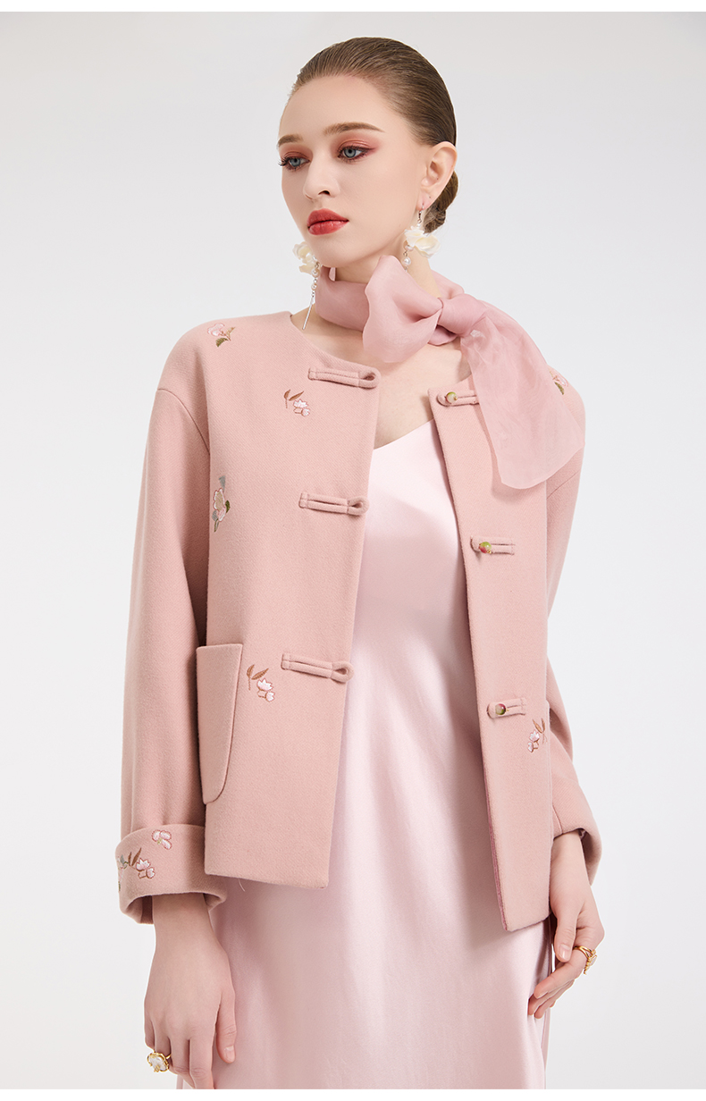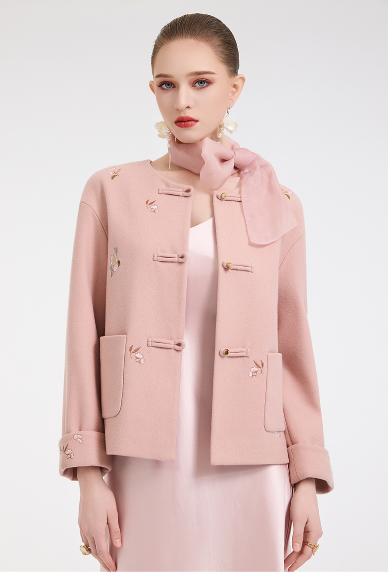乔万尼新中式盘扣刺绣设计感无领羊毛羊绒混纺短款羊毛大衣外套ED4B786
