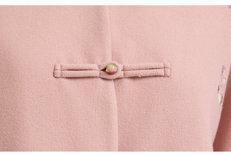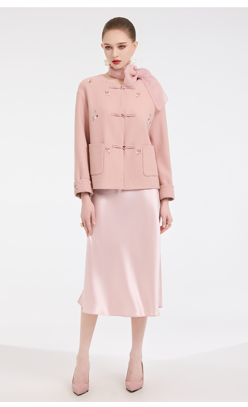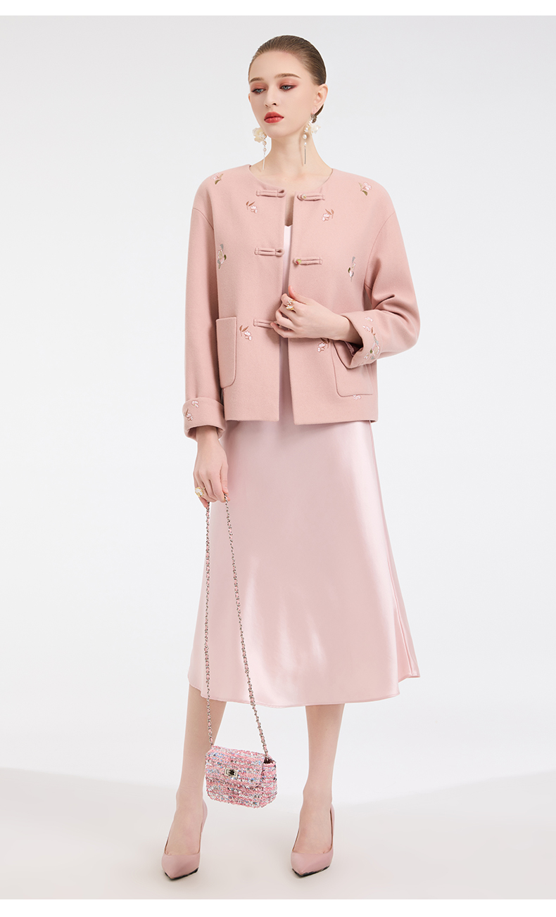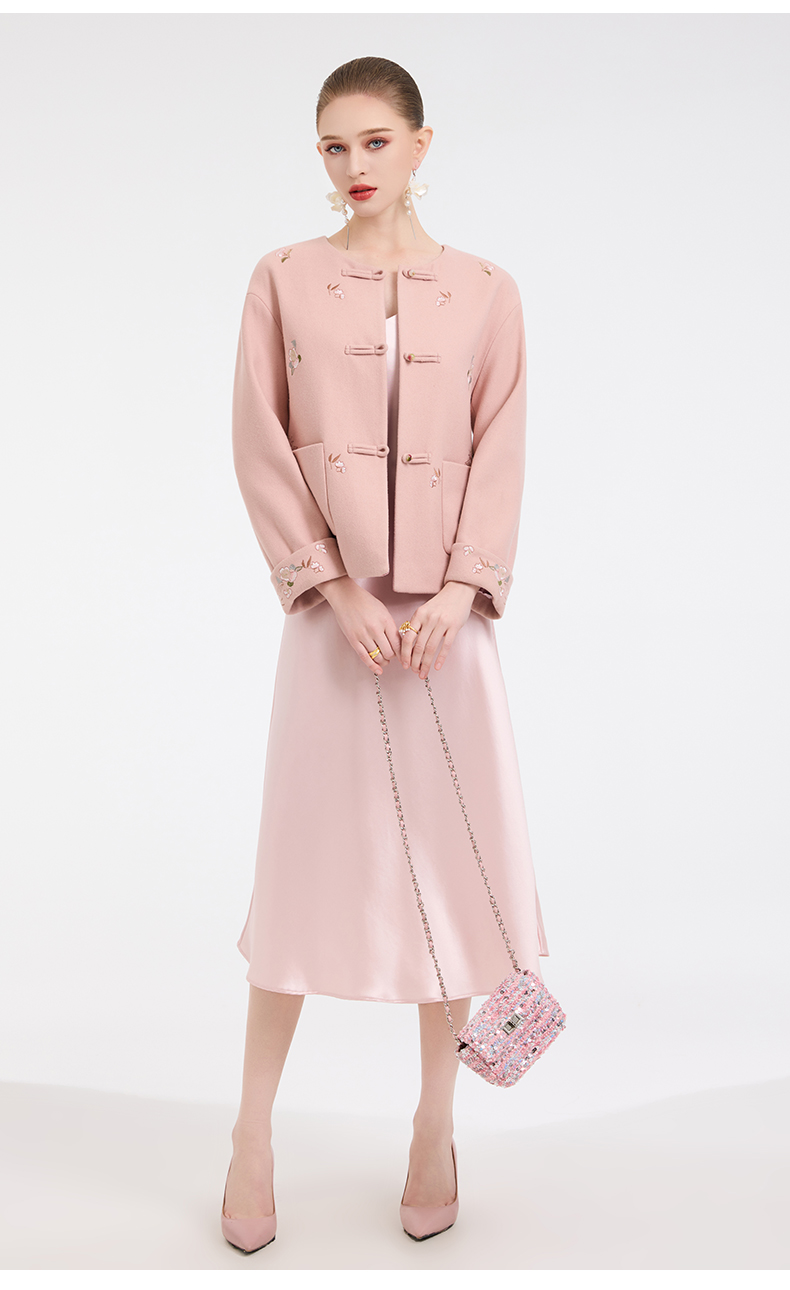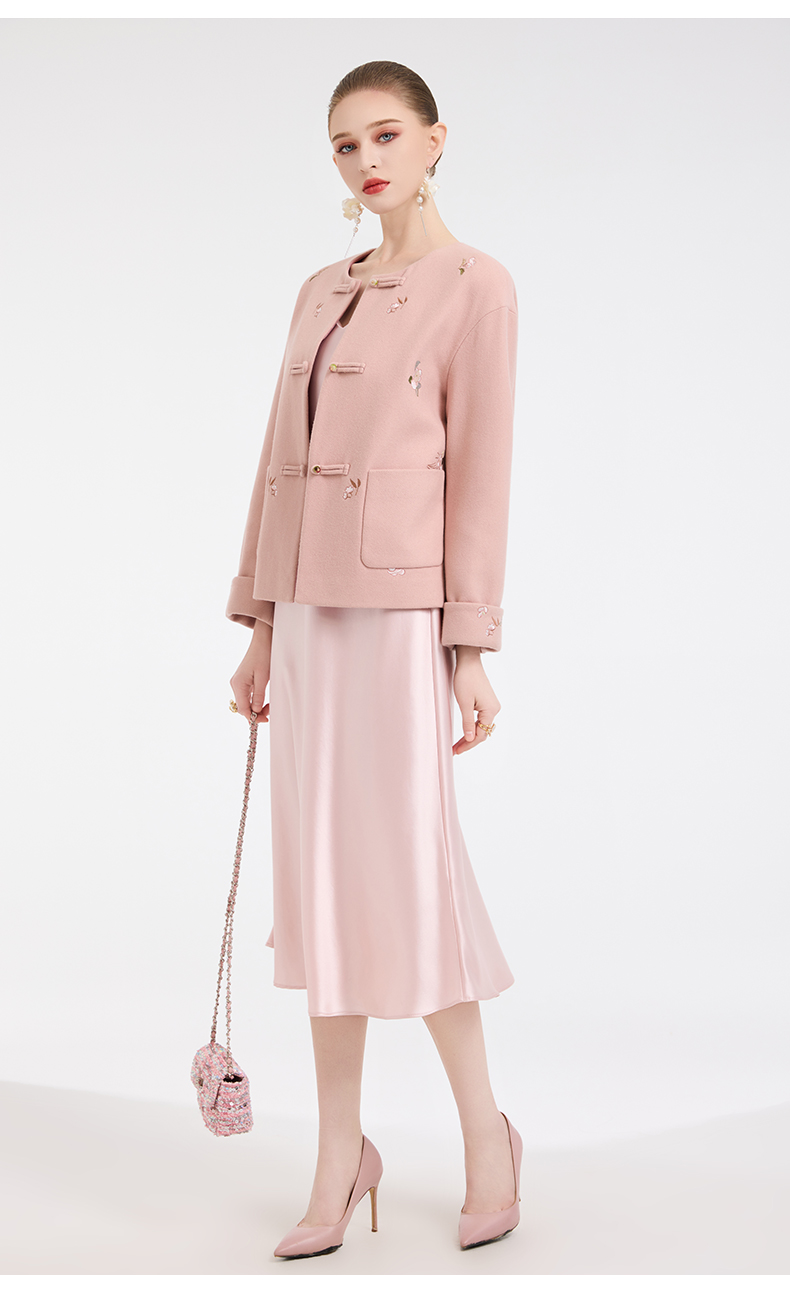 乔万尼新中式盘扣刺绣设计感无领羊毛羊绒混纺短款羊毛大衣外套ED4B786