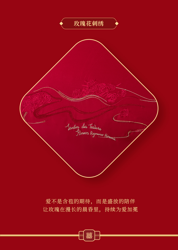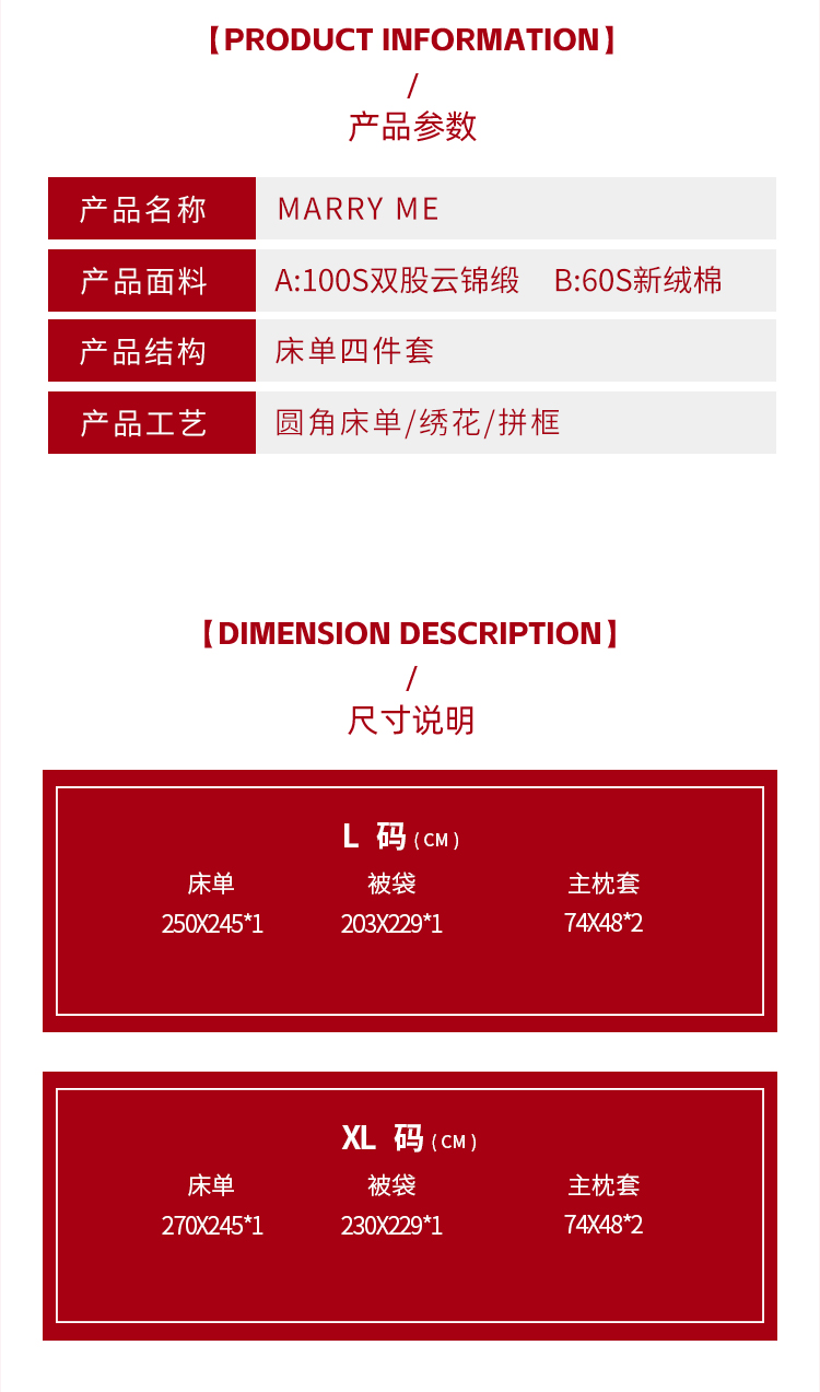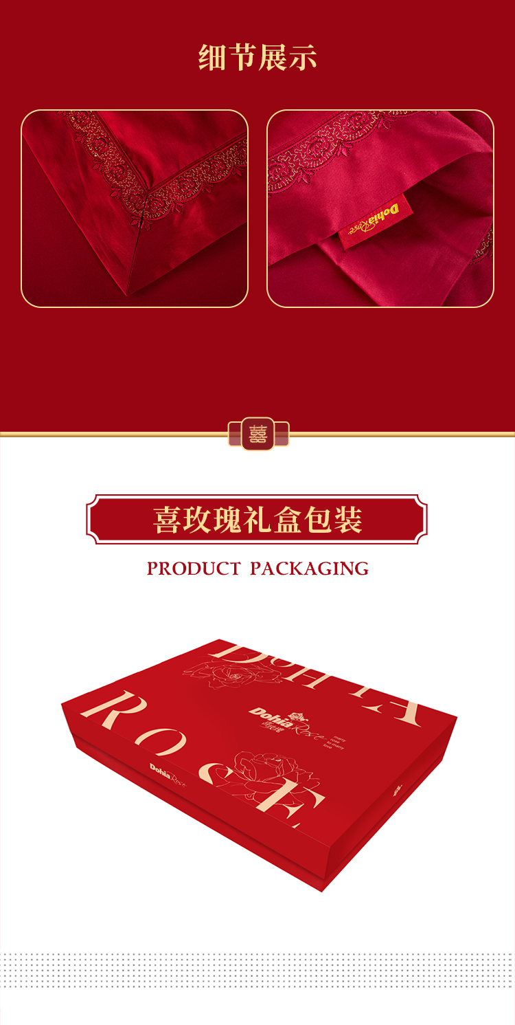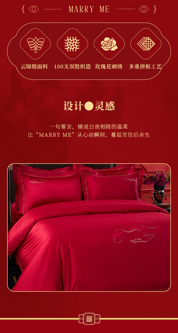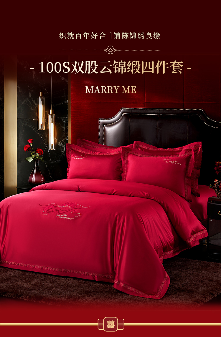 多喜爱 喜玫瑰100S双股云锦缎四件套 Marry me【玫瑰花刺绣】【拼框工艺】【红色礼盒包装】更强韧更顺滑 手感细腻 色泽亮丽