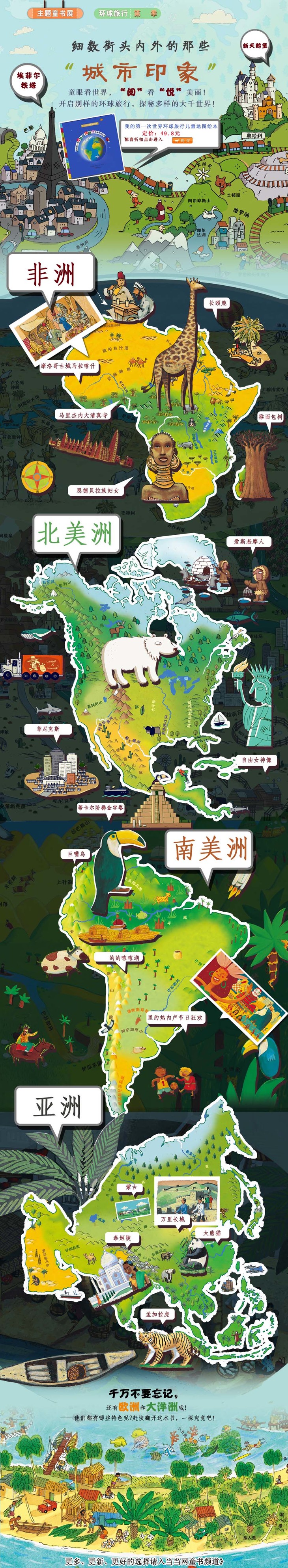 翻完这本书,我好像自己完成了一次世界环球旅行:从欧洲到北美、从法国的埃菲尔铁塔到印度的泰姬陵……七大洲、四大洋的地形、地貌、自然景观跃然纸上,而惟妙惟肖的插图又展示了各地独特的人文、风俗,这足以满足孩子那颗对大千世界的好奇心,他们也会由此喜欢更宽、更广的世界……