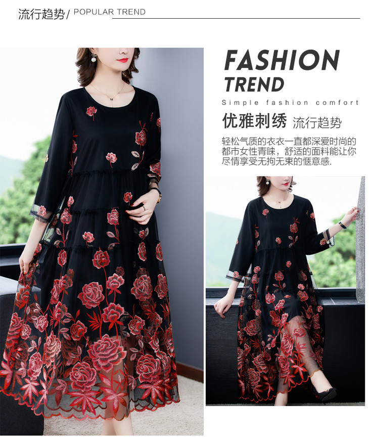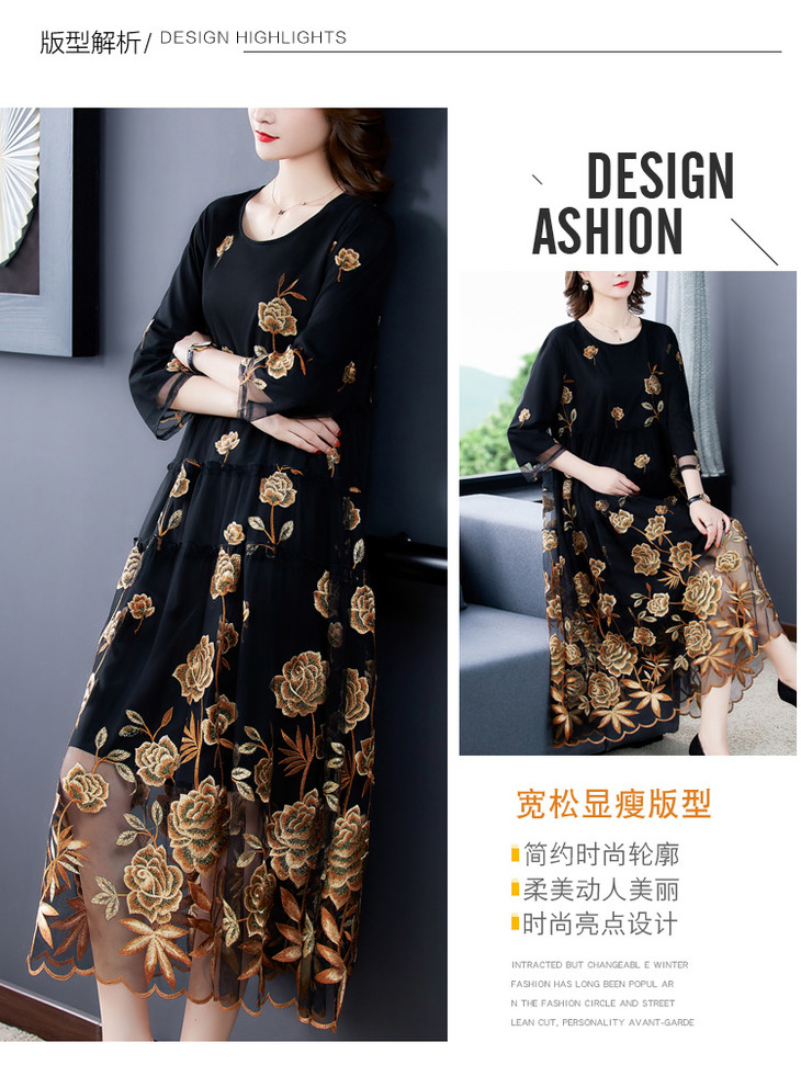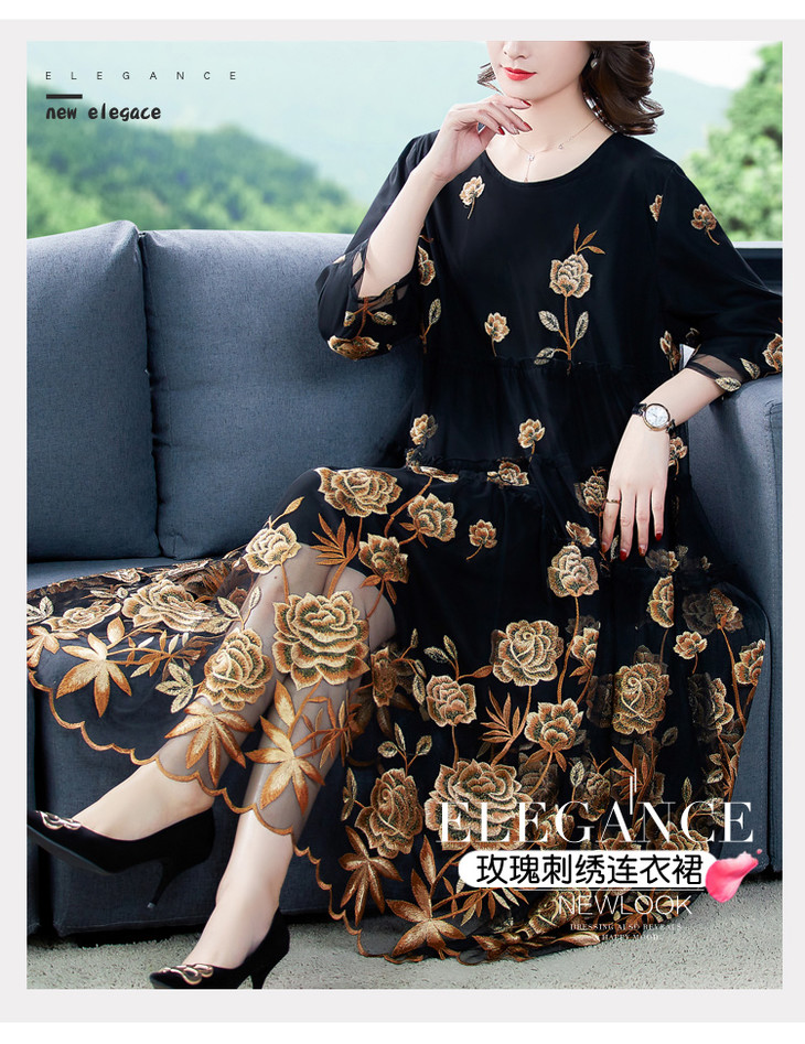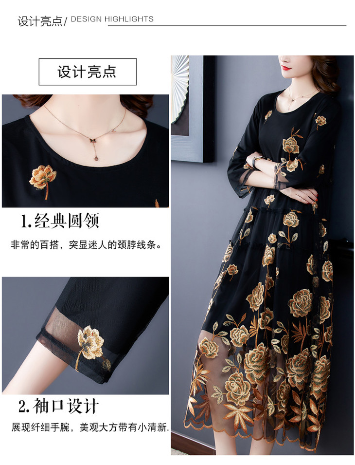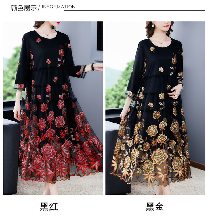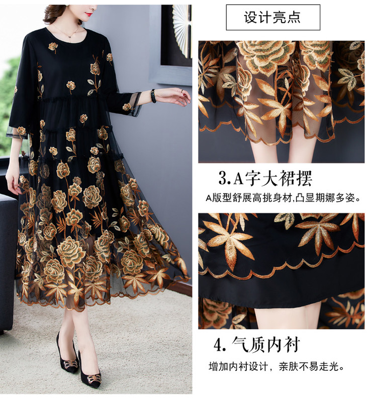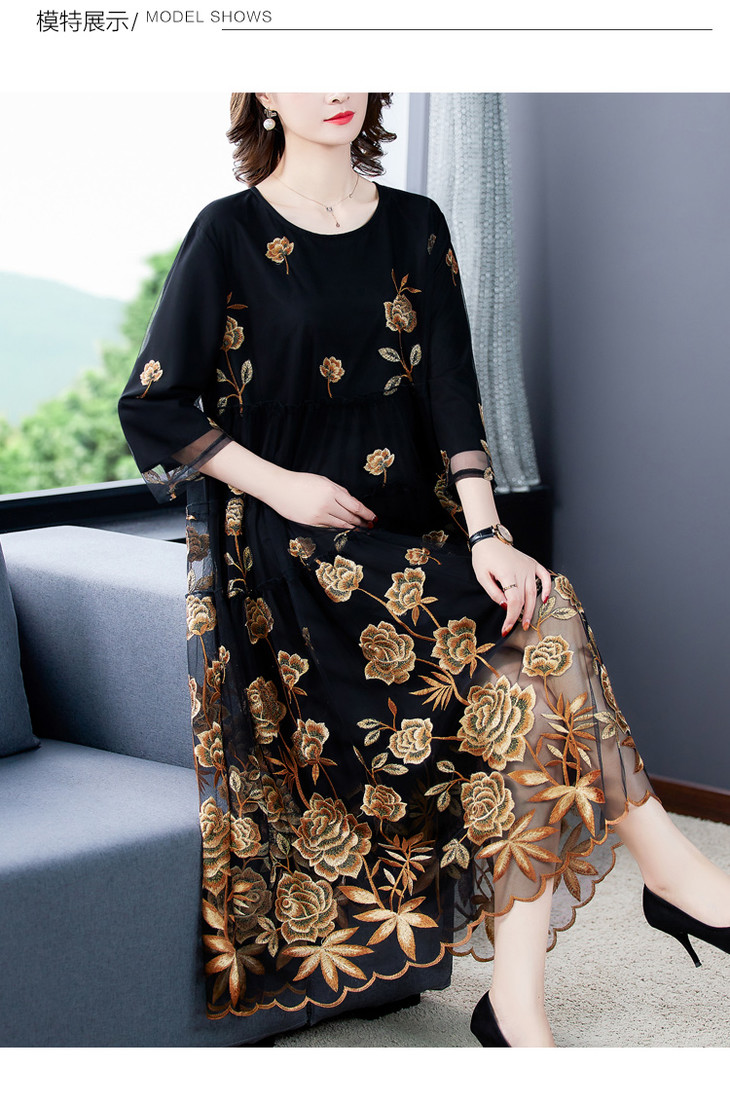XYX9278 新款女装高端妈妈洋气过膝 网纱绣花连衣裙