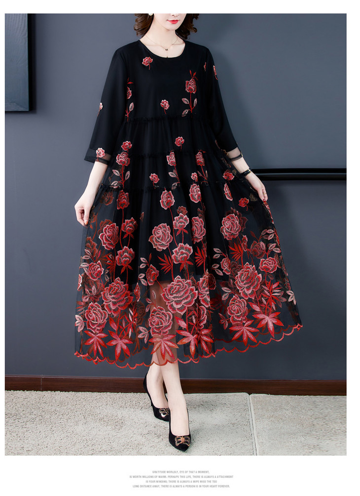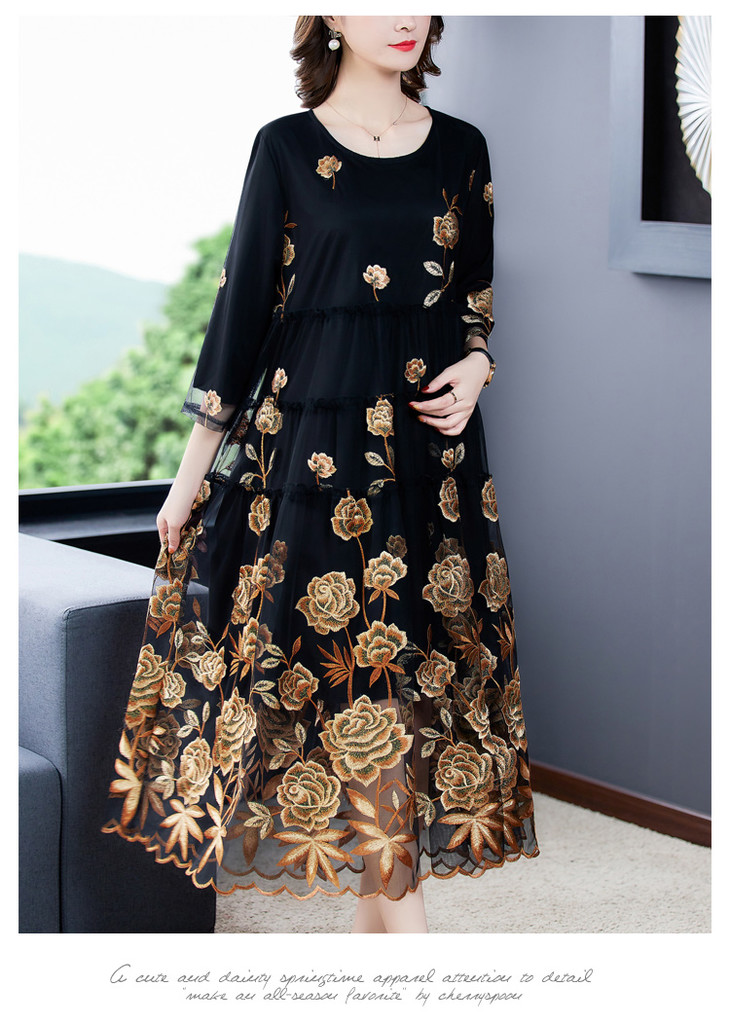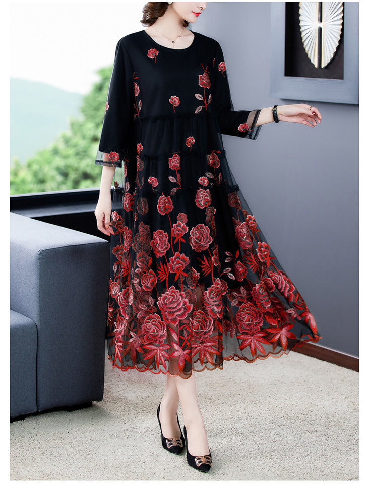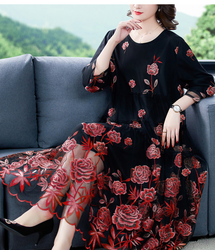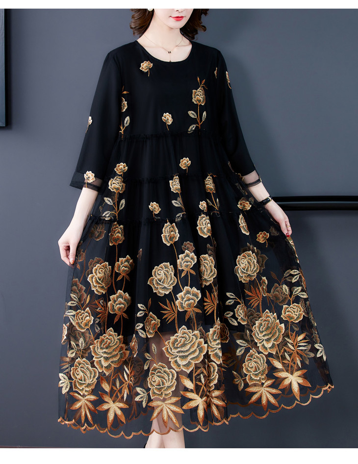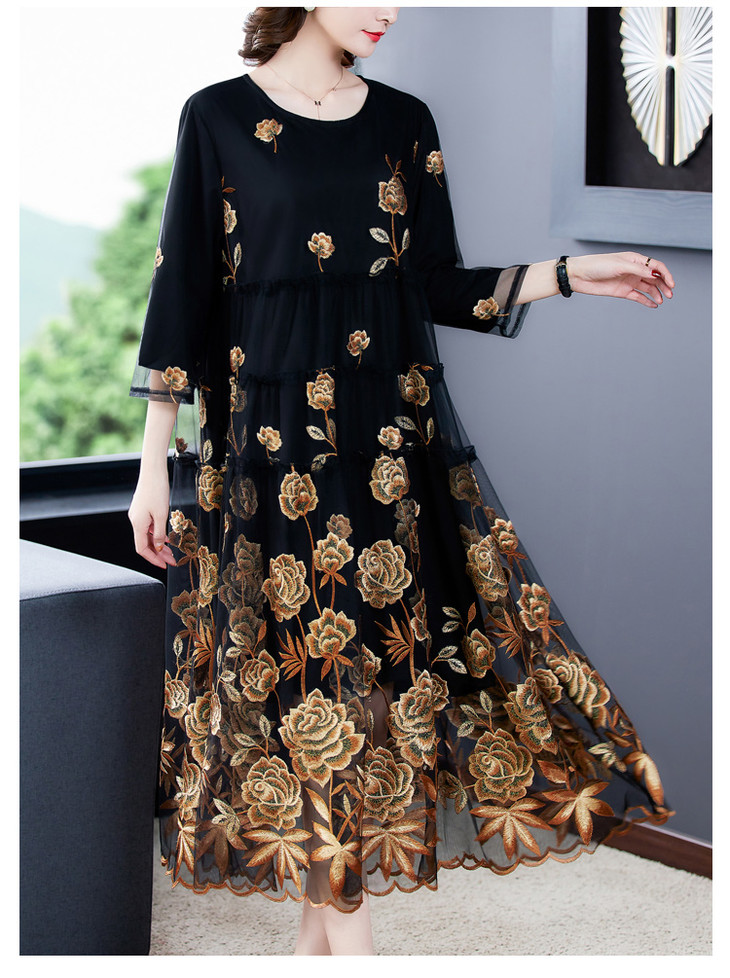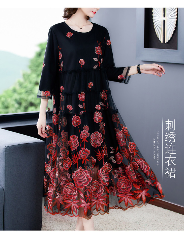 XYX9278 新款女装高端妈妈洋气过膝 网纱绣花连衣裙
