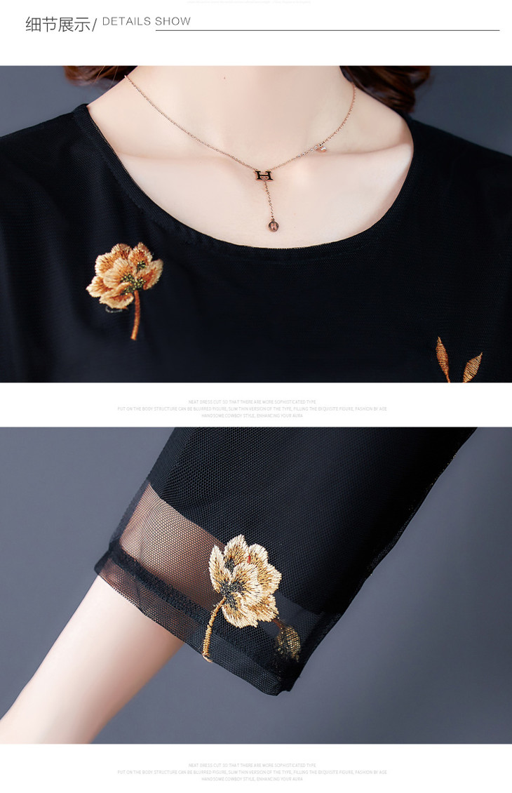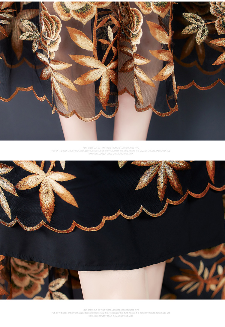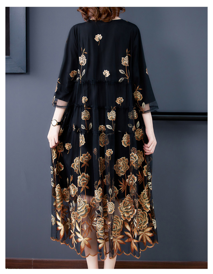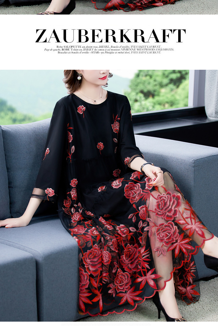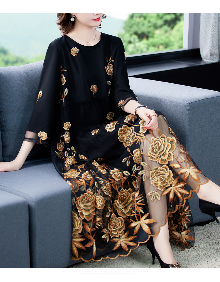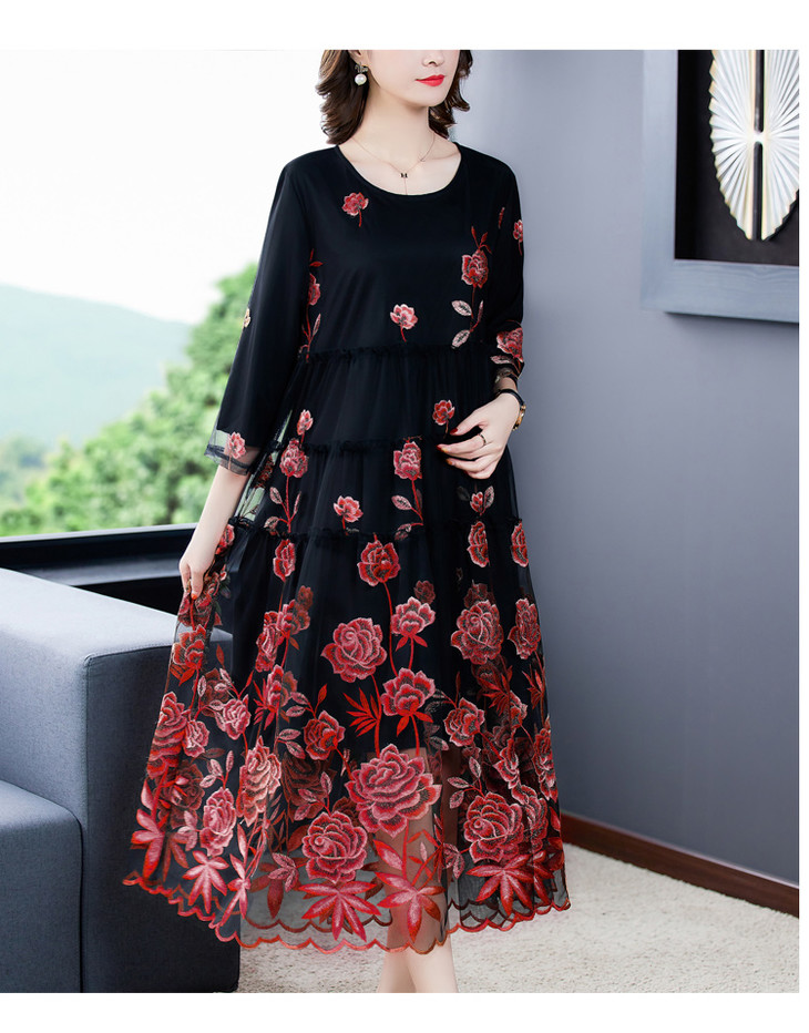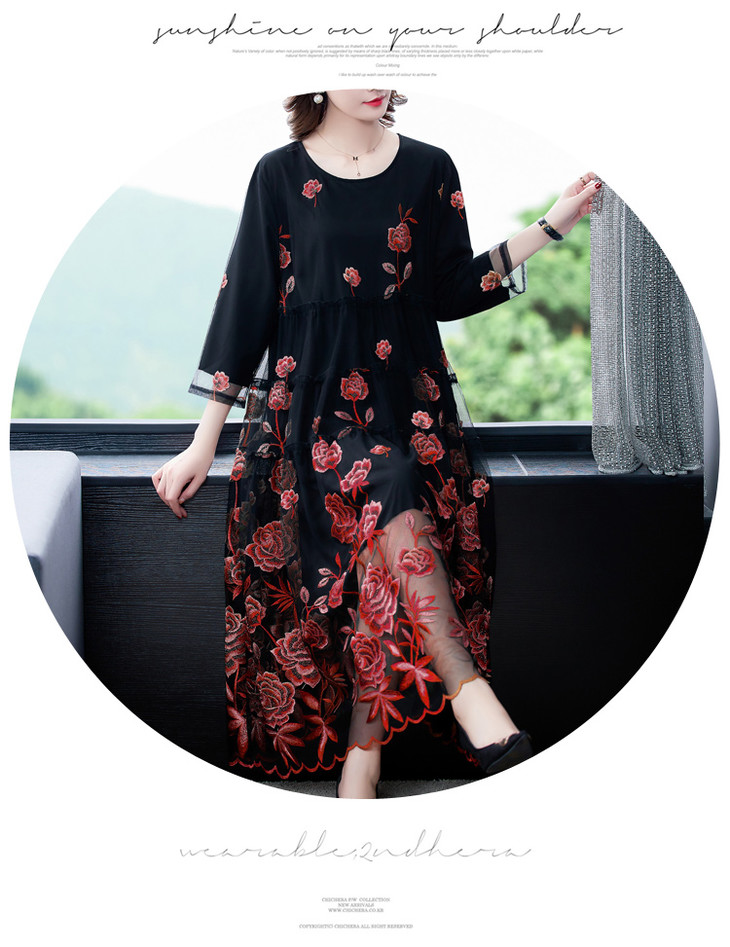 XYX9278 新款女装高端妈妈洋气过膝 网纱绣花连衣裙