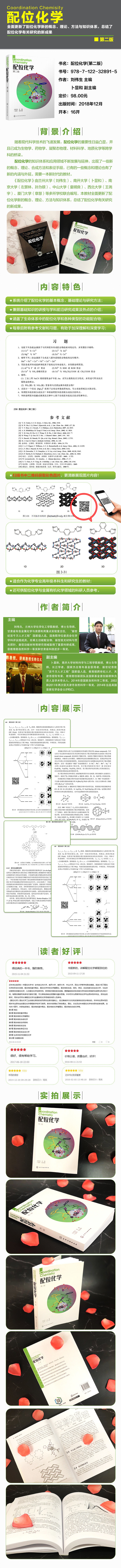 本教材是在第一版的基础上,经过编者修改后推出的,供本科生高年级及相关专业研究生的配位化学课程教学和学习使用。教材内容增加了一些新的概念、理论和方法及近年来配位化学有关研究的新成果。为了适应不同层次的读者学习需要,第3 章增加了“晶体场理论概述”一节,第7 章重写了“圆二色谱”一节,第10章增加了“光电转换配合物”一节。为了方便读者查阅相关的资料,在书末的附录中增加了附录Ⅲ和附录Ⅳ。为了使读者能够清晰地识别一些复杂结构图,在相应的章节增加了二维码,扫二维码就可以识别彩色图片。