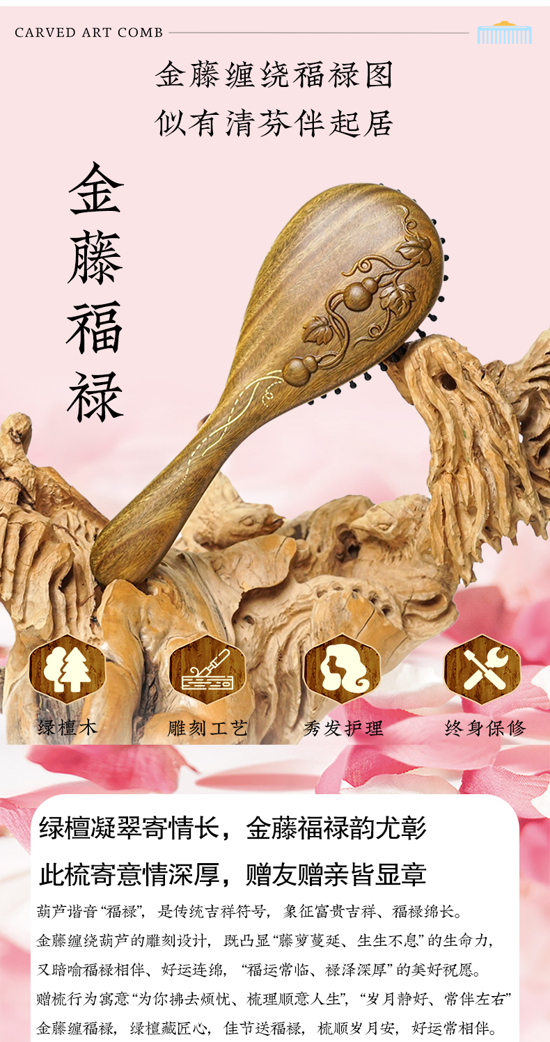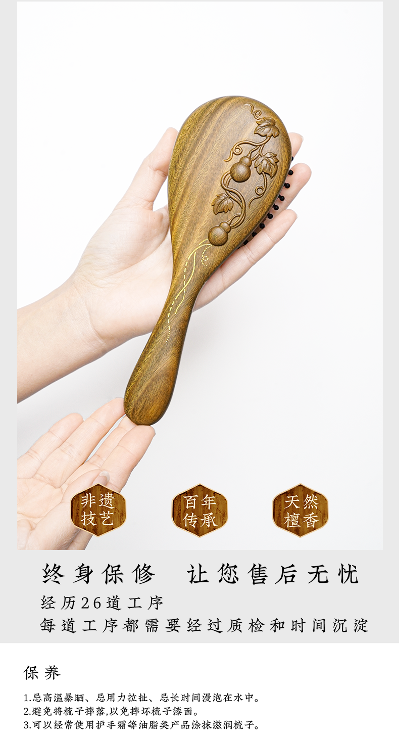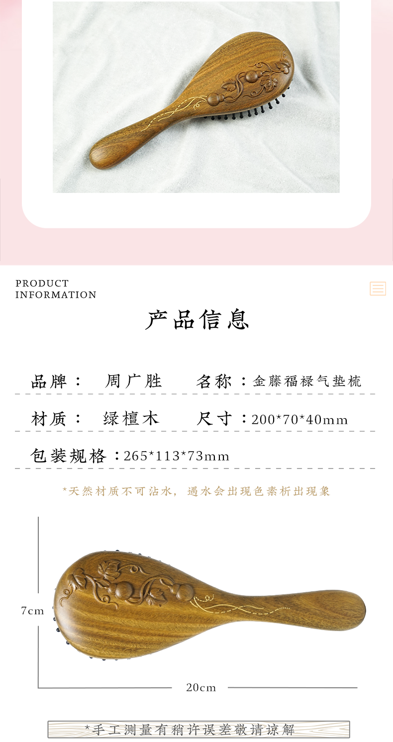 周广胜正品绿檀雕花金藤福禄防静电气垫按摩梳子女士专用护发顺发