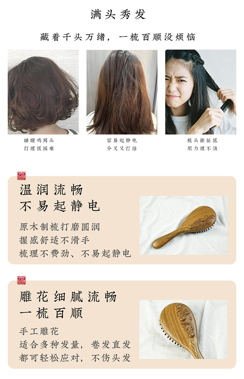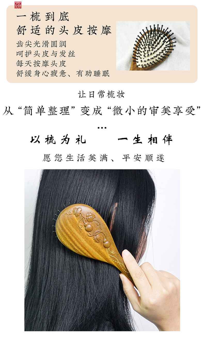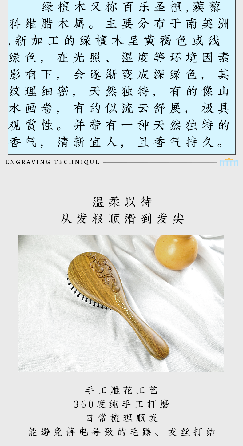 周广胜正品绿檀雕花金藤福禄防静电气垫按摩梳子女士专用护发顺发