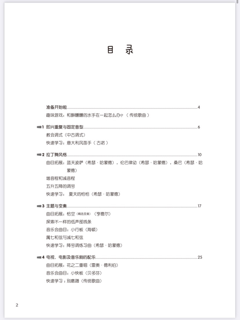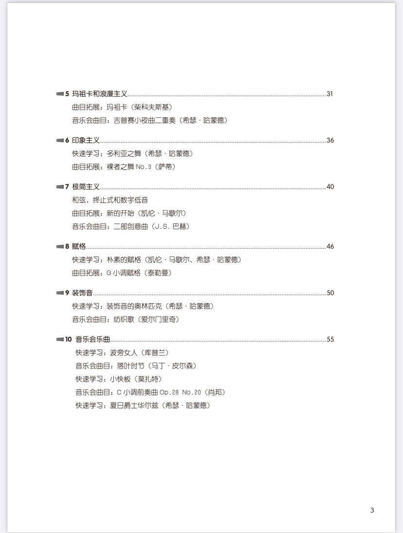 钢琴家训练营是针对钢琴基本演奏技巧的辅导教材,由英国钢琴教育家Karen Marshall和Hrether Hammond编著,深受教师推崇、学生喜爱。现我社将其引进中国出版发行,力求为钢琴学习者基本演奏技巧和音乐素养的综合培养指引一条新的道路。这套教材的内容按照难易程度分为初级、中级和高级三个阶段。本书是中级阶段教材中的第三册,主要针对已经结束钢琴学习初中级过渡阶段,需要继续提升弹奏技巧和音乐素养的学生群体。本册教材通过学习不同风格的乐曲 来培养学生的识谱能力,演奏技巧及乐理知识。教材内容注重讲解西方音乐不同时期的风格特征以及各类音乐体裁。帮助学生快速提高演奏能力,掌握不同的音乐风格,提高音乐素养。本书包括十个章节,每一章代表一种音乐风格,由同一类型的一首基本乐曲和进阶乐曲组成,搭配与之相对应乐理知识点。教材内容的设计和安排具有很强的系统性和趣味性,符合钢琴学生的学习需求和心理发展。