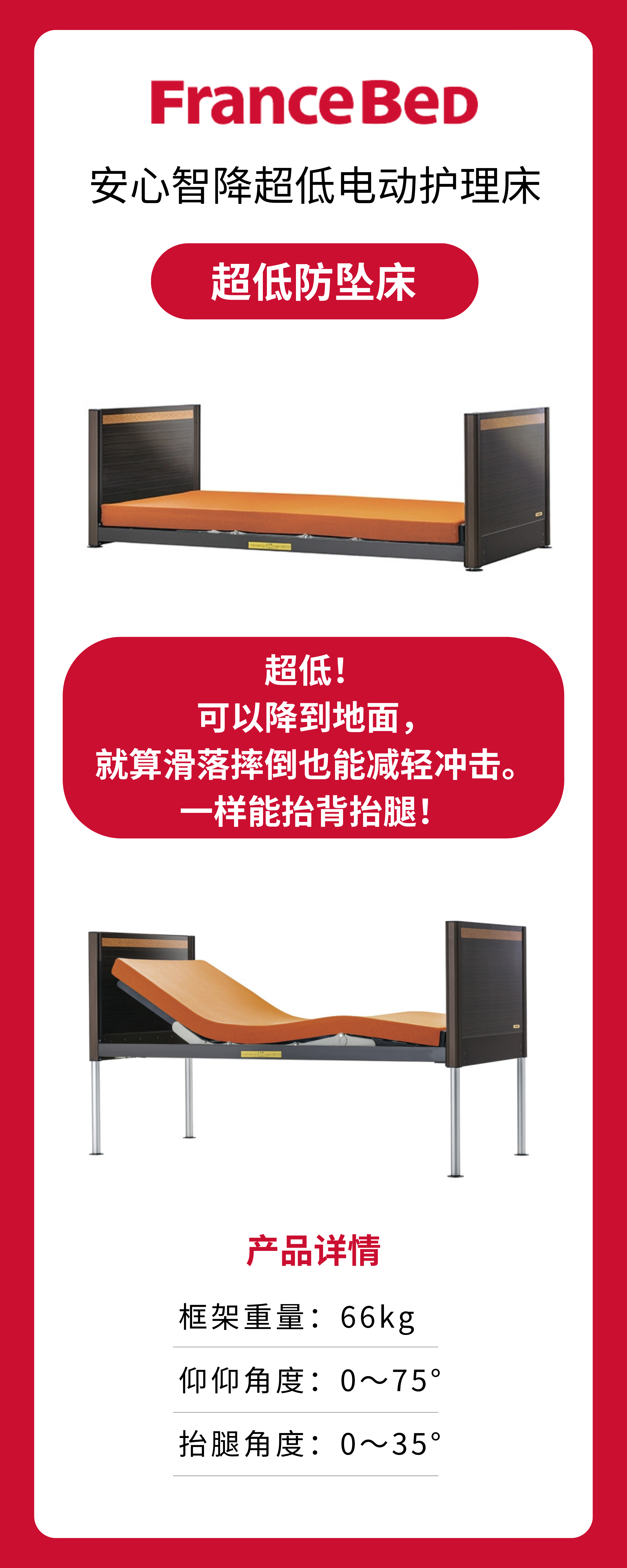 FranceBeD超低防坠床安心智降超低位电动护理床