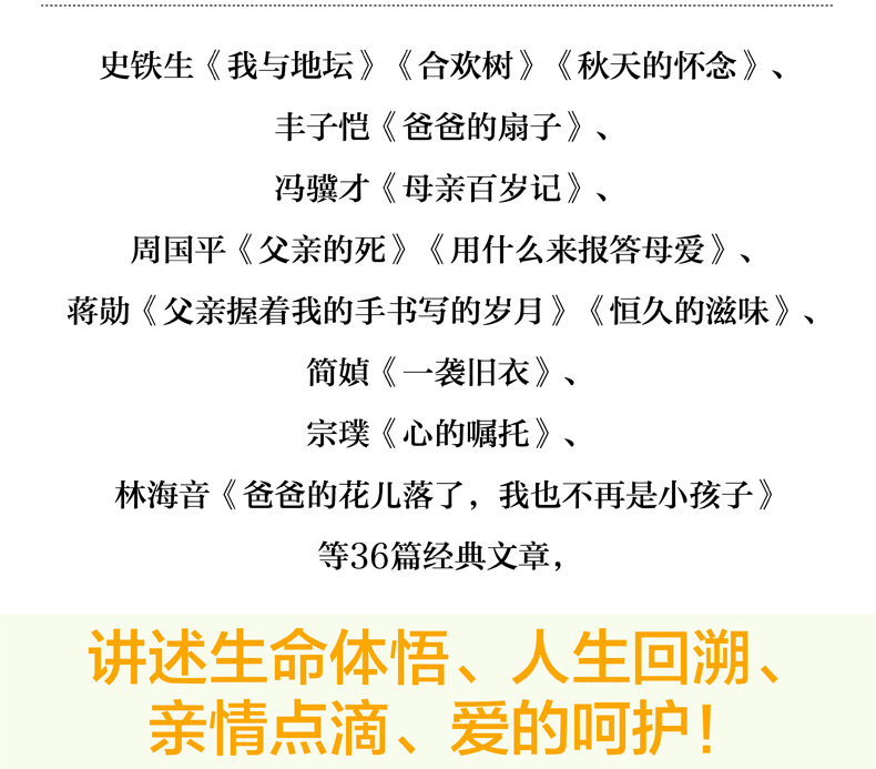 ★史铁生《我与地坛》《秋天的怀念》、丰子恺《爸爸的扇子》、冯骥才《母亲百岁记》、周国平《父亲的死》《用什么来报答母爱》、蒋勋《恒久的滋味》、简媜《一袭旧衣》等36篇经典文章,讲述生命体悟、人生回溯、亲情点滴、爱的呵护!