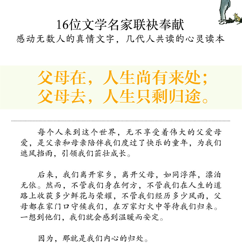 本书是一部以家和亲情为主题的名家散文合集,收录了沈从文、汪曾祺、梁实秋、丰子恺、茅盾、蒋勋、周国平、苏童、冯骥才、史铁生、宗璞等16位知名作家回忆父亲母亲、回顾成长经历的经典作品。