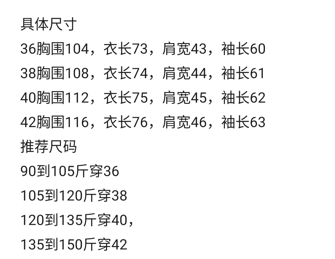 36胸围104,衣长73,肩宽43,袖长60