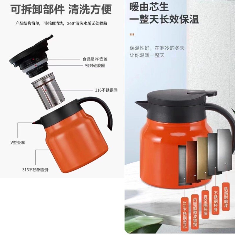 优质316不锈钢内胆,保证饮茶质量,将传统饮茶古法与现代技术结合,无须用电,24小时长效锁温,操作简单,一键按压出水顺畅。