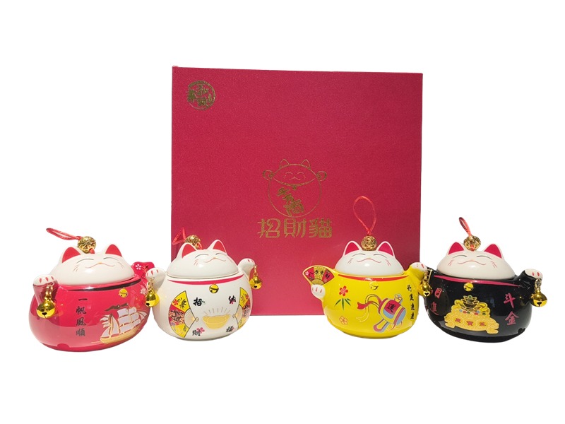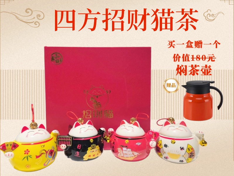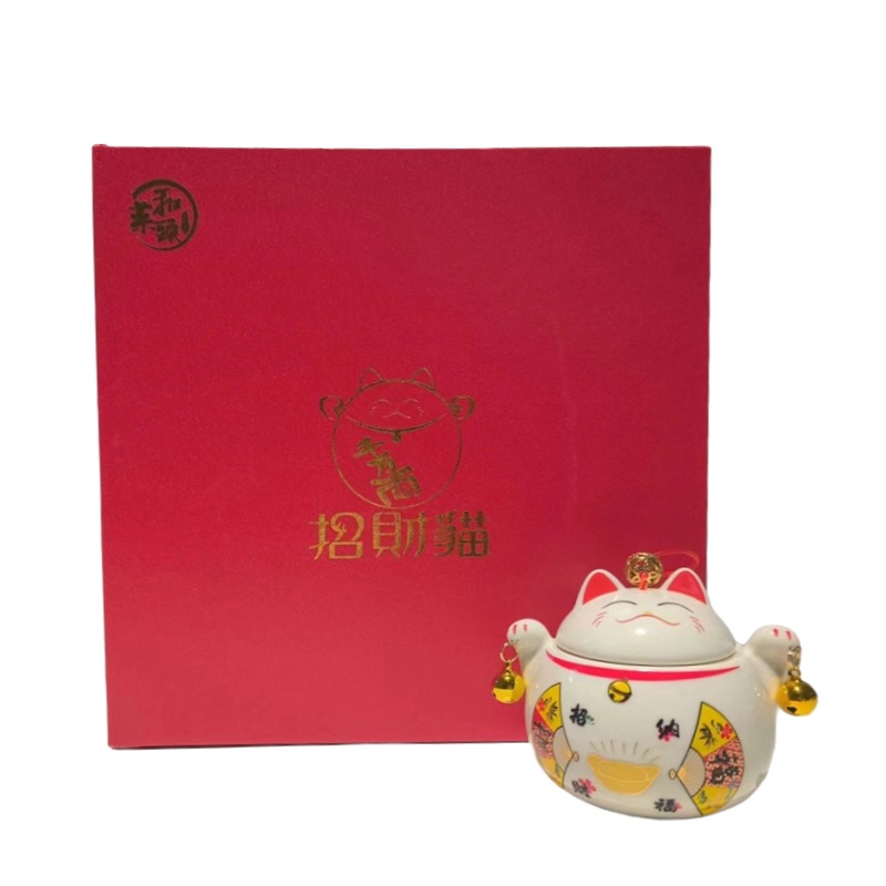 四方招财猫的茶罐符合有机食品瓷罐标准,有机食品大豆油墨的红色外盒,包裹茶饼的白色棉纸符合有机食品标准。