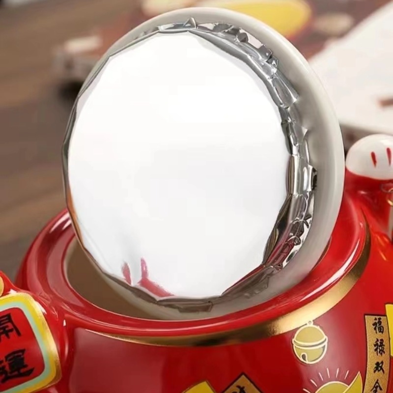 四方招财猫的罐盖用锡纸包裹,加强密闭性。