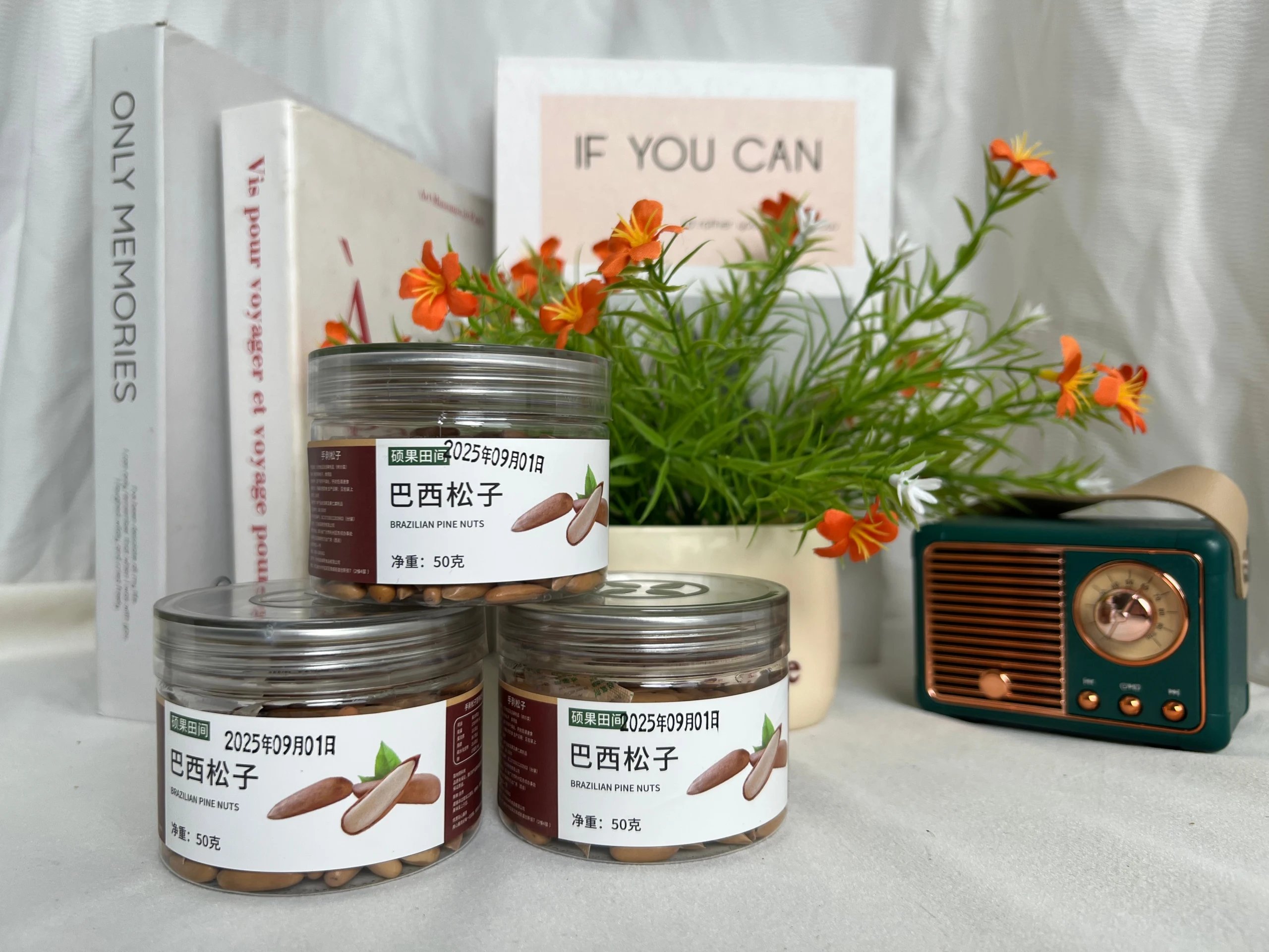 【品名】:2025头茬新货巴西手剥松子 【规格】:净重50g/罐 【生产日期】:zui新 【储藏方法】:阴凉干燥处密封保存 【保质期】:180天 【温馨提示】由于拍摄灯光原因,图片颜色存在些许误差,请以实际到货为准!! 【发货地】:浙江 【发货快递】:极兔,中通邮政等随机 【发货时间】:72小时发货 【不发货地区】:新疆、西藏不发;甘肃宁夏青海内蒙古加5 【售后标准】 不支持七天无理由退货,拦截拒收扣5元,错发漏发24小时内拍照反馈,不以个人口味售后 松子属于自然生长的农作物,在生长过程中会又部分坏果,虽然我们经过了人工和机器挑选,但是还是会有部分坏籽,一罐里面5颗坏果左右属于正常,不在售后范围内介意者勿拍。巴西松子尖部变色并不一定表示已经坏掉,这是由于巴西松子在成熟过程中,尖部会自然变色,而且经过了炒制,高温下也会引起部分变色。介意者慎拍