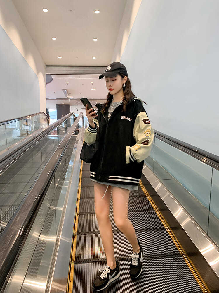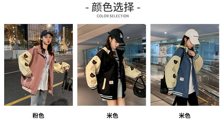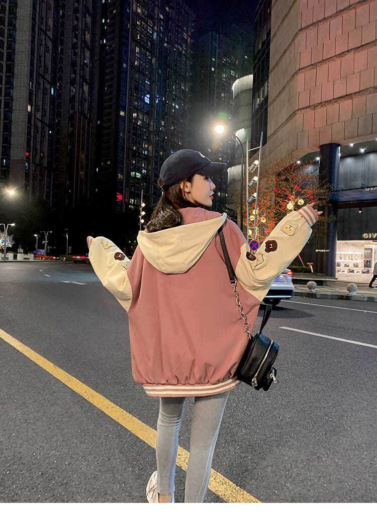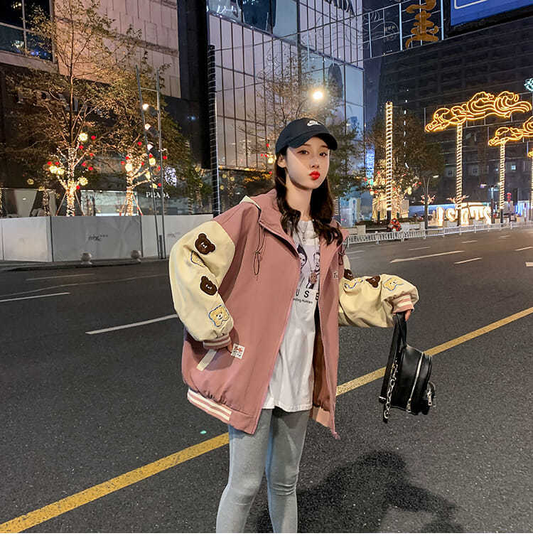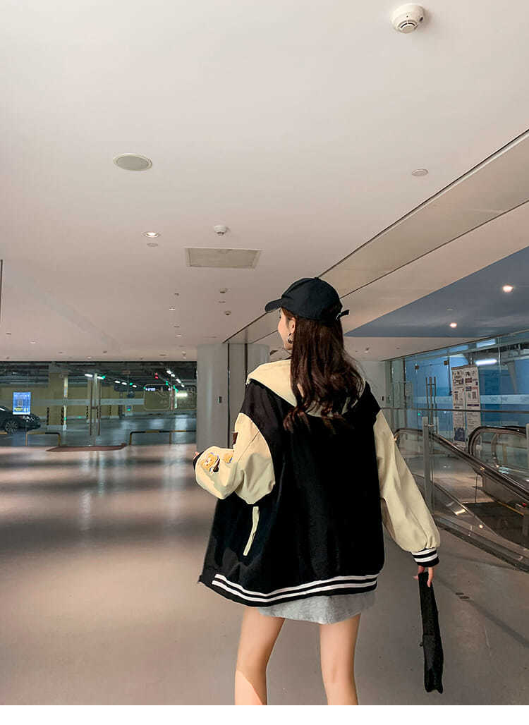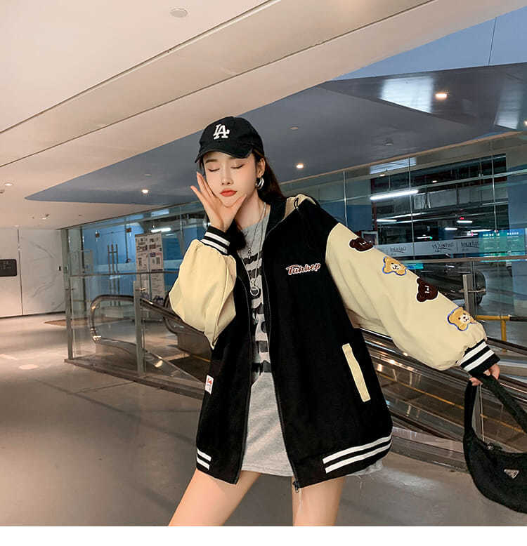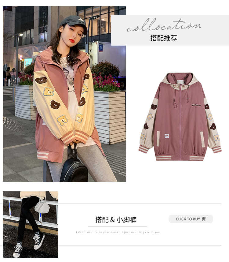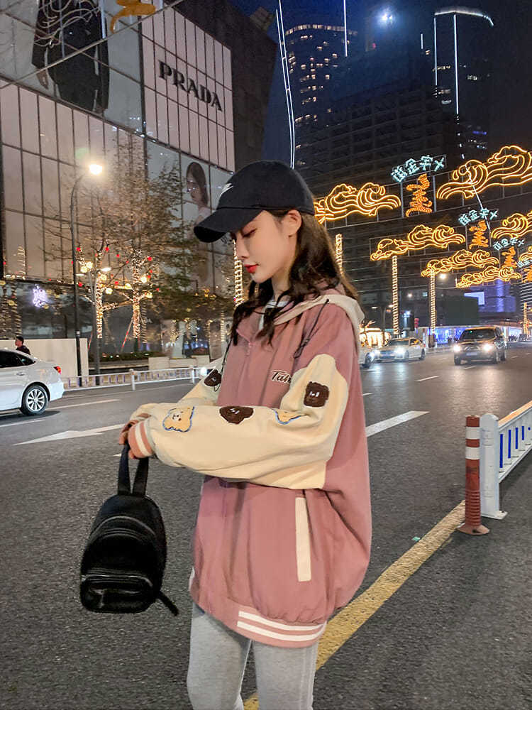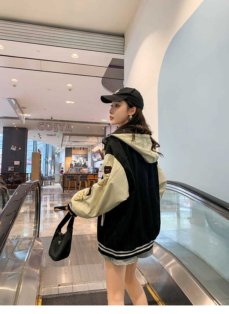 外套女春秋百搭薄款2021新款韩版宽松学生可爱小熊情侣拼色棒球服