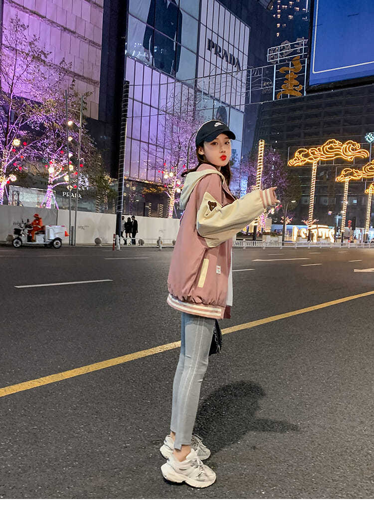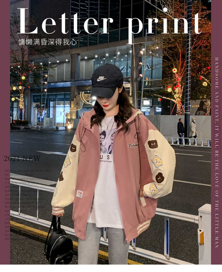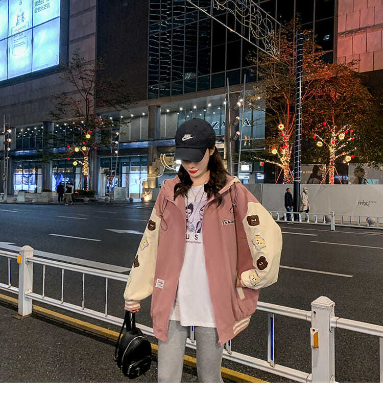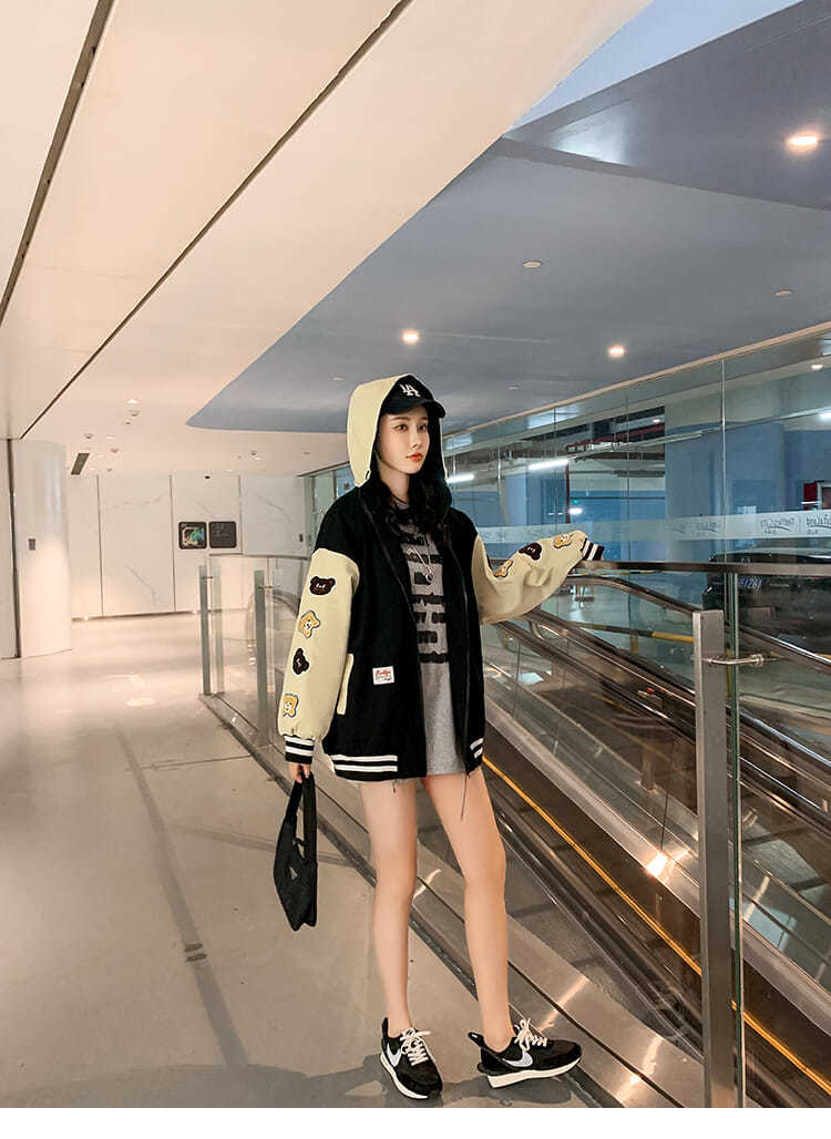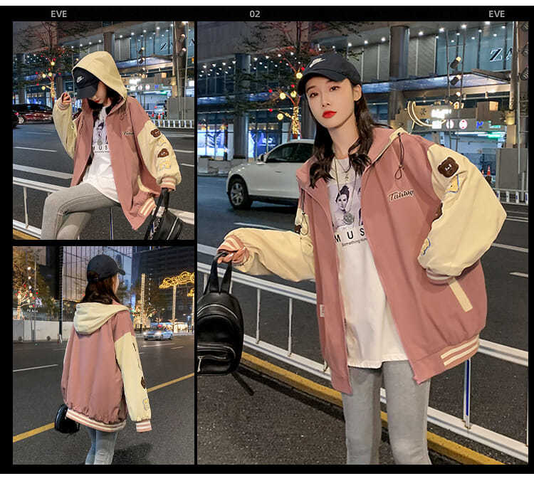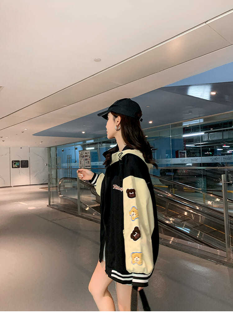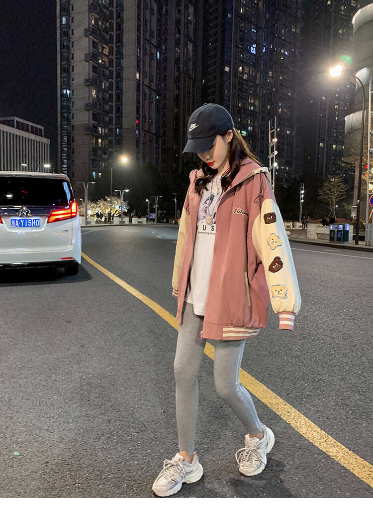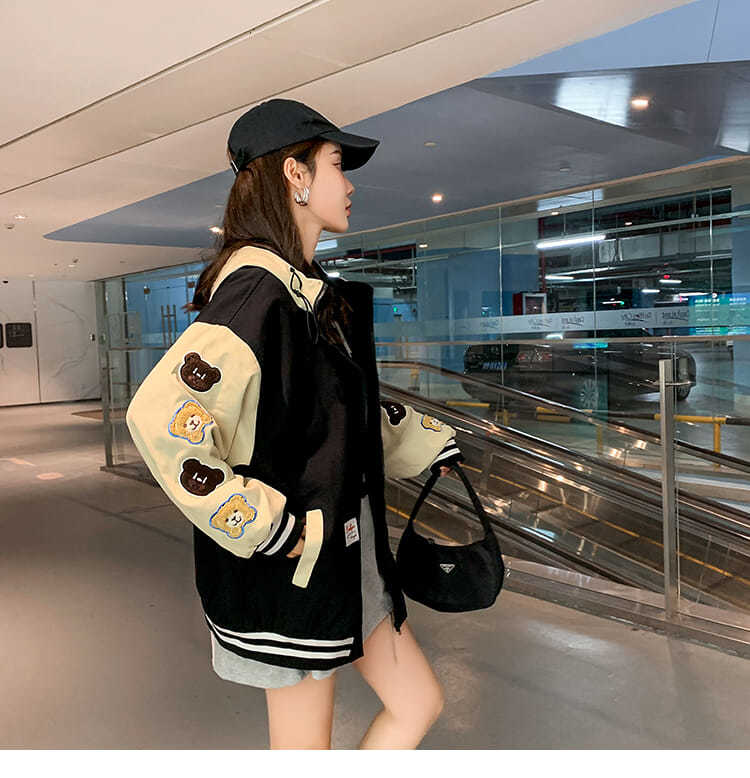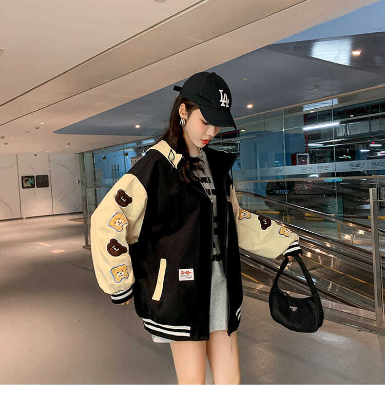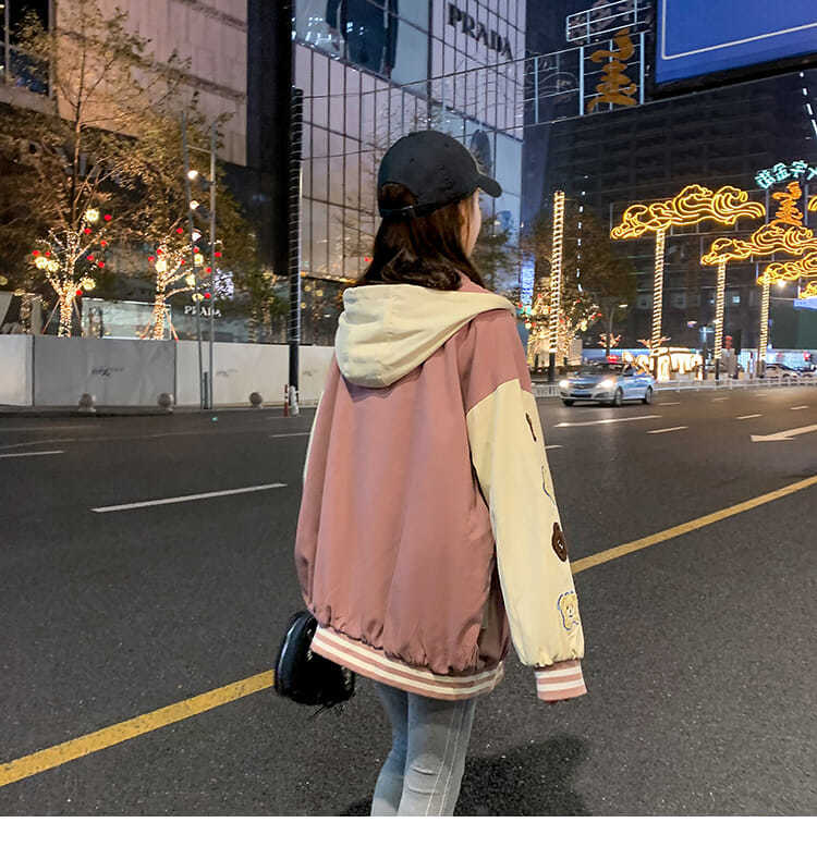外套女春秋百搭薄款2021新款韩版宽松学生可爱小熊情侣拼色棒球服