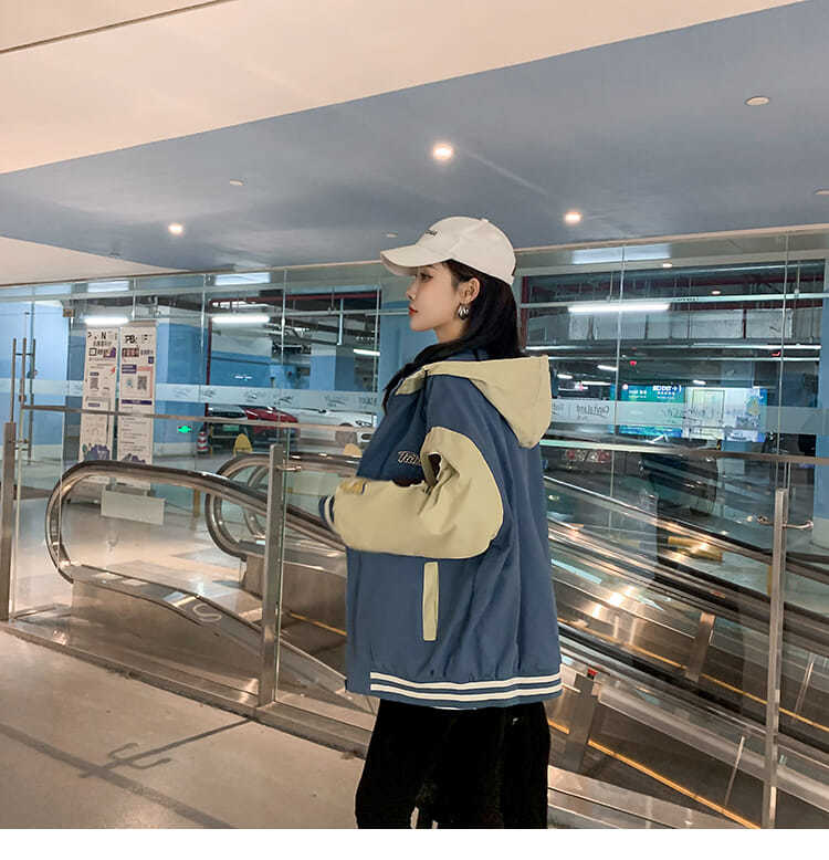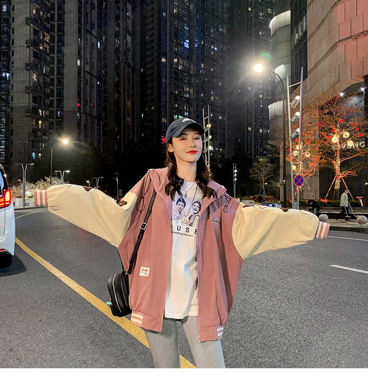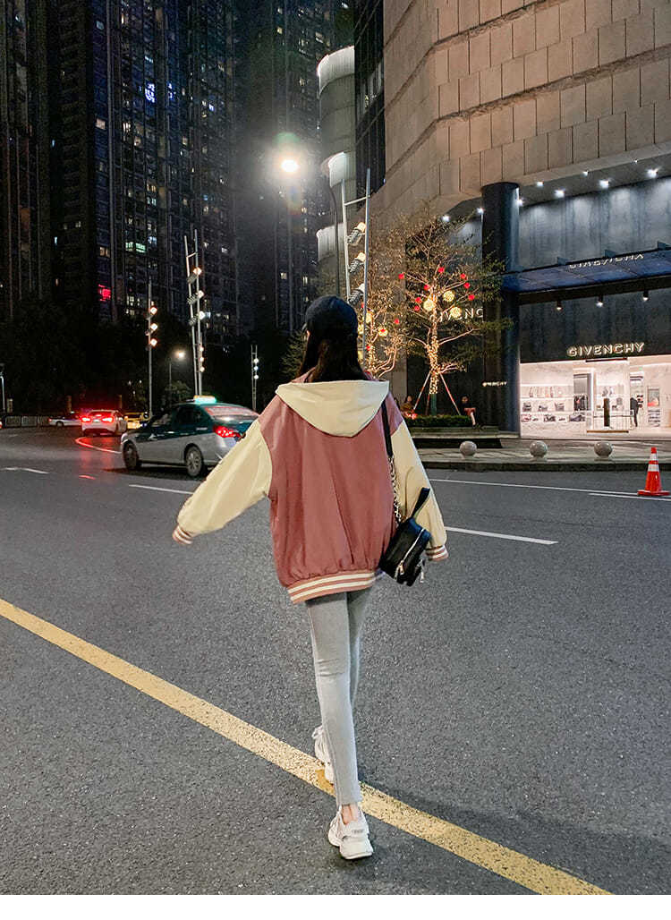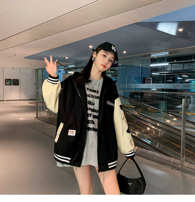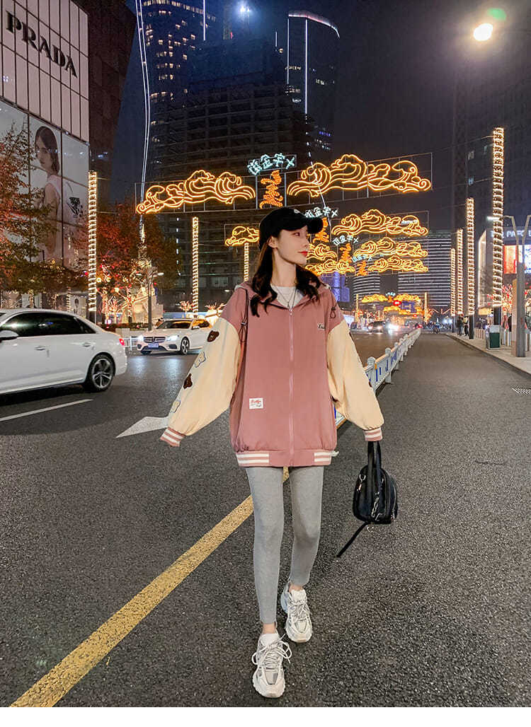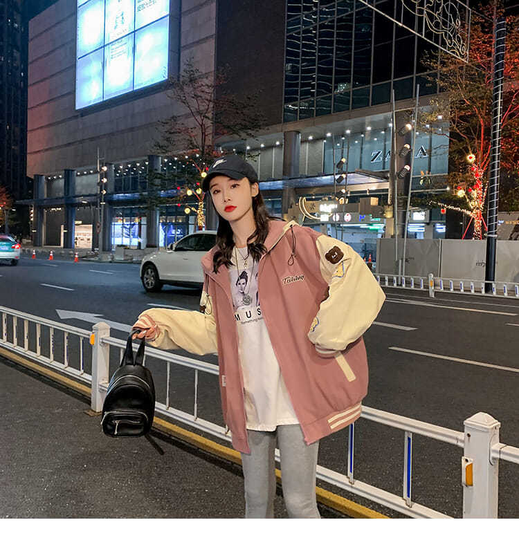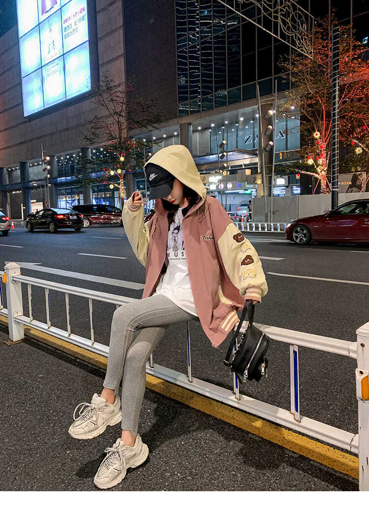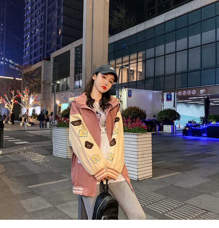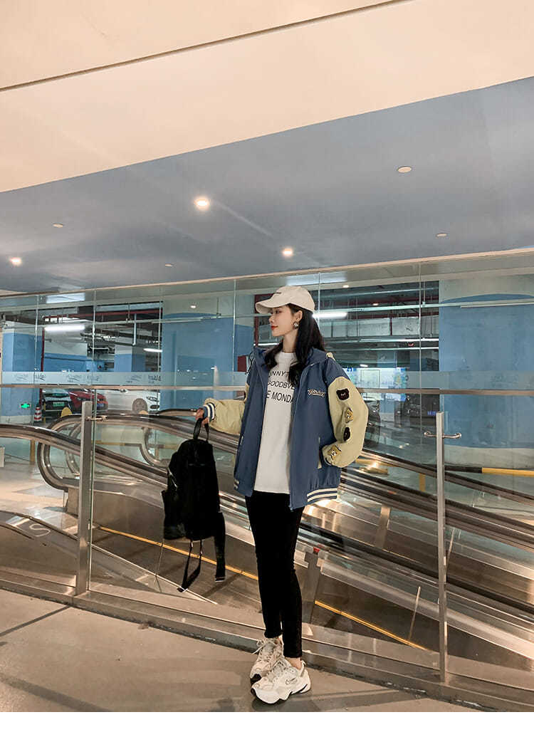 外套女春秋百搭薄款2021新款韩版宽松学生可爱小熊情侣拼色棒球服