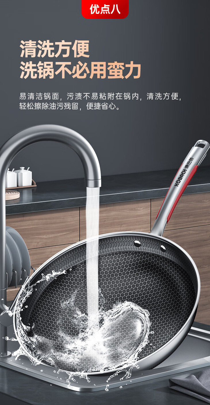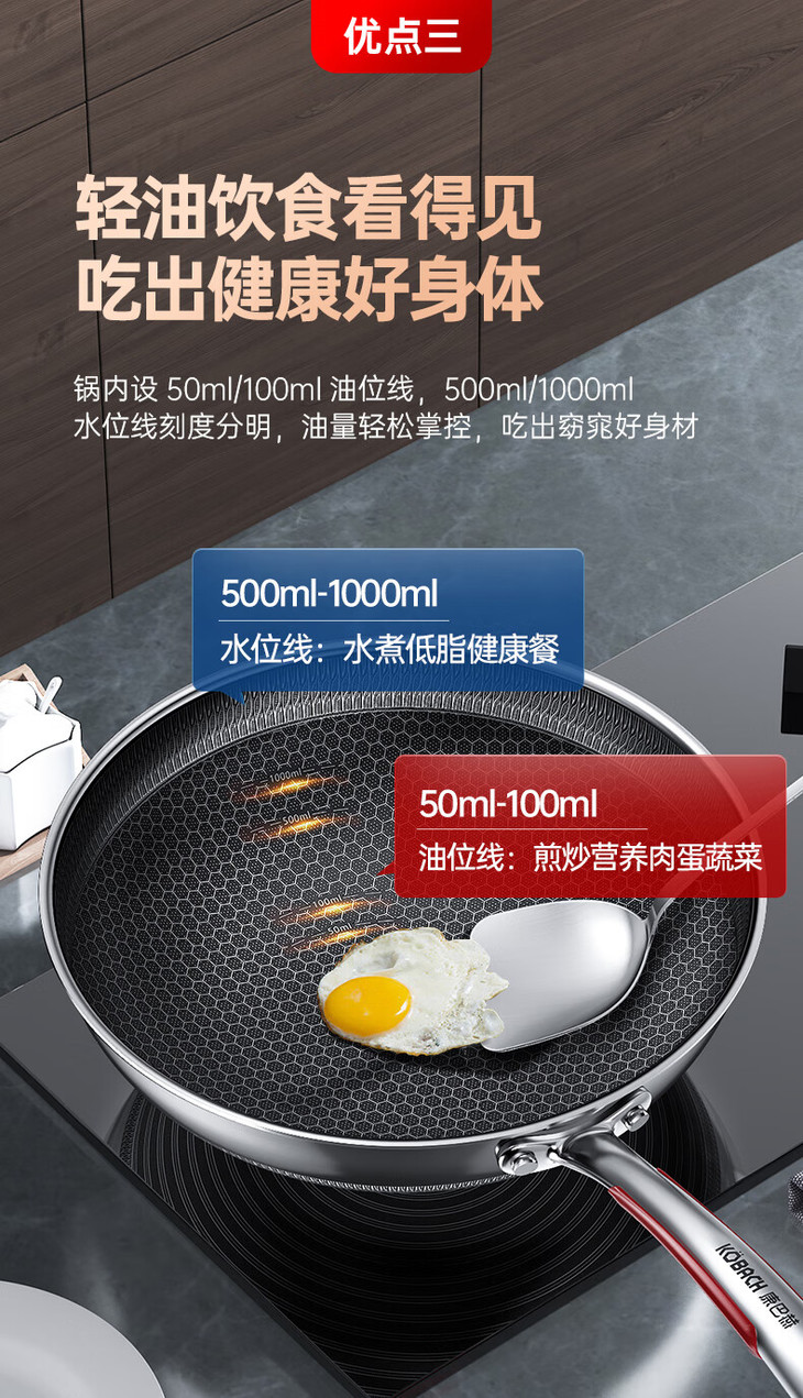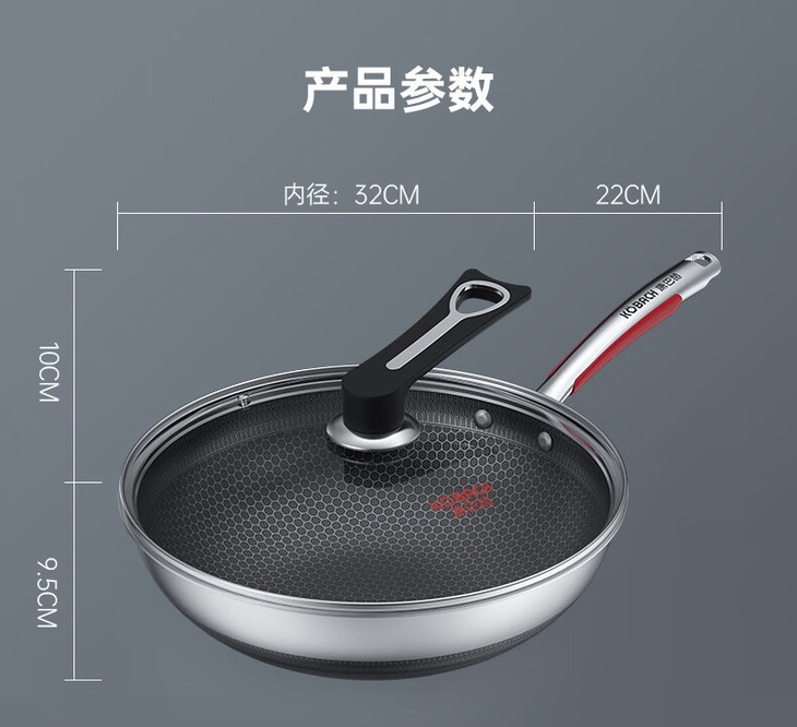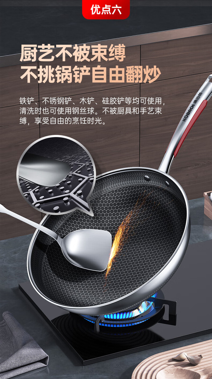 康巴赫-悦享双面屏304不锈钢炒锅32cm-LPB-C32Y(双面屏) 燃气天然气电磁炉通用 可立锅盖 适用3-4人