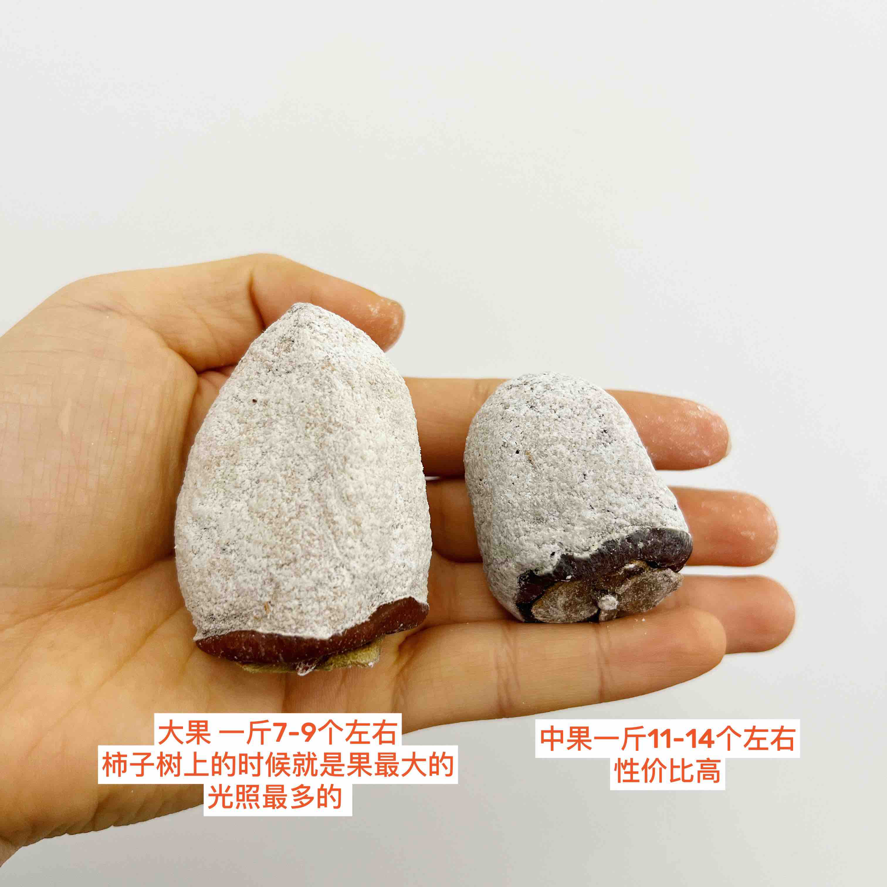 柿饼销售大致分为前、中、后三个阶段,前期柿饼水分较多,口感软糯,颜色偏红,柿霜较少,随着天气越来越冷,柿霜增多增厚,整个柿饼越来越白,口感也逐渐变得有嚼劲,水分越来越少,颜色变成深褐色(焦糖色),不同时间口感有差异,这是正常的!后期柿饼霜多!
