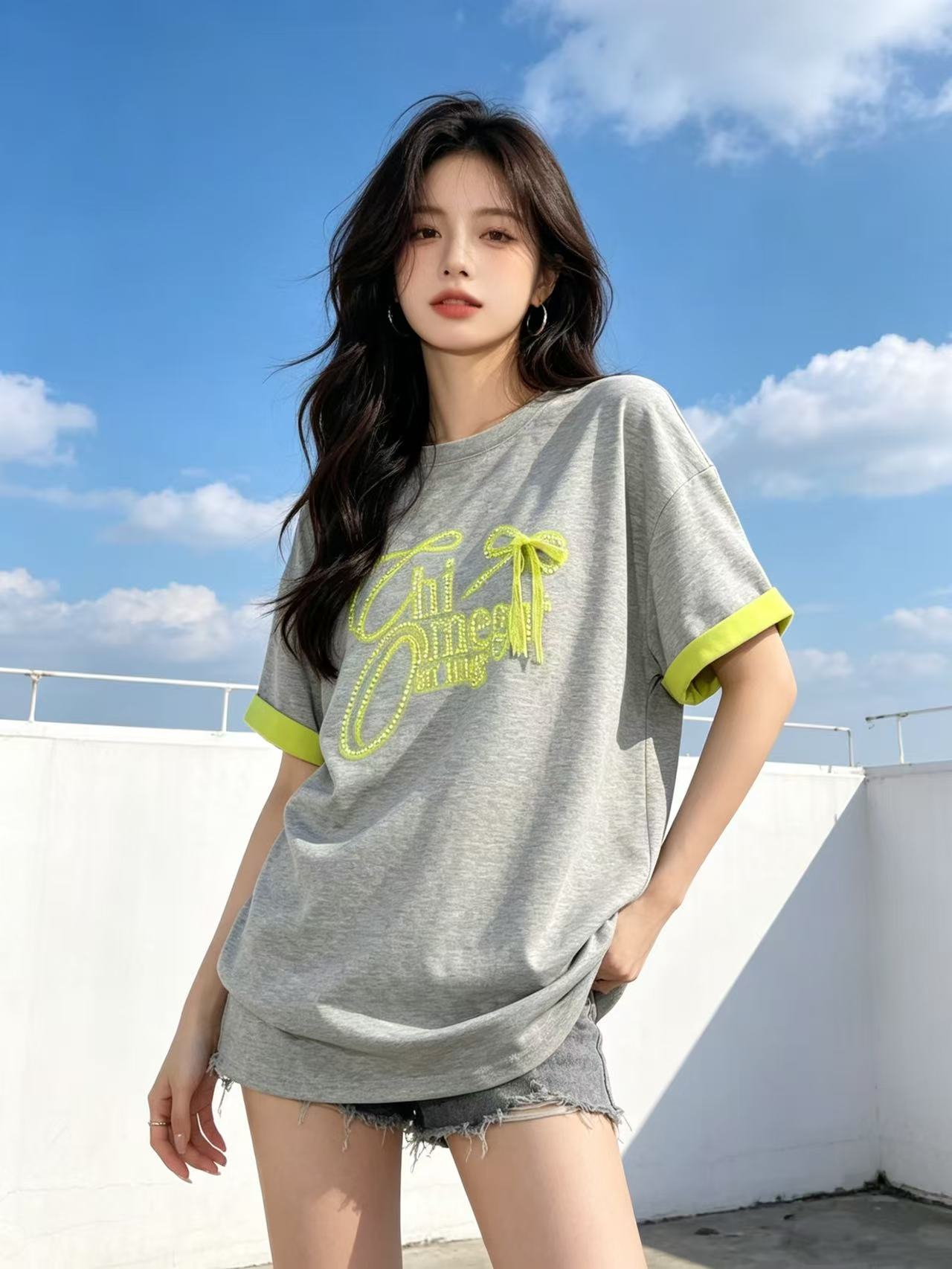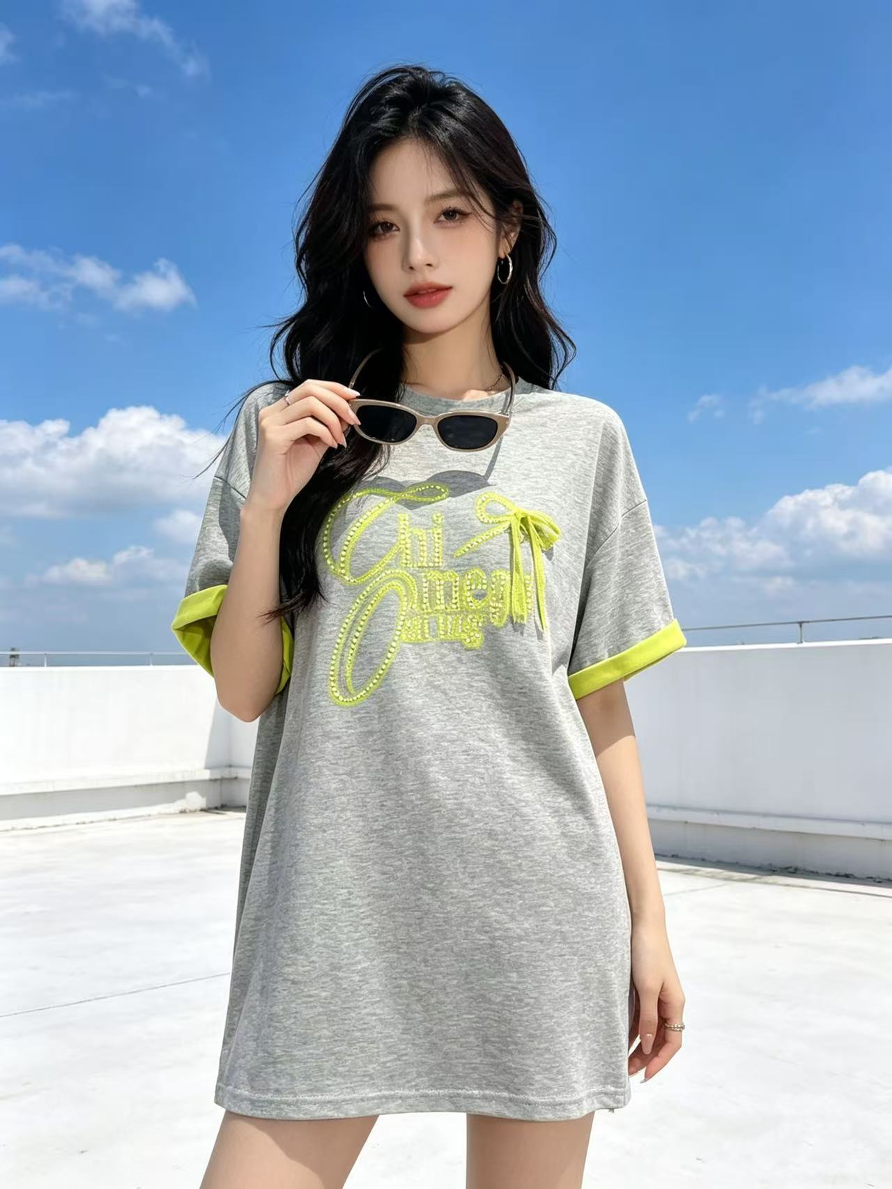 大版【自营】工艺/重工!重工烫钻➕拼色➕蕾丝蝴蝶结!潮牌宽松设计感中长短袖T恤-喜出