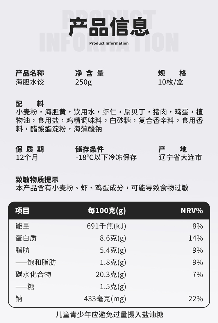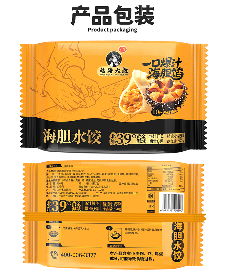 品名:大连海胆水饺 规格:10枚250g/袋*5袋;拍几份发几个包裹,不一定能同时到达,请耐心等待; 发货地/产地:大连 包装方式:泡沫箱+冰袋+袋装 物流信息:默认顺丰/京东冷链,不支持指定快递 发货区域:新疆,西藏,甘肃,青海,广西,贵州,海南,湖南,云南、四川、重庆、广东不发; 物流详情:周六、周日及节假日除外,正常12小时内发货,到货时间约为2~5天,请耐心等待 售后说明:收到货后有质量问题,在24小时内都可以拍照(坏品+快递单面箱子一起拍)上传,申请按坏品比例理赔或联系客服,生鲜食品性质特殊,不支持7天无理由退换货;因地址错误,手机号联系不上,未及时签收,拒收等造成的损失无法售后,请理解; |