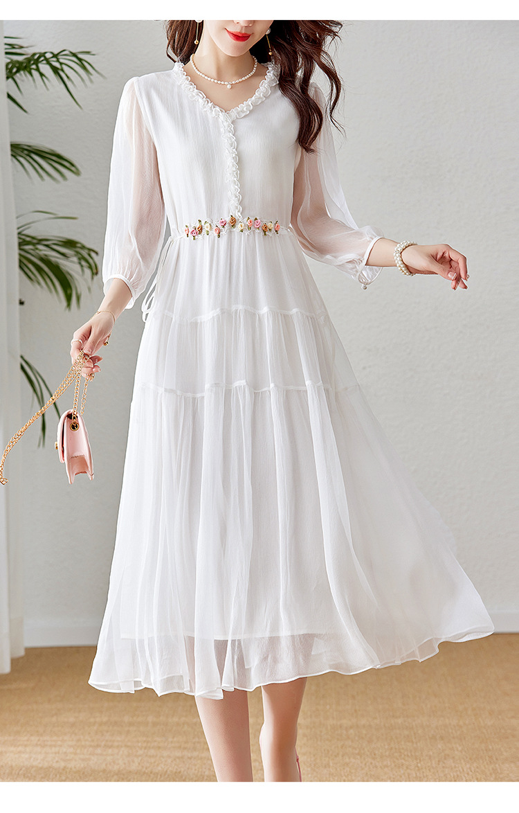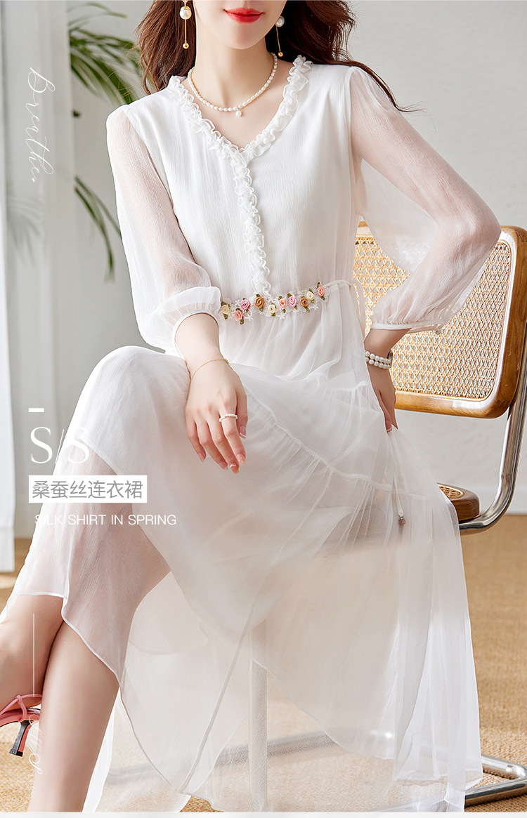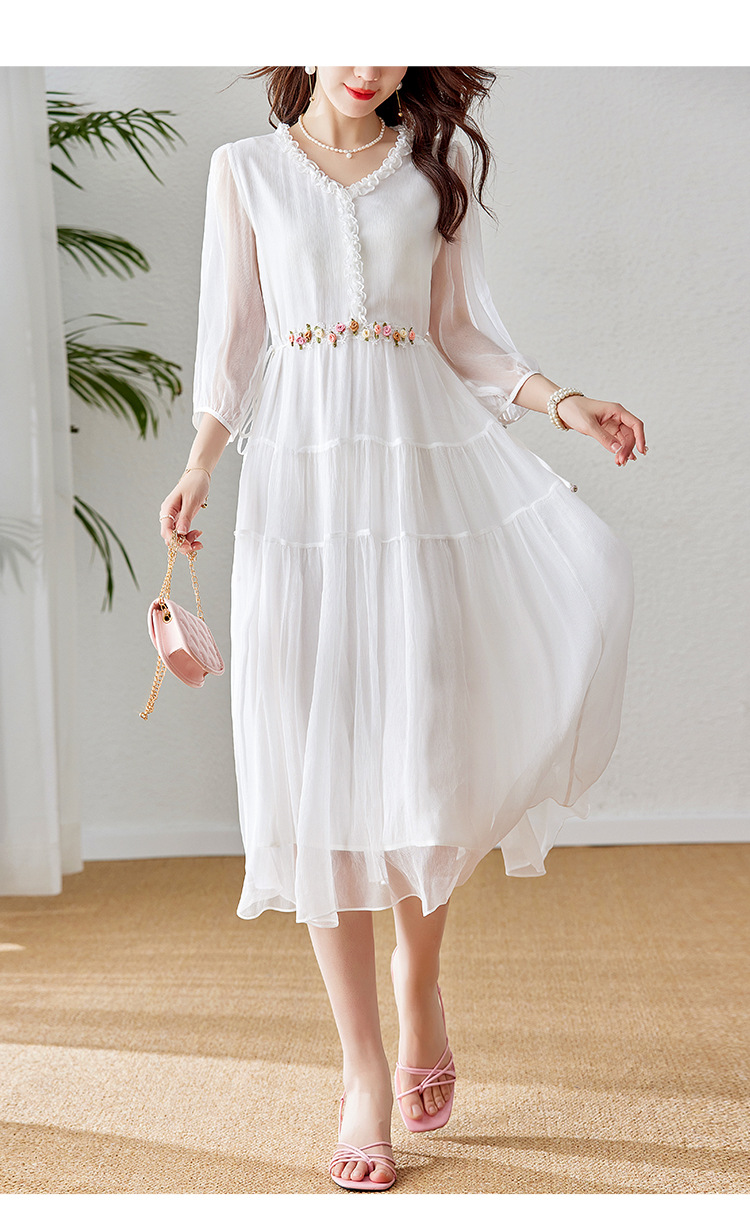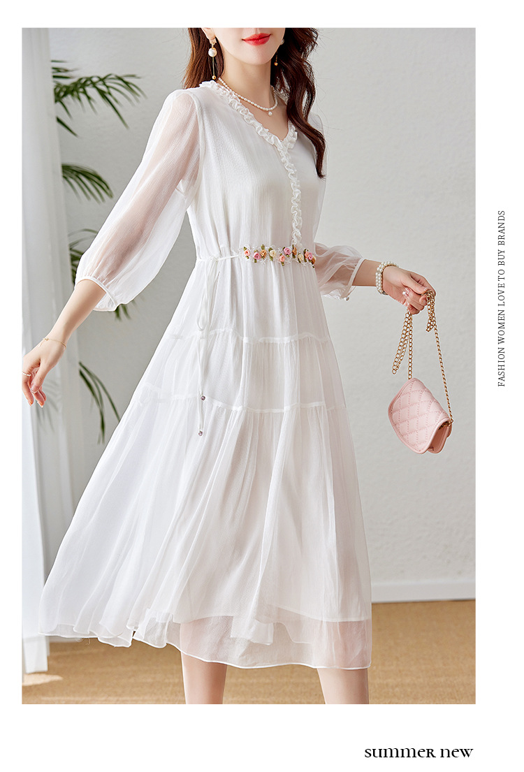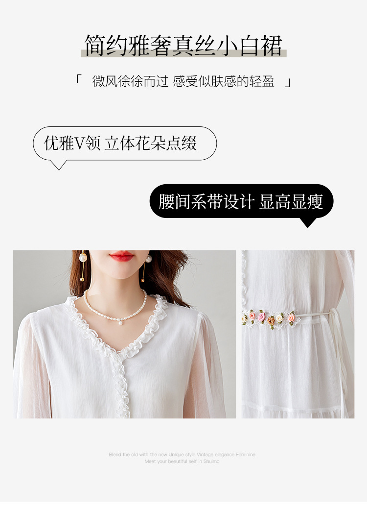 七分袖V领抽绳收腰,白色桑蚕丝真丝连衣裙SM-82393516