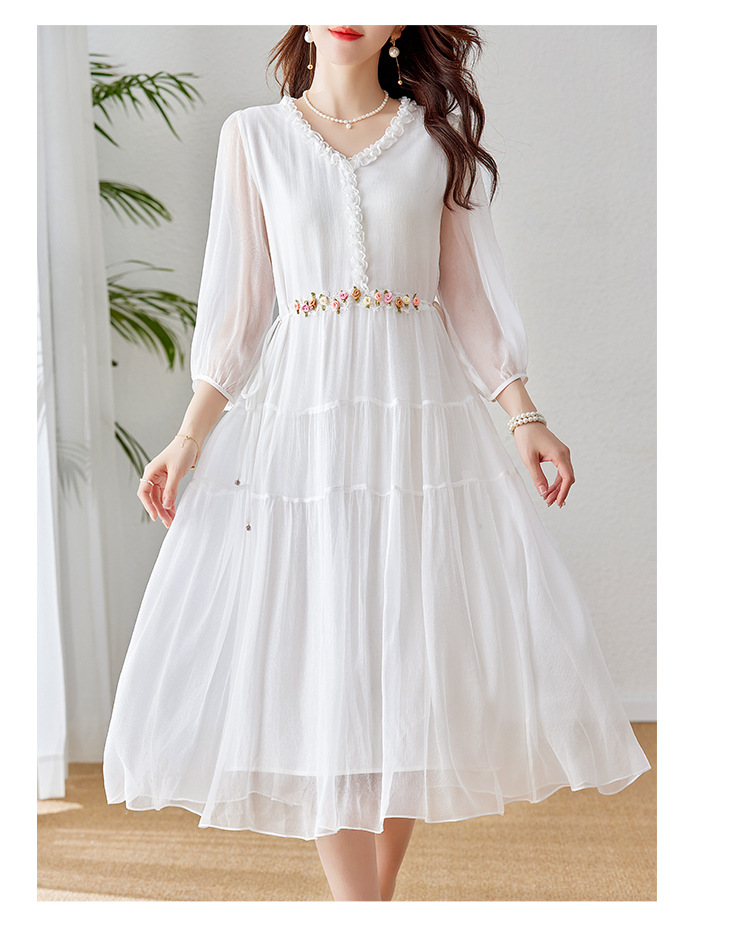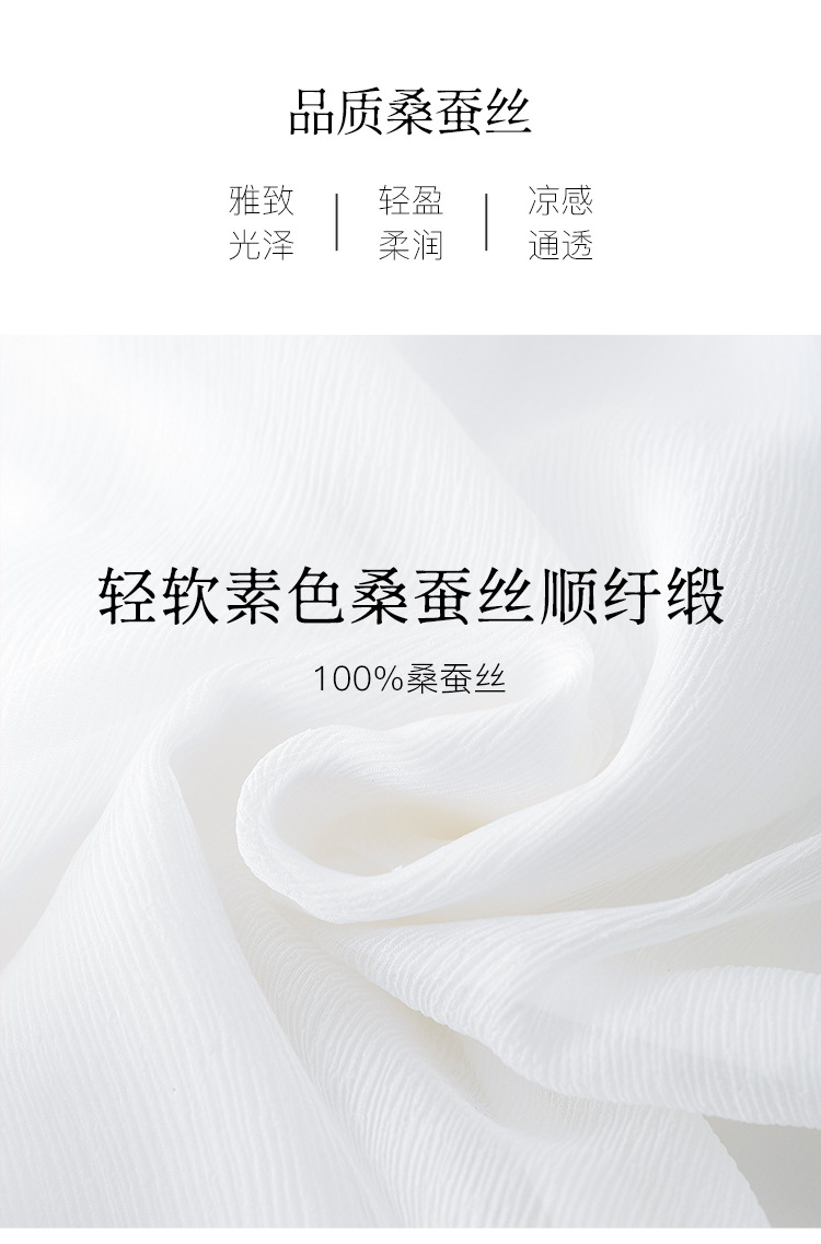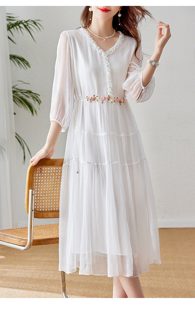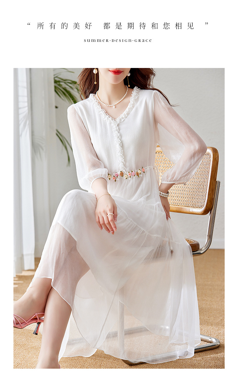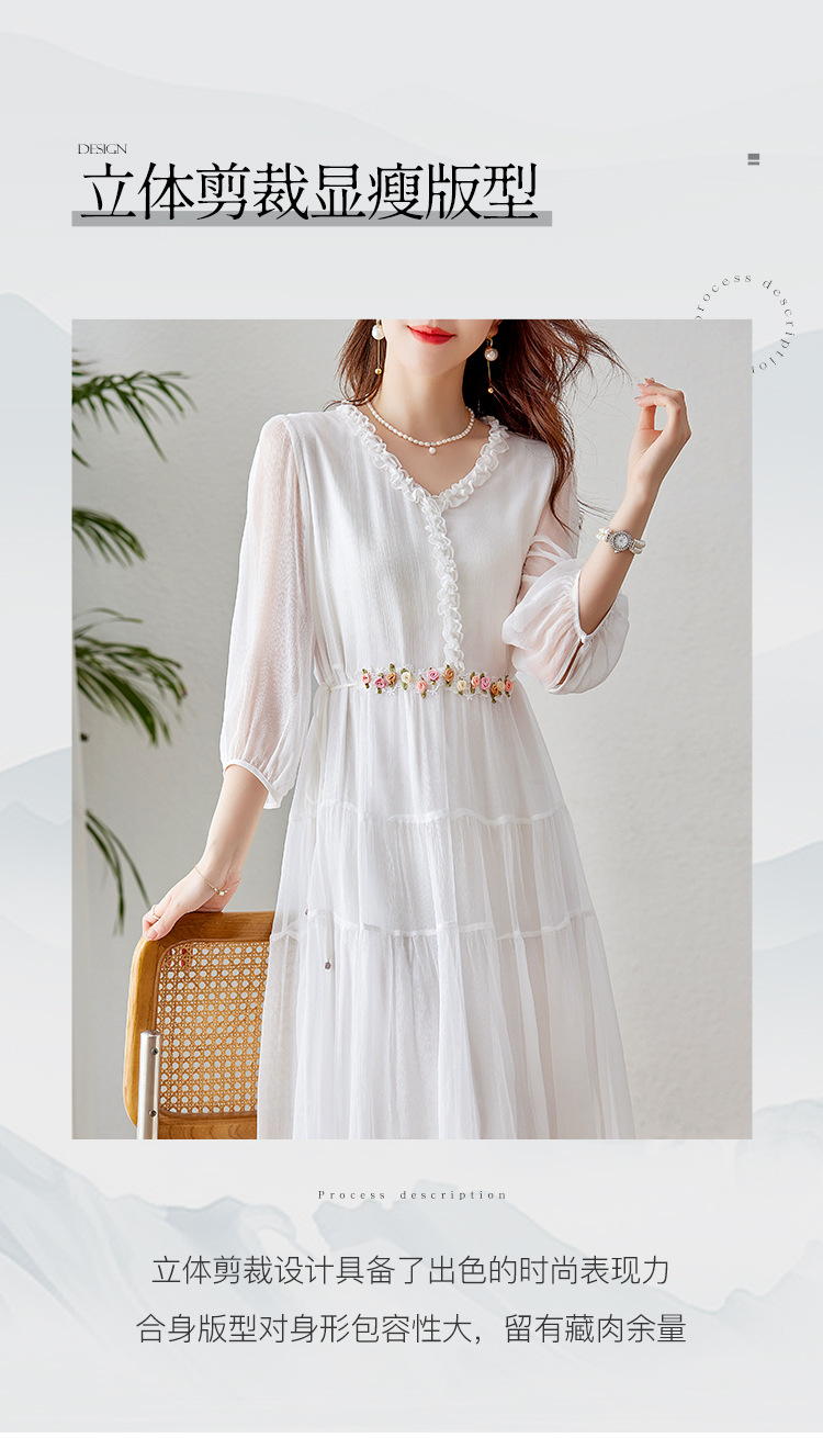 七分袖V领抽绳收腰,白色桑蚕丝真丝连衣裙SM-82393516