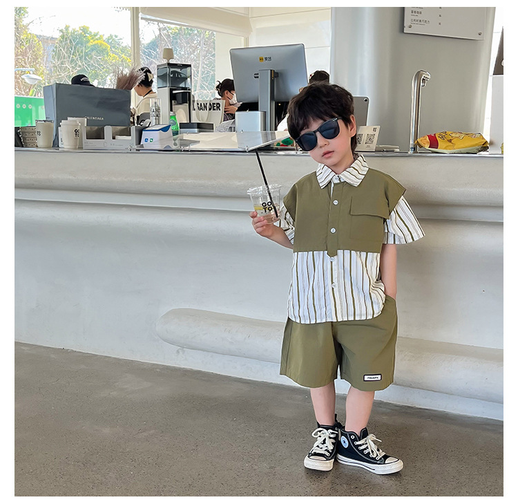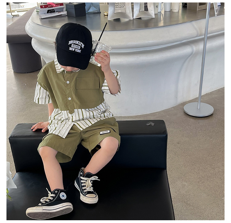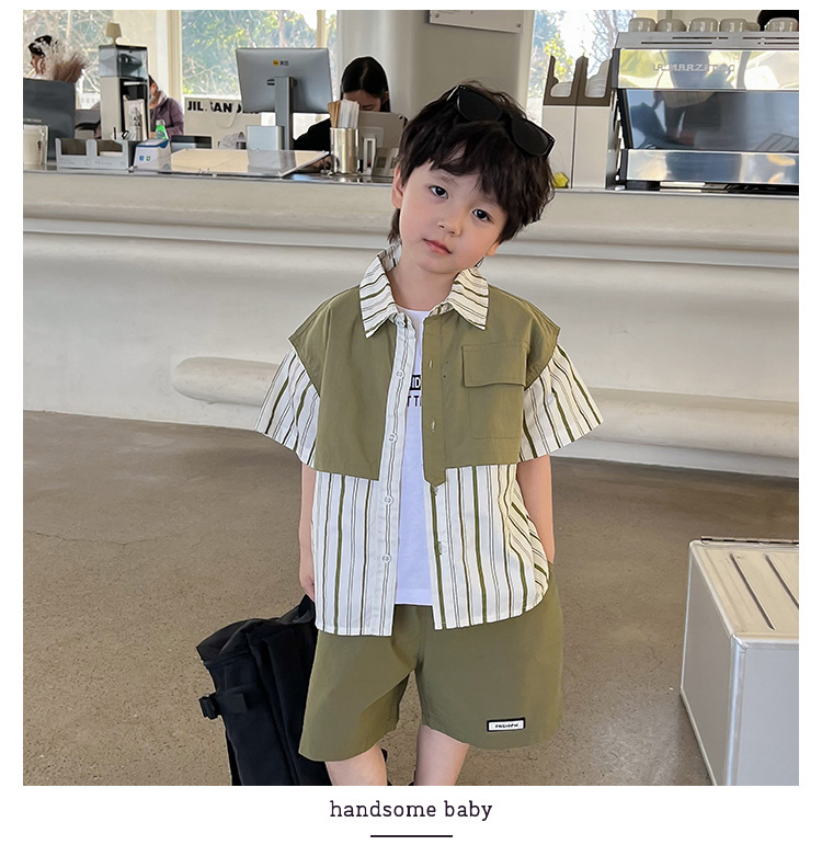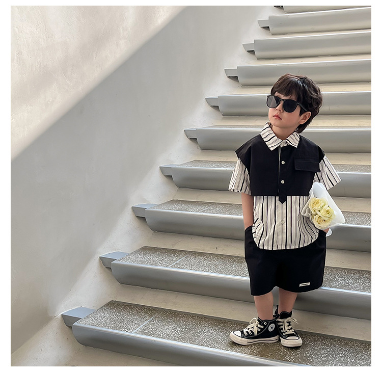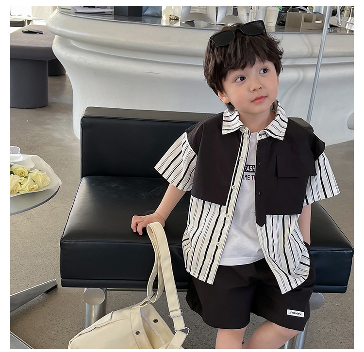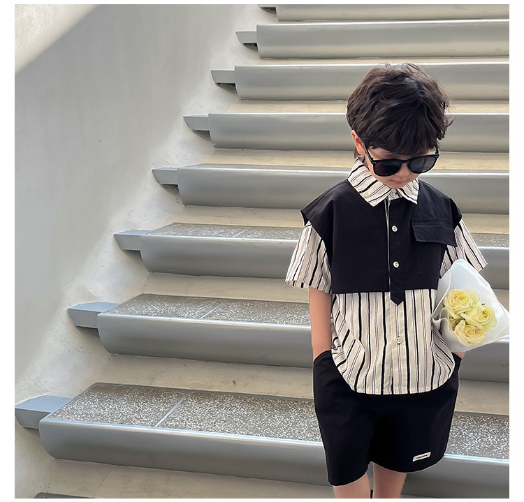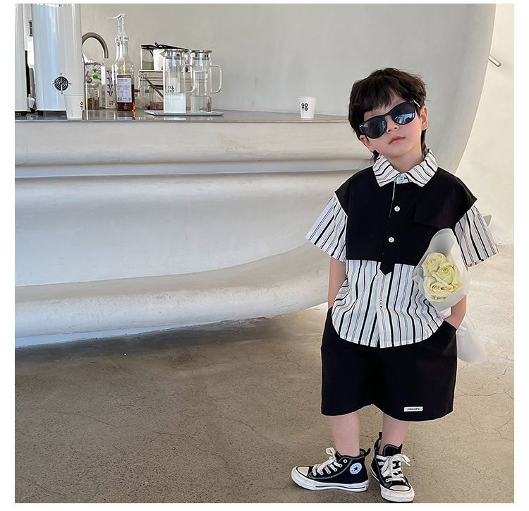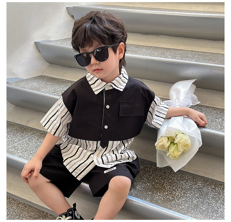 【假两件衬衫套装炸街单品】儿童套装2023童酷夏季韩版洋气男童两件套,翻领设计修饰颈部线条,拼片设计增加时尚感,可盐可酷条纹拼片宝宝衬衫短裤潮sh