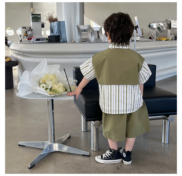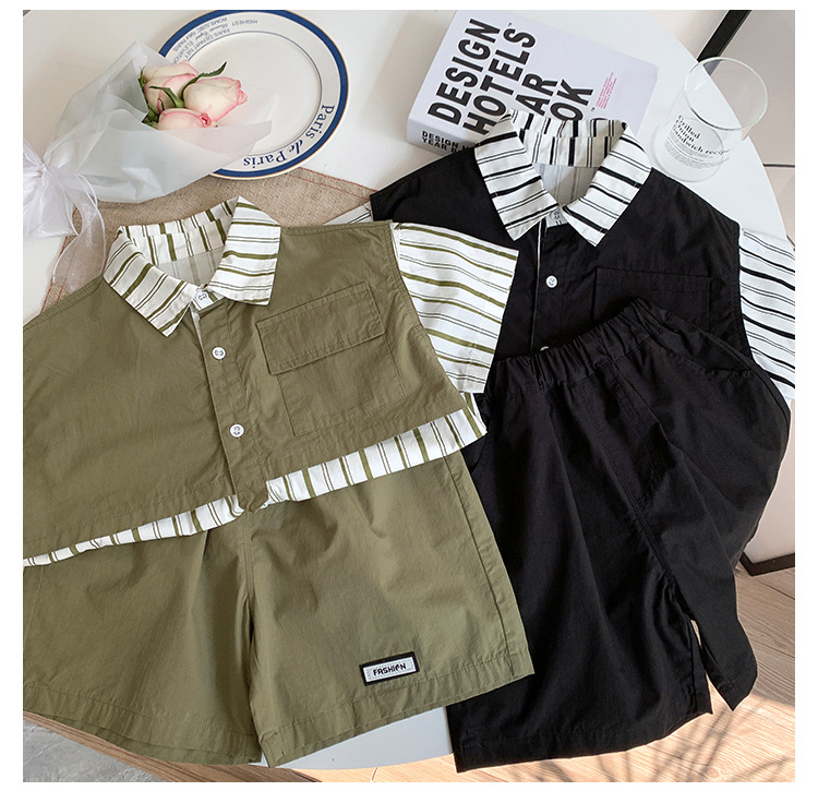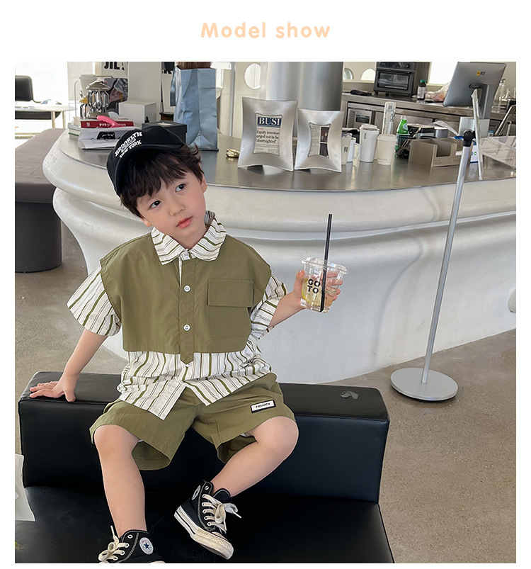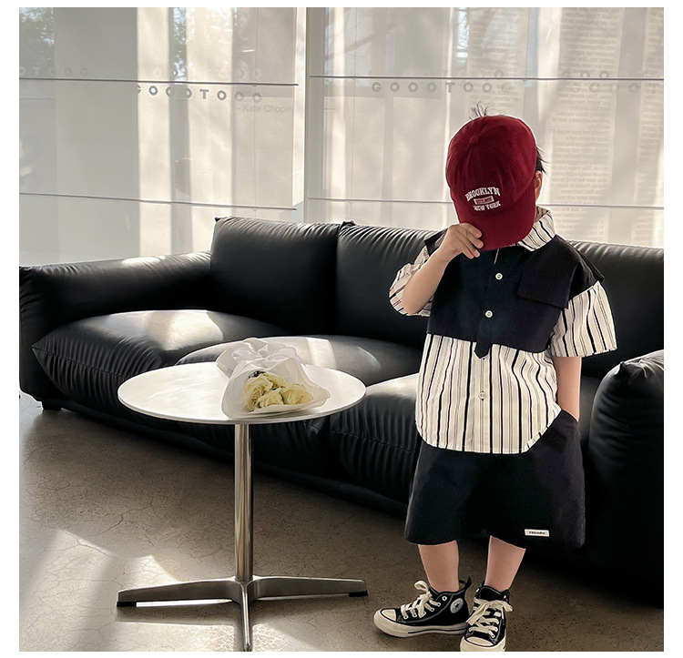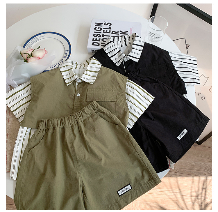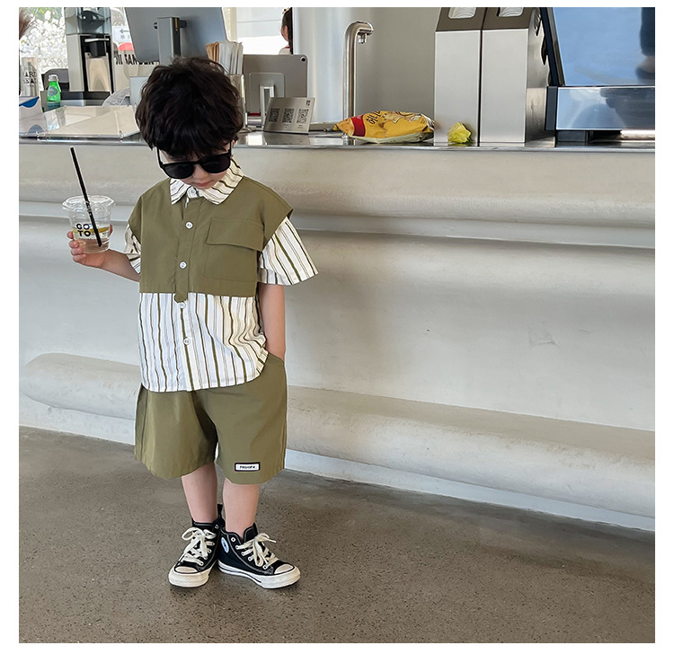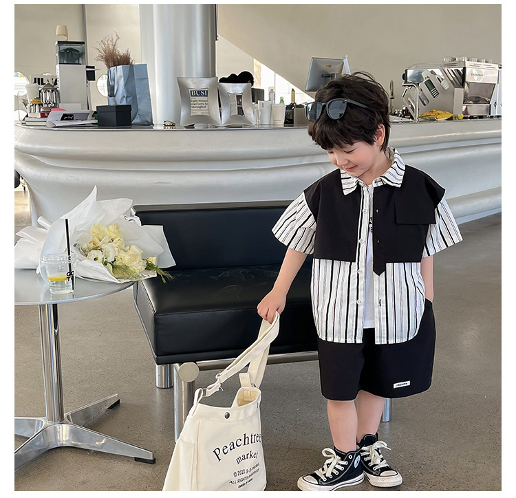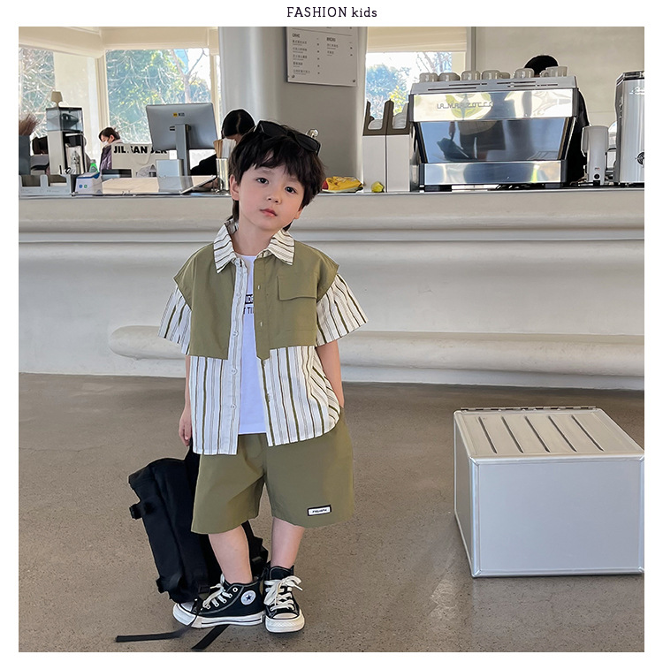 【假两件衬衫套装炸街单品】儿童套装2023童酷夏季韩版洋气男童两件套,翻领设计修饰颈部线条,拼片设计增加时尚感,可盐可酷条纹拼片宝宝衬衫短裤潮sh