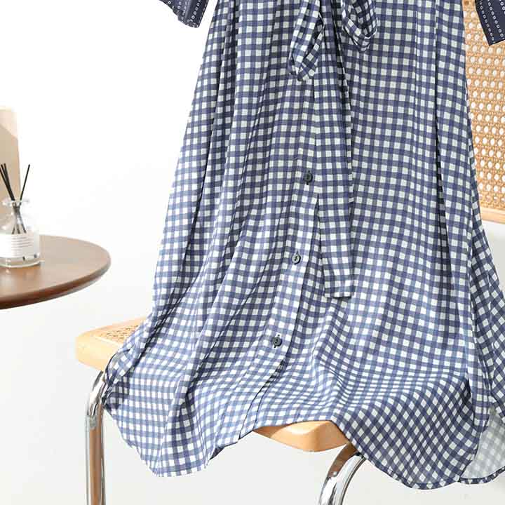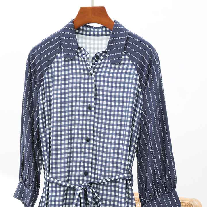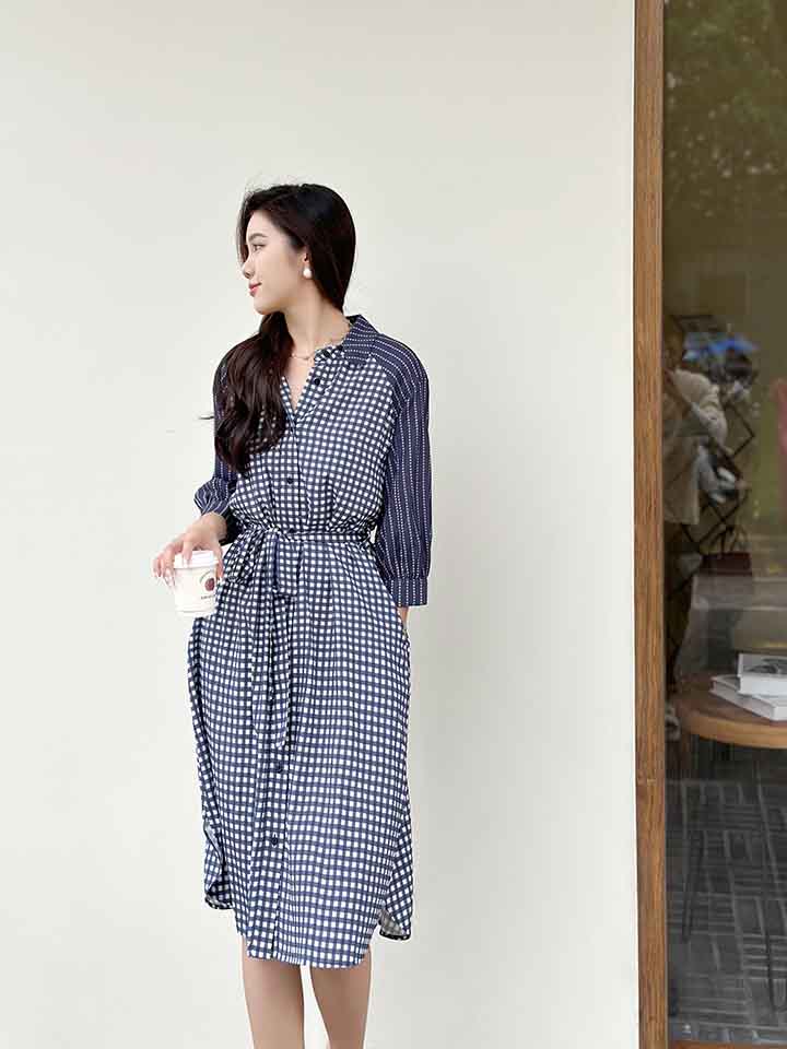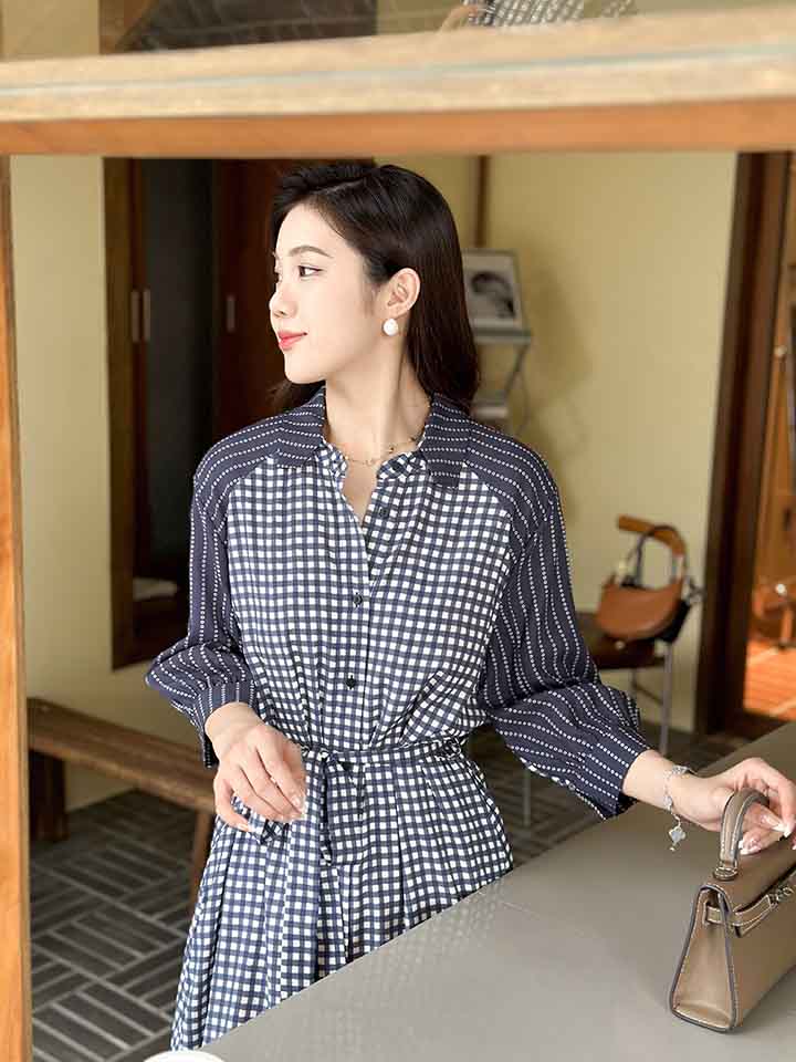 顺丰包邮洛诗琳12923春季新款知性优雅真丝缎格纹拼接连衣裙762
