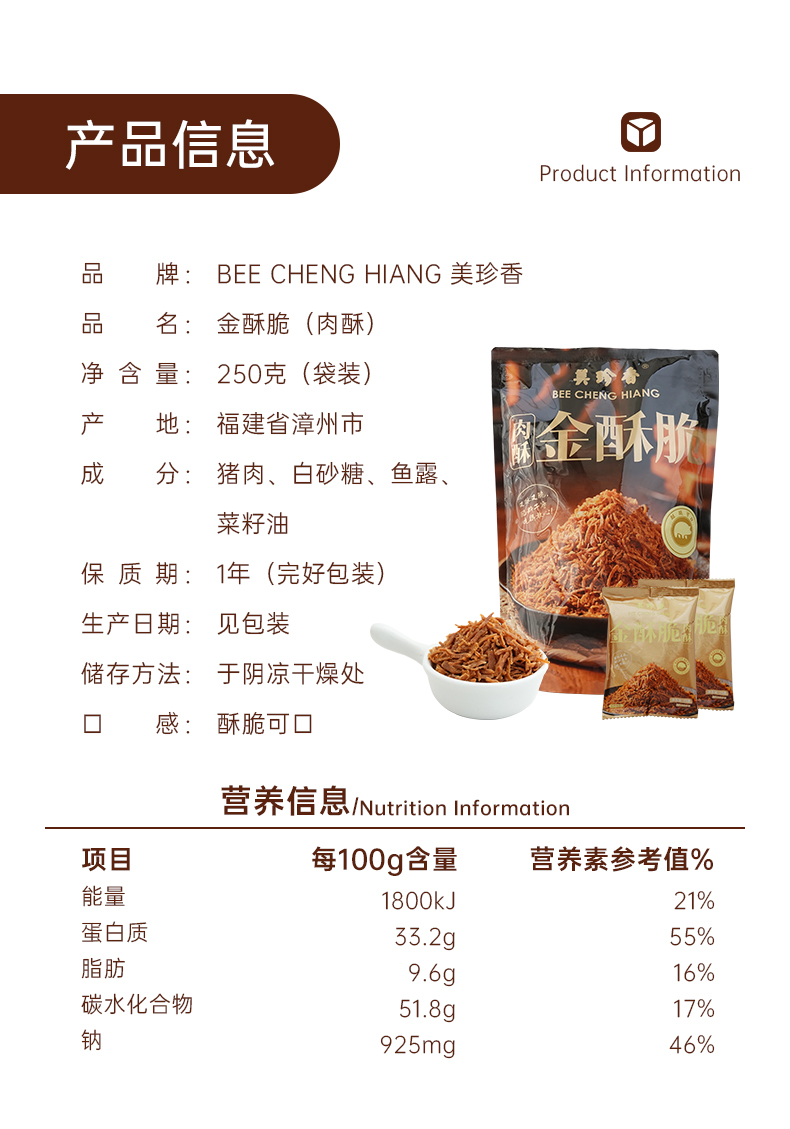 美珍香金酥脆(肉酥)250g酥脆可口熟肉制品内含独立小包装新加坡