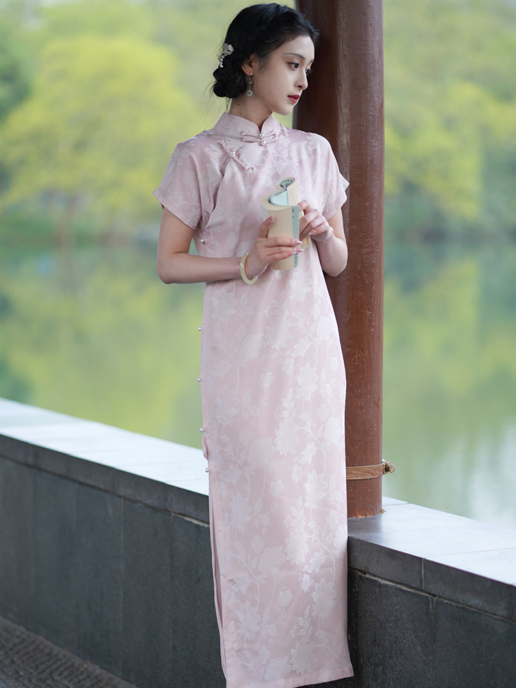 LSBB3901全开襟一片式粉色人丝提花旗袍2025年夏季复古国风曳地年轻款少女 商品图0