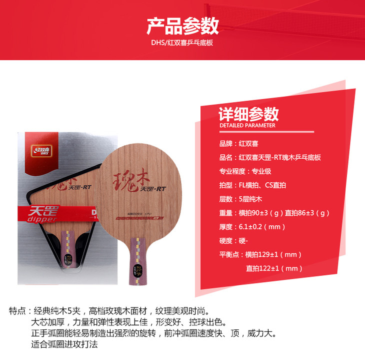 DHS红双喜天罡瑰木乒乓球拍底板专业5层纯木进攻型乒乓底板
