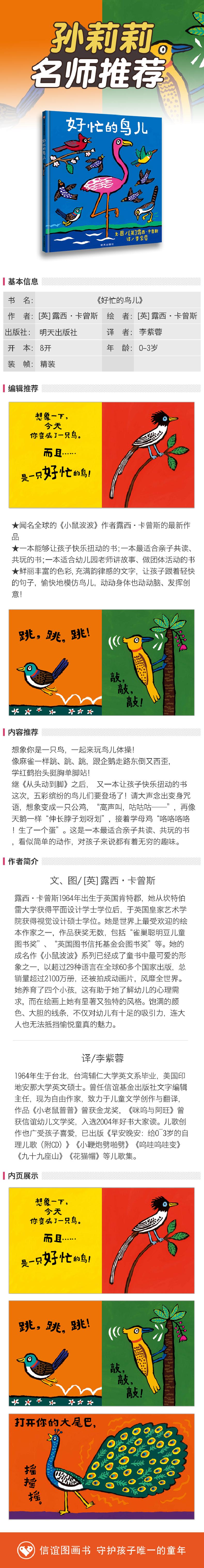 这本关于鸟儿的图画书,里面有色彩鲜艳美丽的小鸟图案,还有许多有趣的指令。这是一本热闹、充满互动、非常漂亮的图书,非常适合和小孩一起阅读。——英国《卫报》
