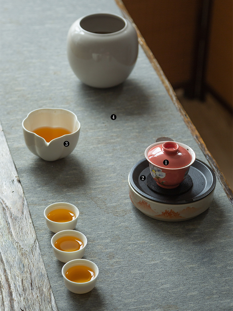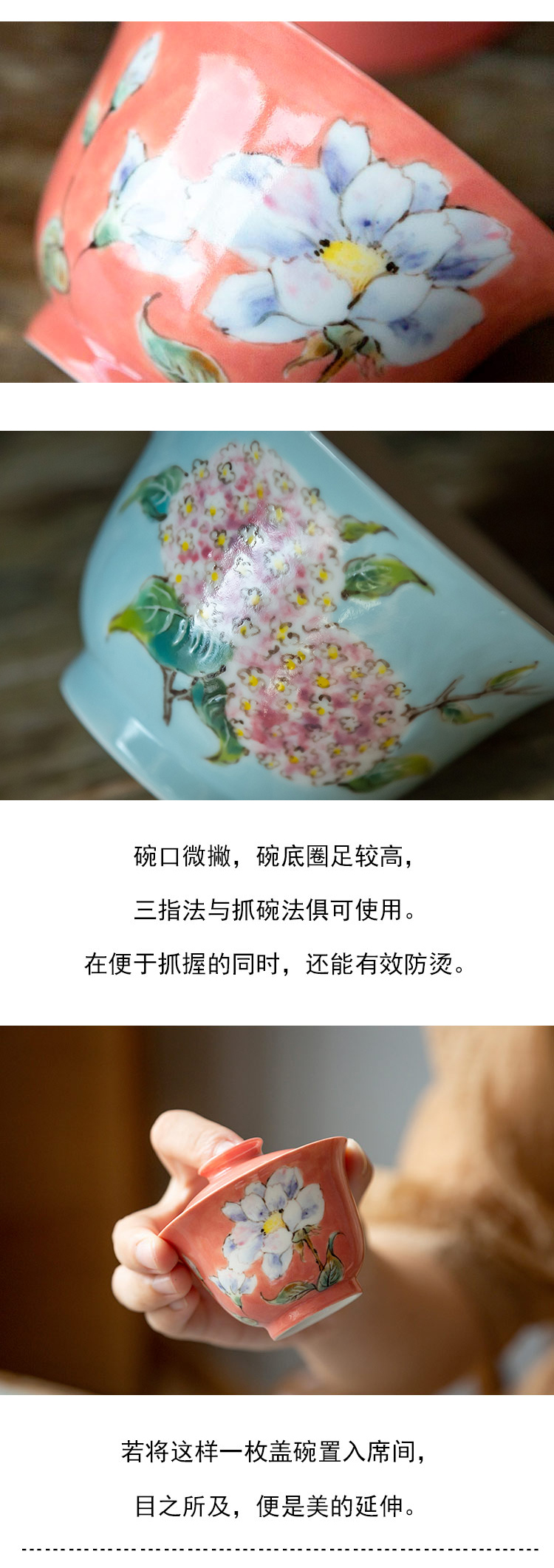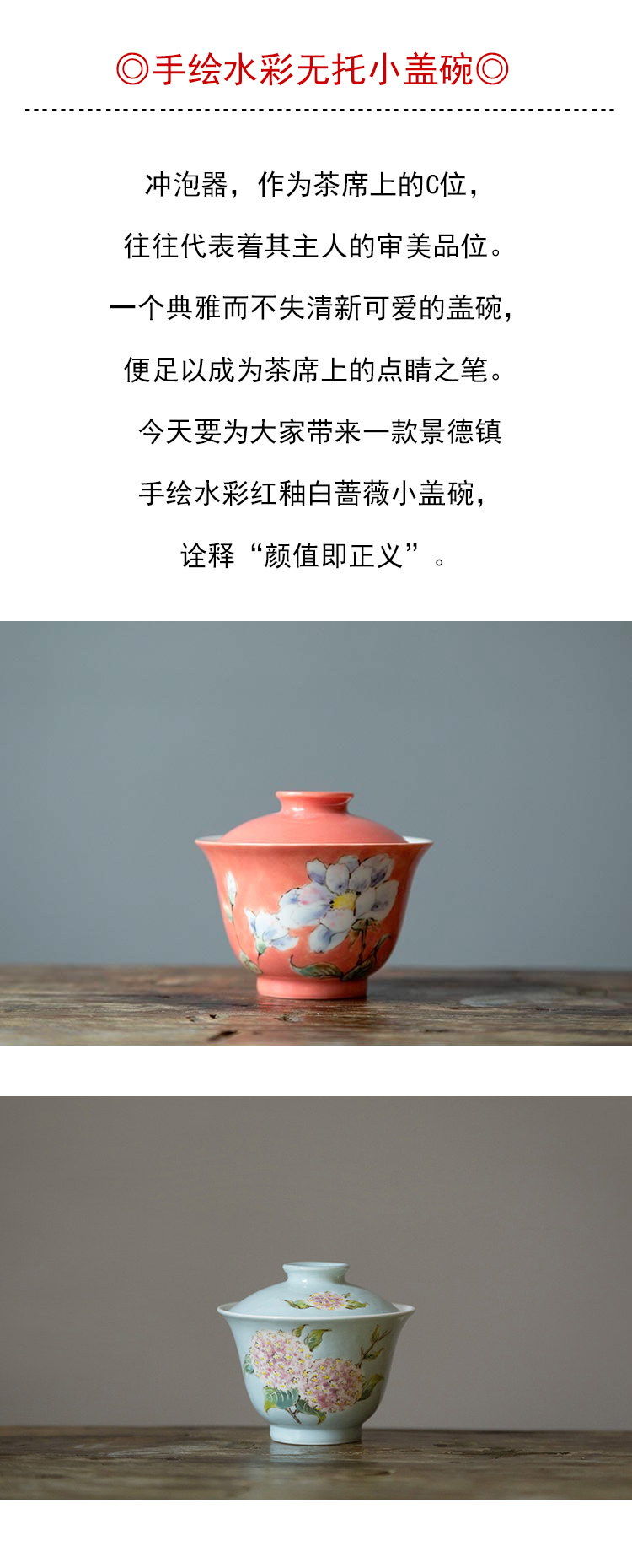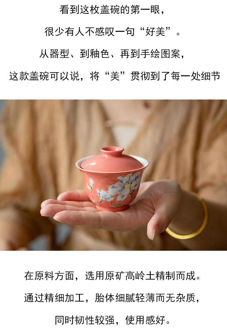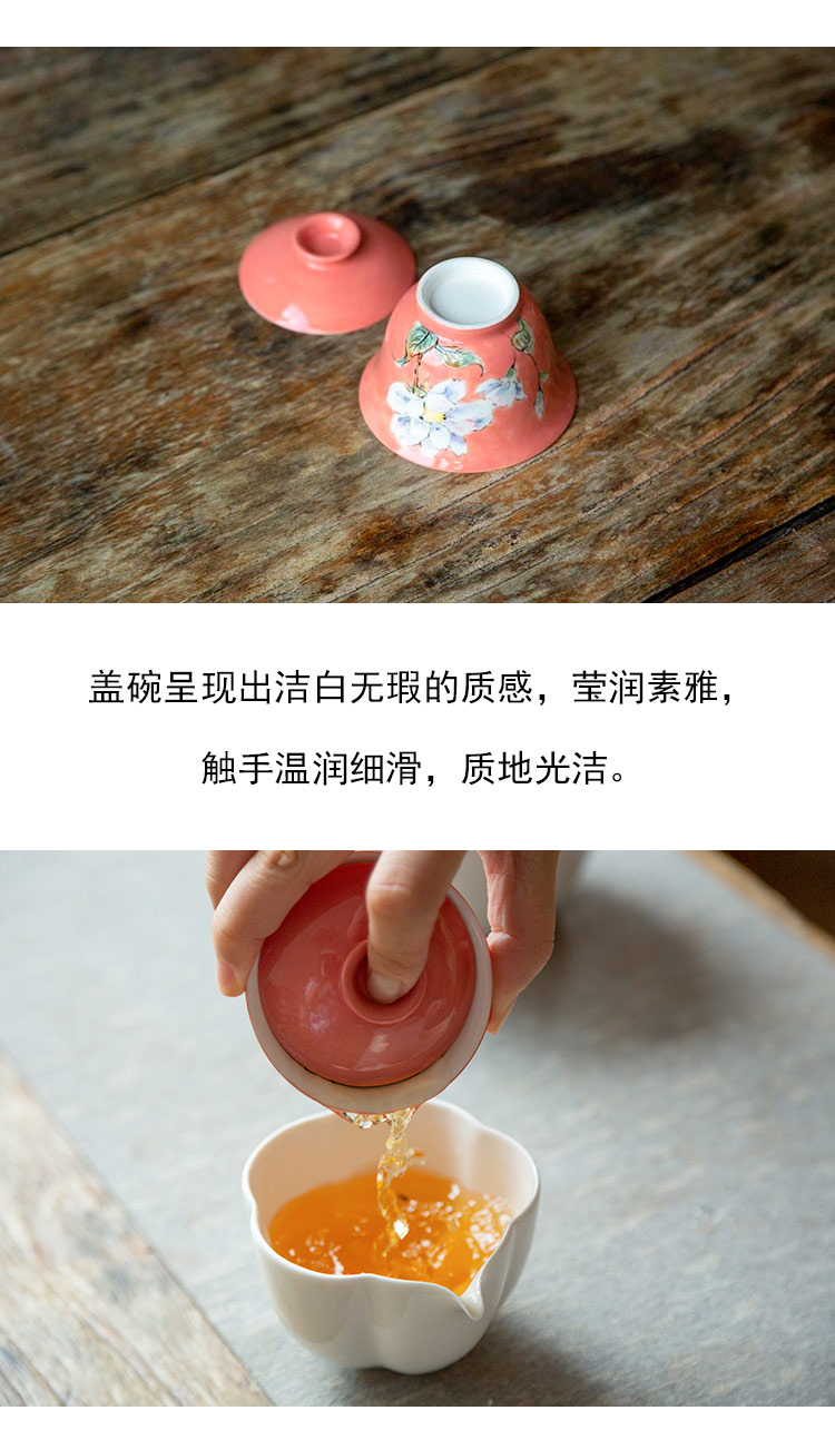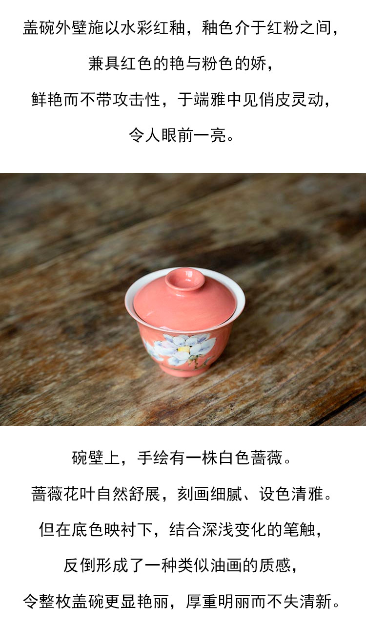 茶香记 景德镇手绘 水彩红釉 白蔷薇小盖碗 冲泡器 茶碗 功夫茶具