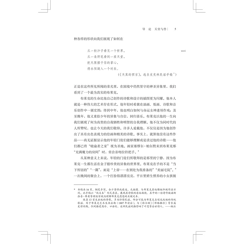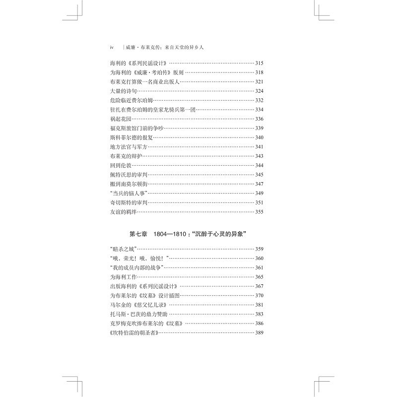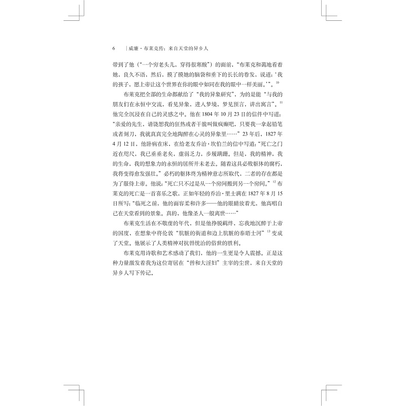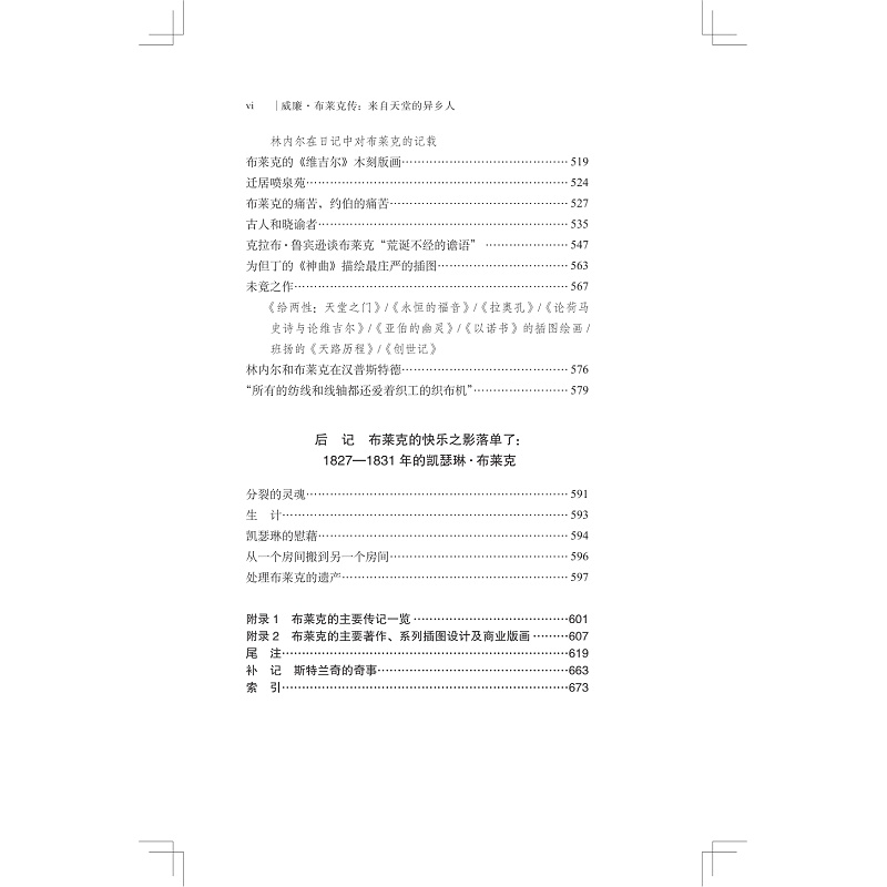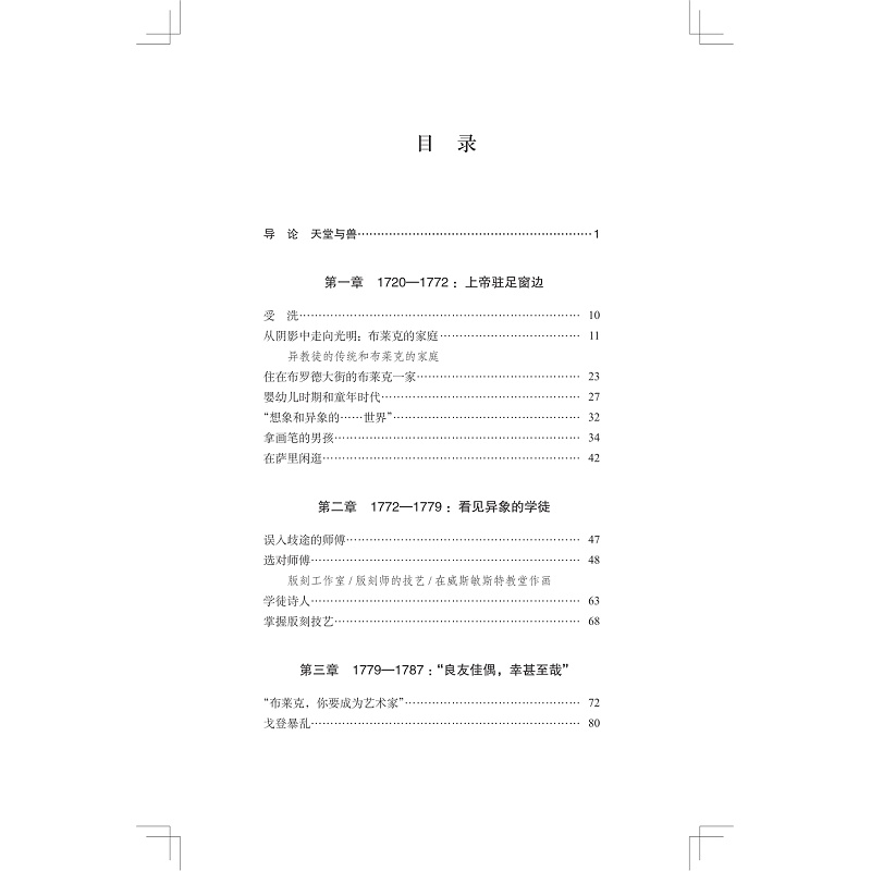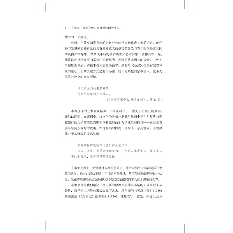 本特利从布莱克的出生地、童年、婚姻和学徒生涯一直追溯到他晚年作为雕刻师、诗人和激进的幻想家的生活。本特利的叙述严谨且详尽,这更像是一部正统的传记而非分析。