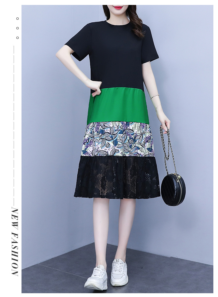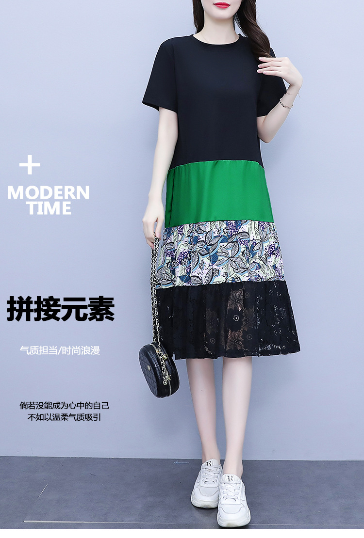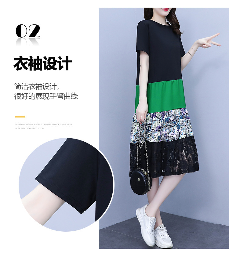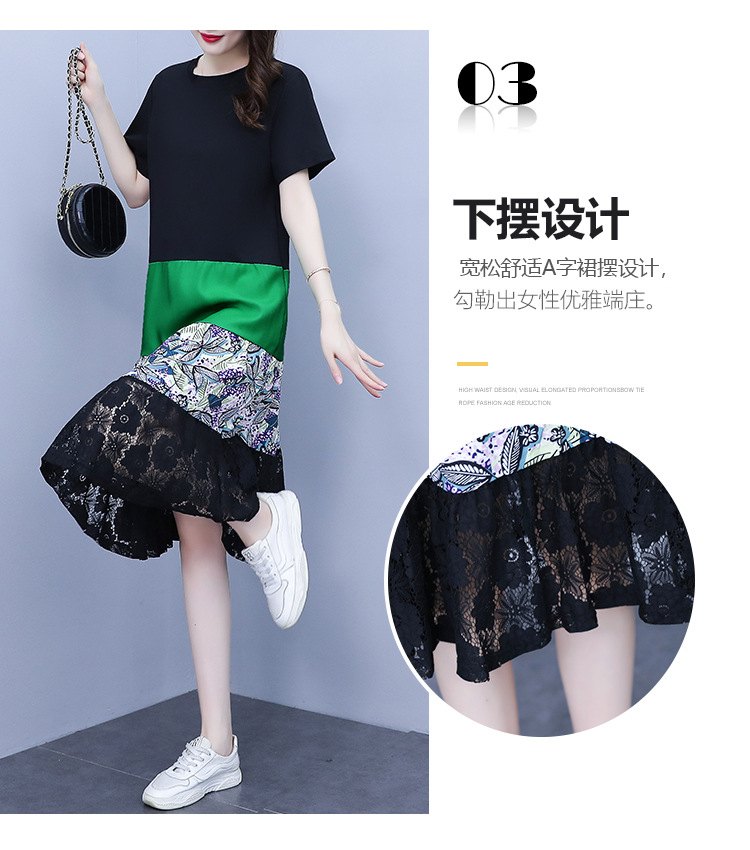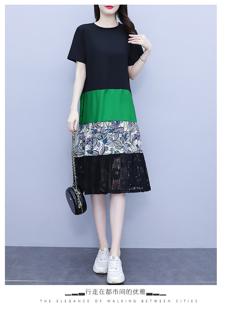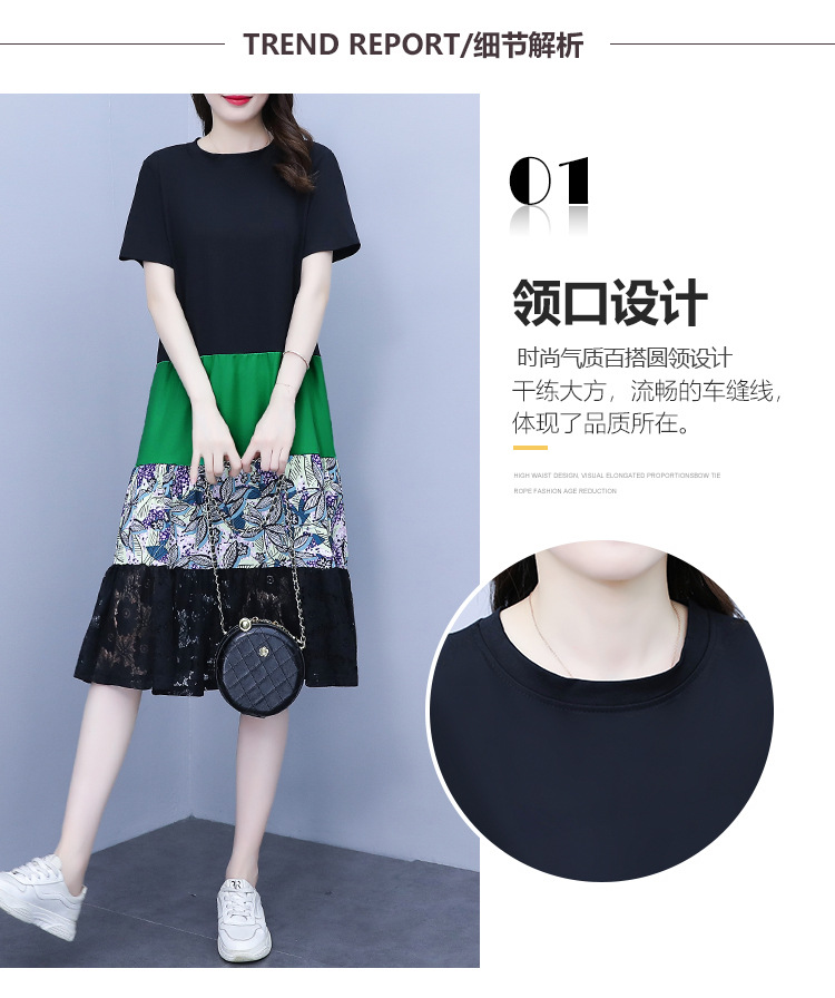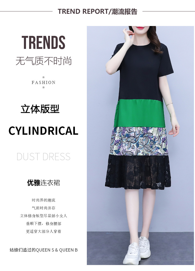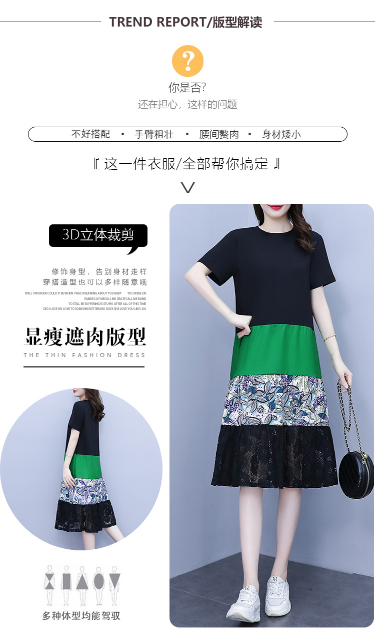 FEY-6573夏季胖mm显瘦藏肉拼撞色印花蕾丝连衣裙减龄过膝T恤长裙