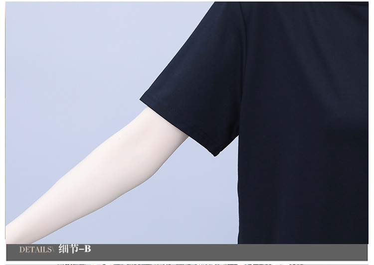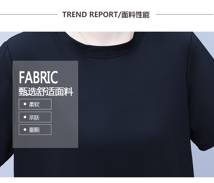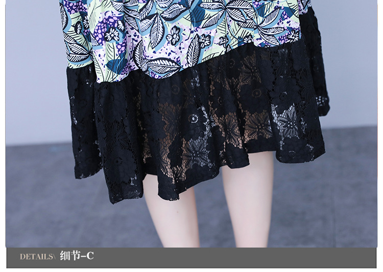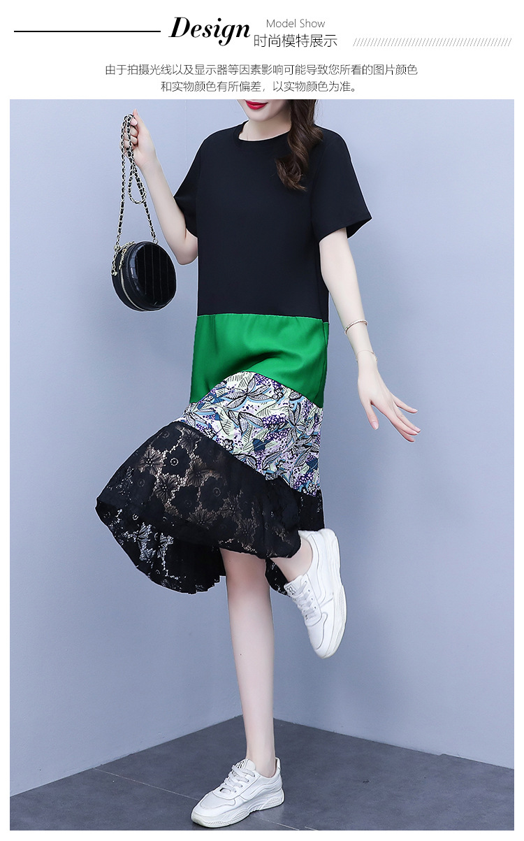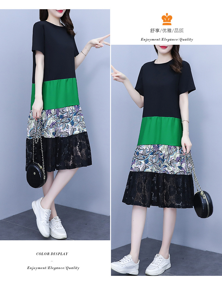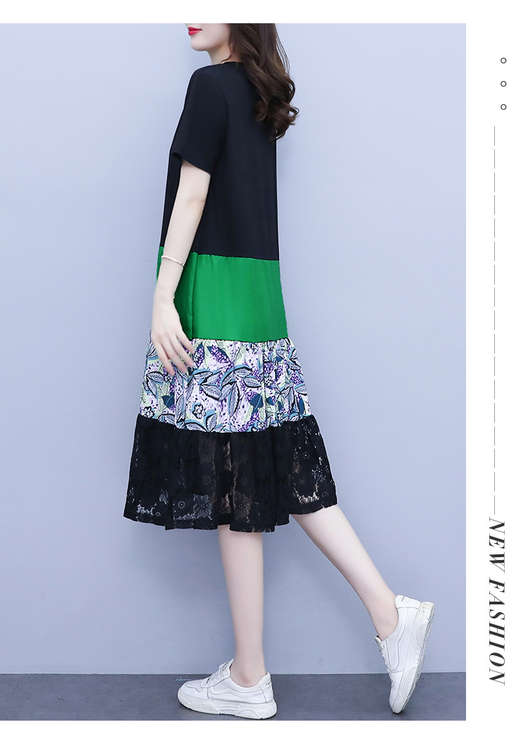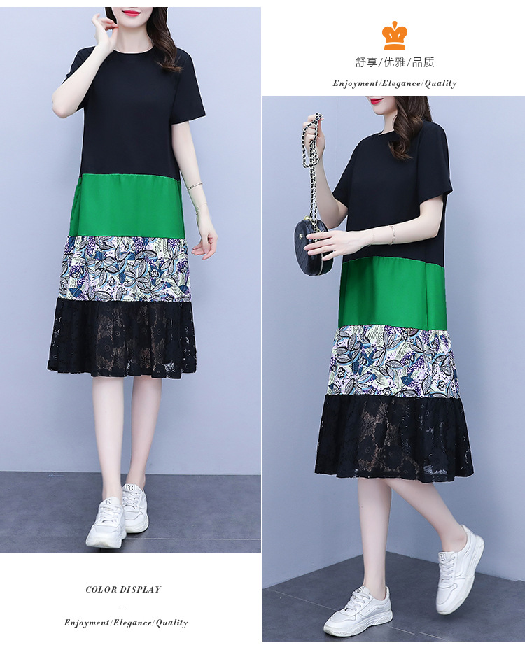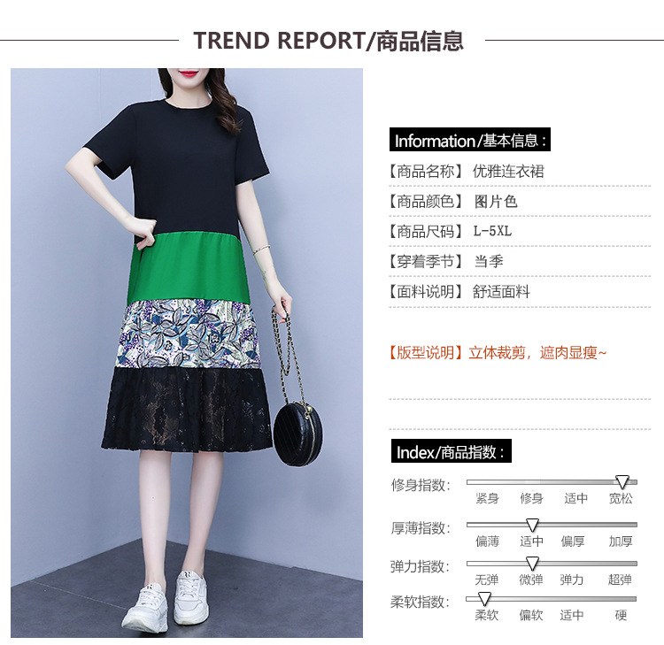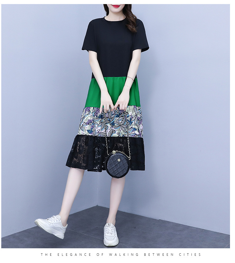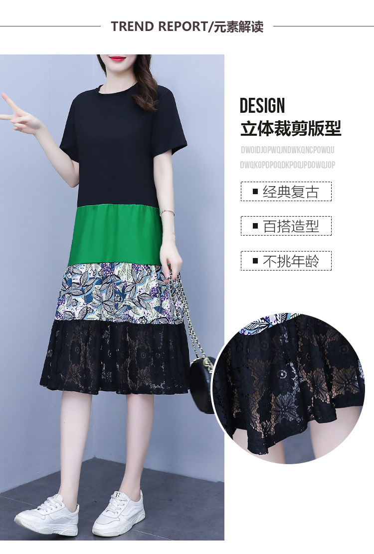FEY-6573夏季胖mm显瘦藏肉拼撞色印花蕾丝连衣裙减龄过膝T恤长裙