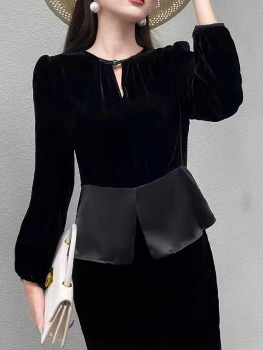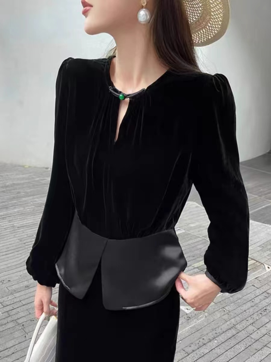 好看的哦~小V5138领金丝绒拼接仿真丝小衫上衣-喜出
