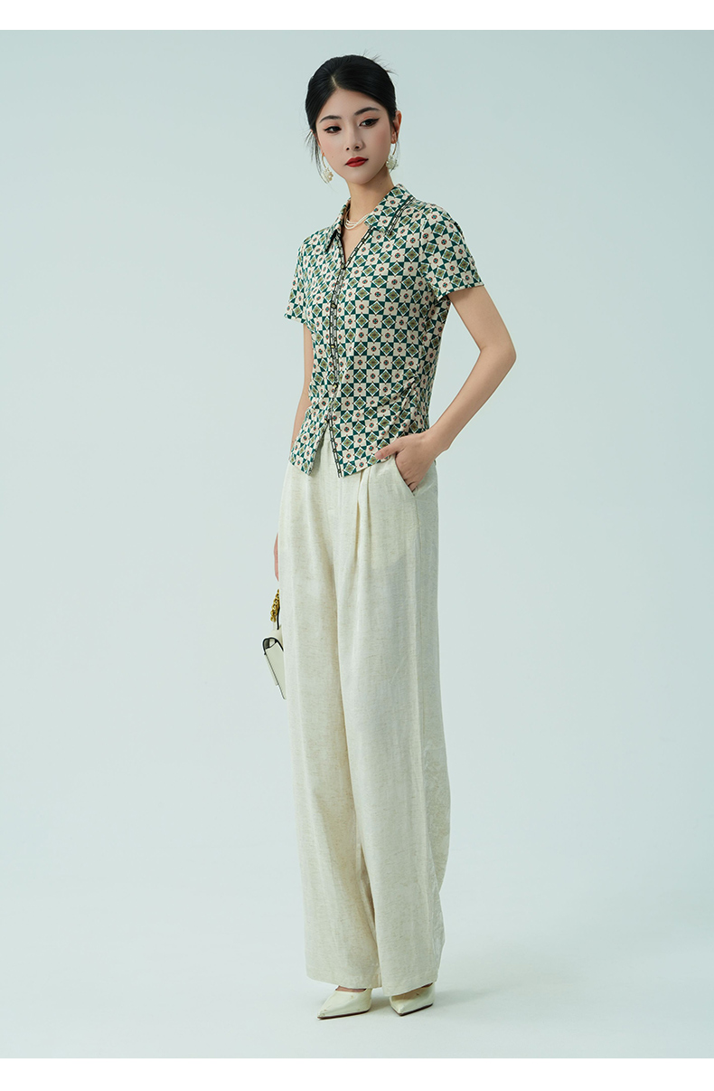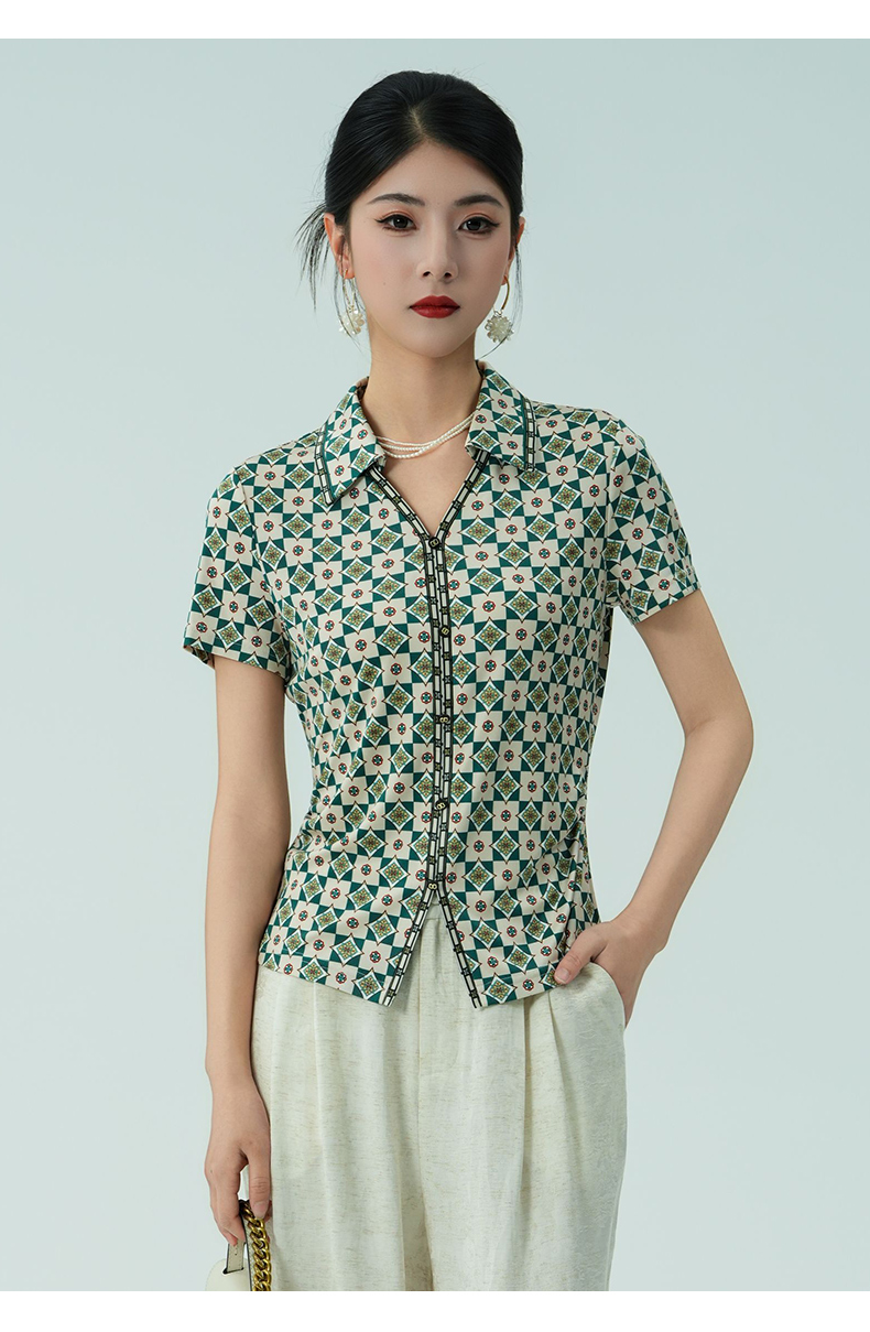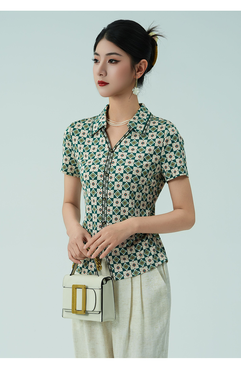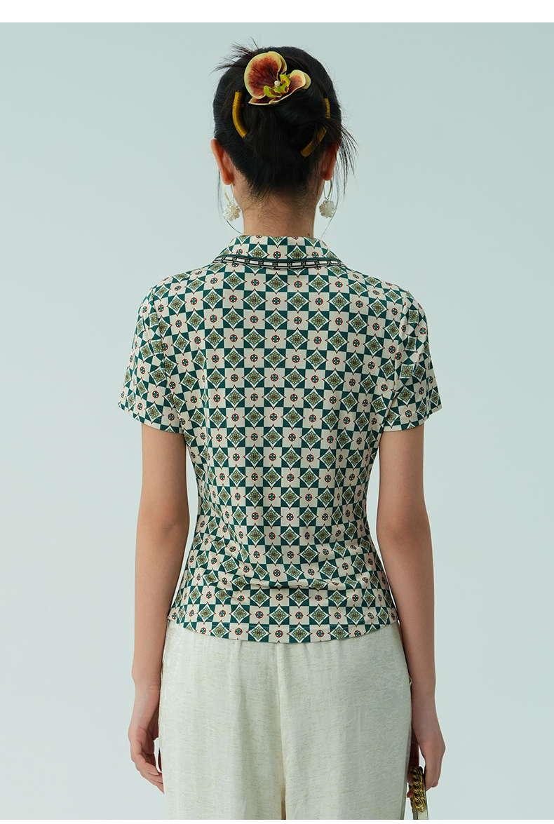 乔万尼新品真丝复古格纹V领收腰显瘦衬衫上衣ED2C535