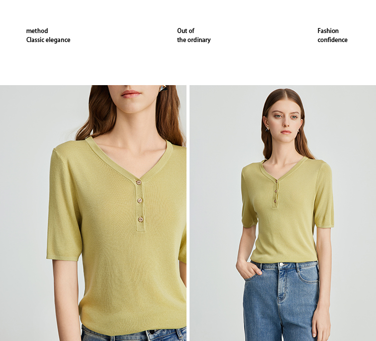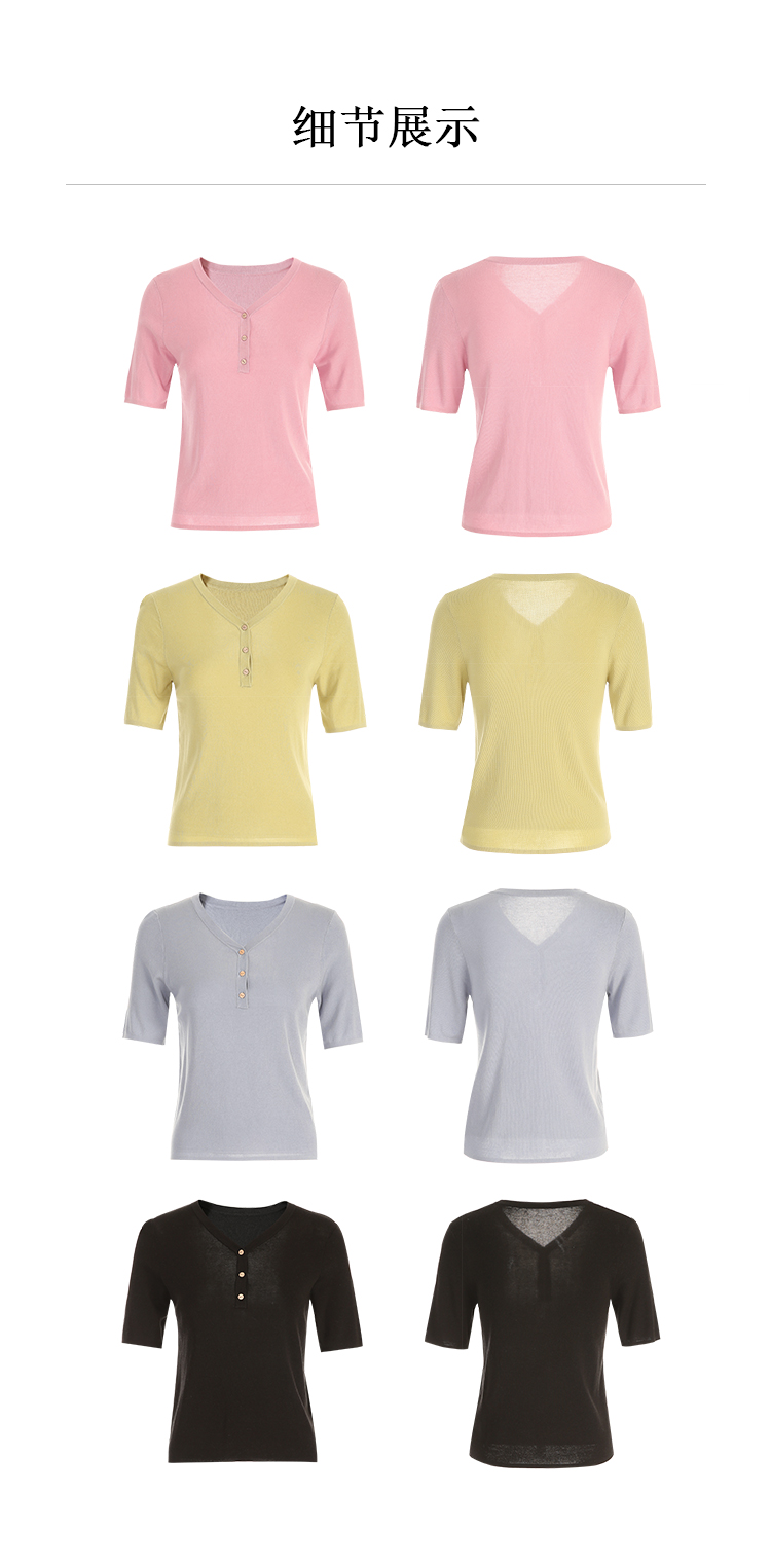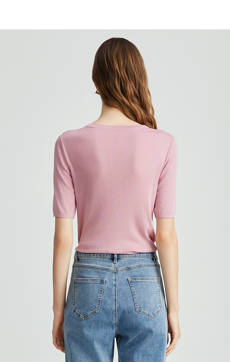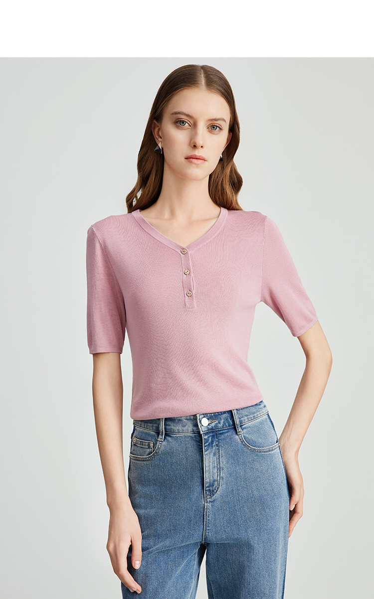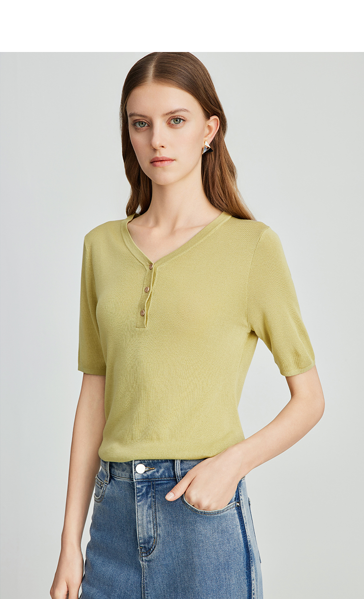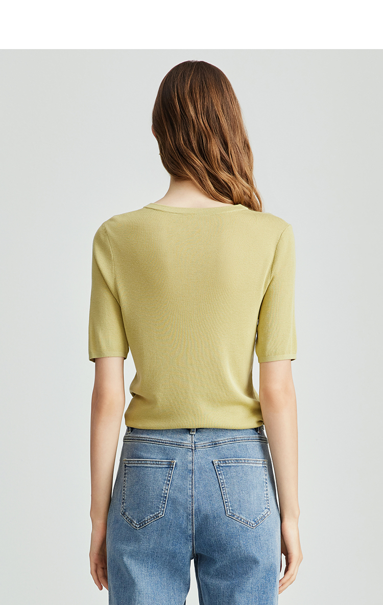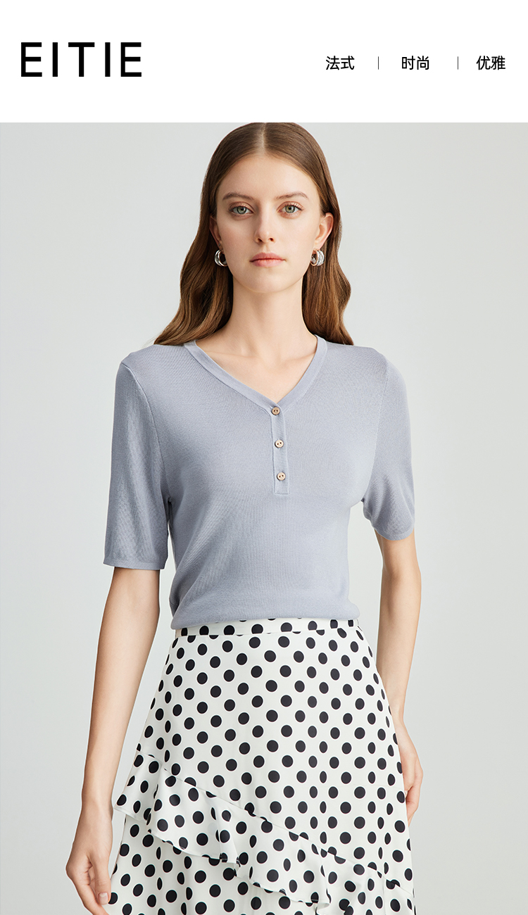 EITIE爱特爱夏季新款舒适轻薄莱赛尔蚕丝短袖V领纯色针织T恤B2401330