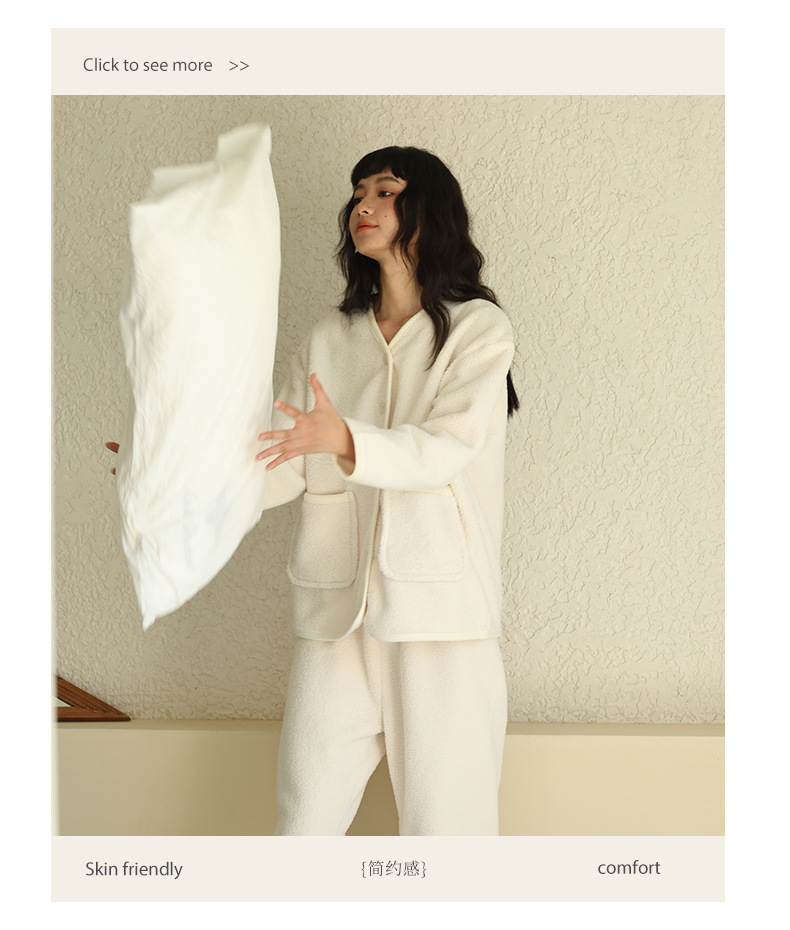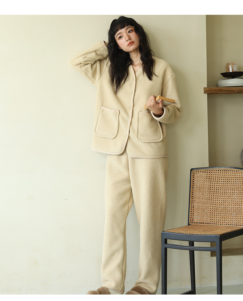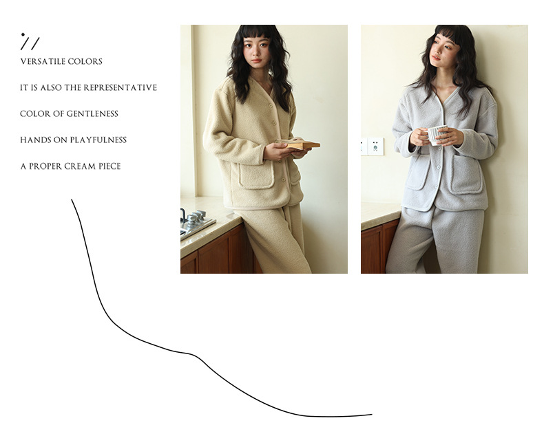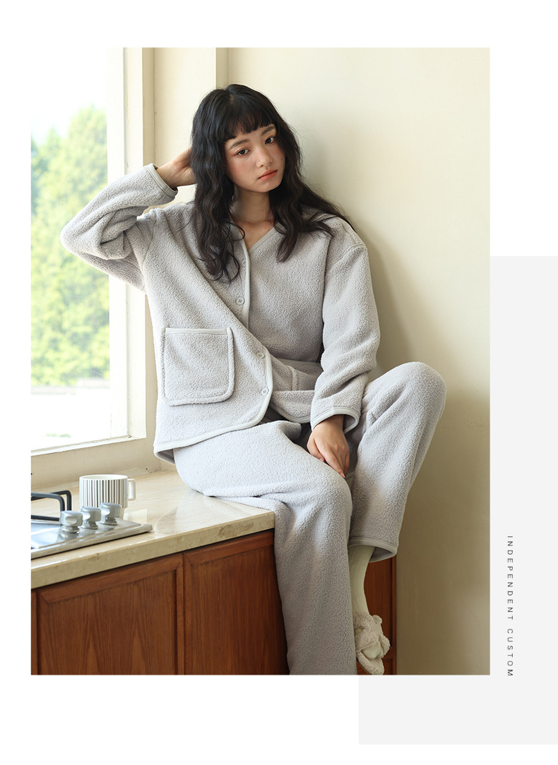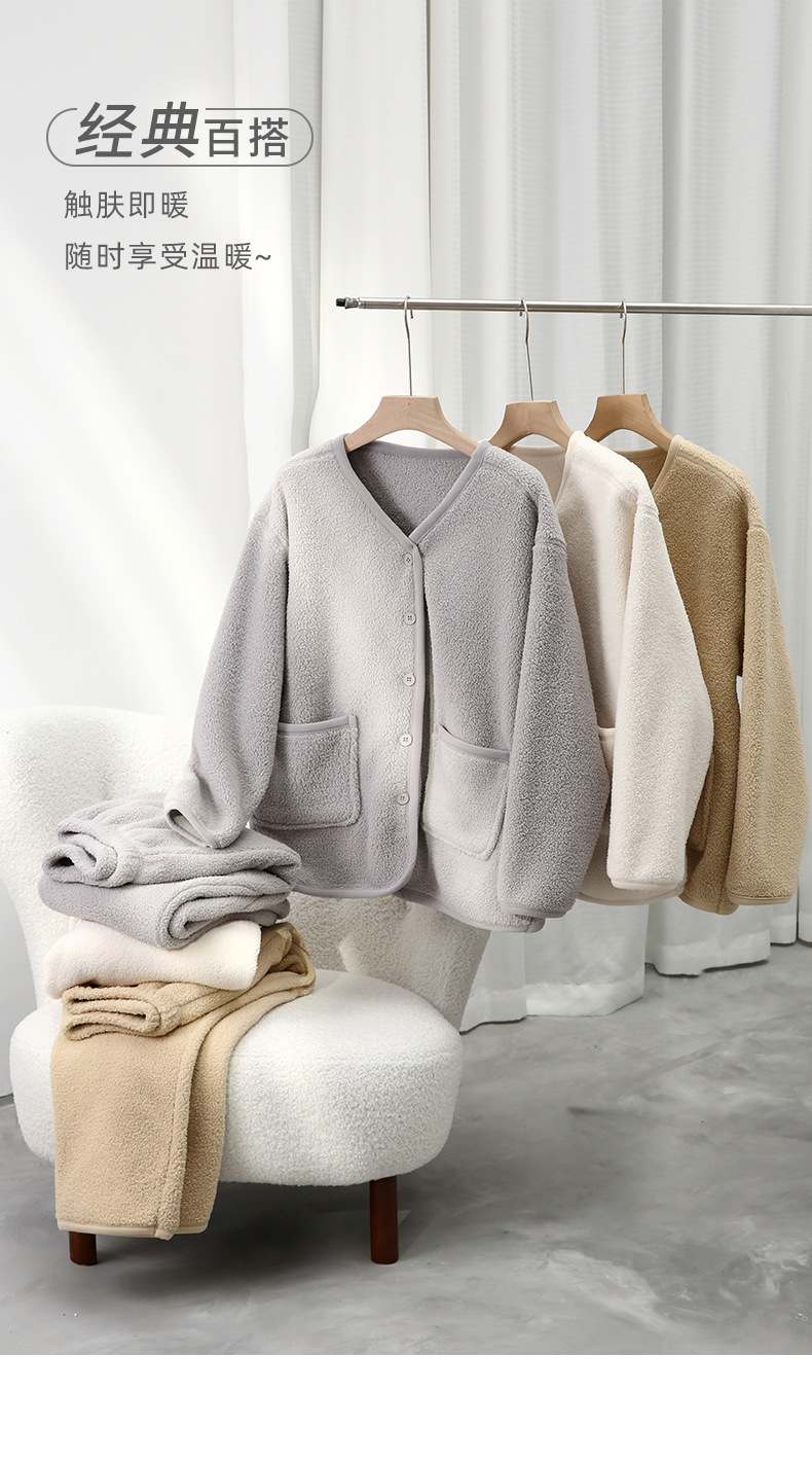 秋冬纽扣家居服 纯色可外穿绒绒开衫睡衣 宽松双面绒保暖套装