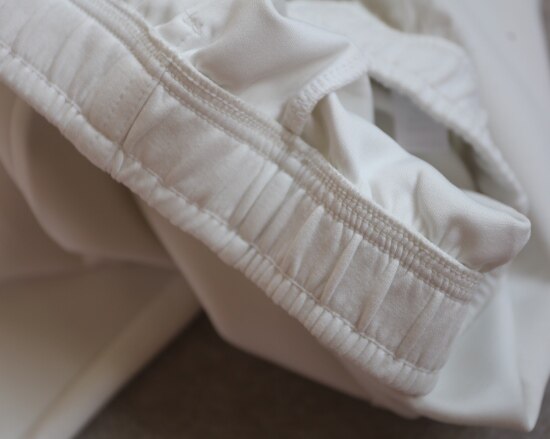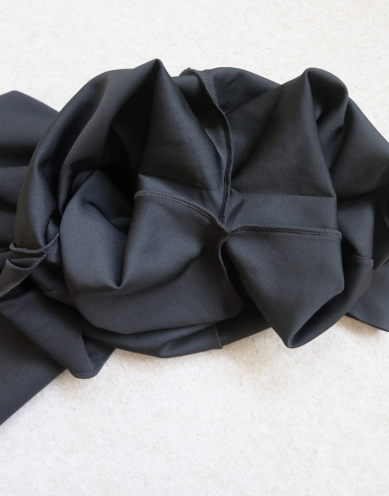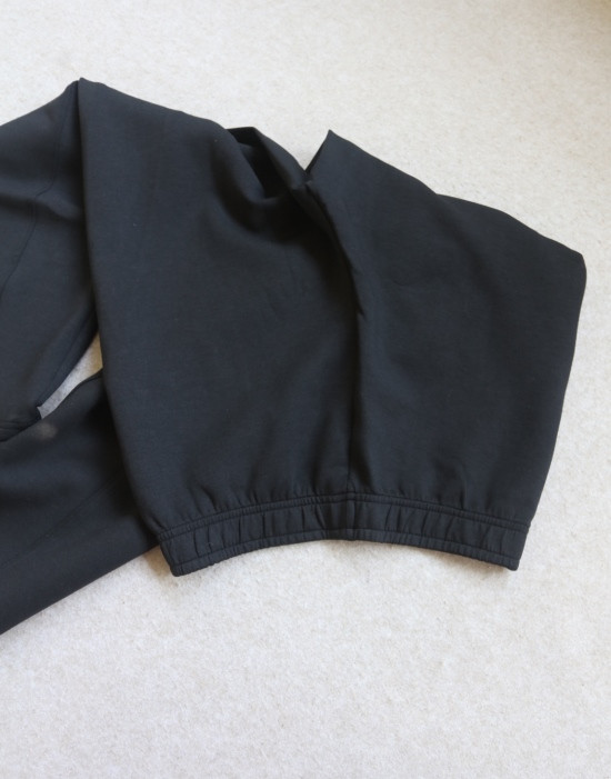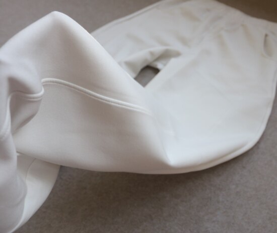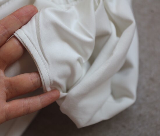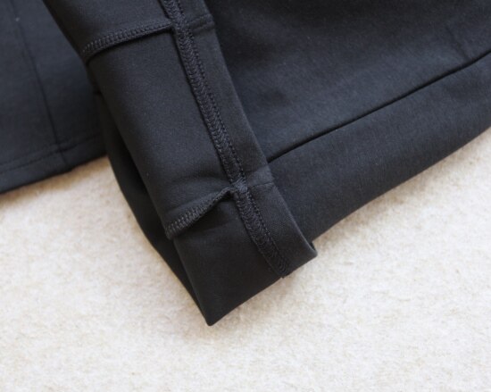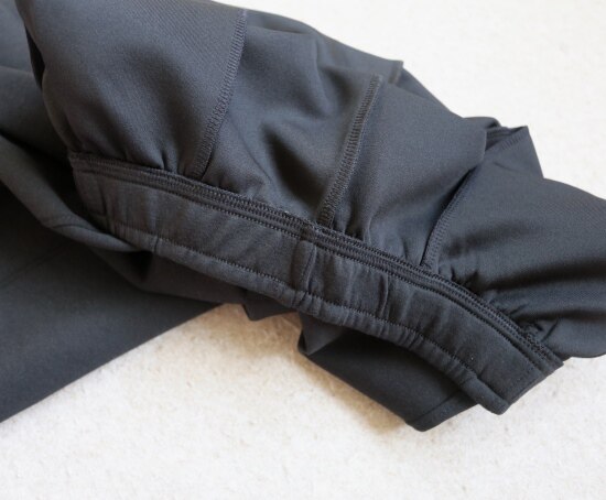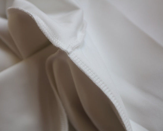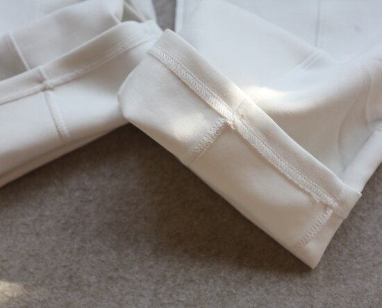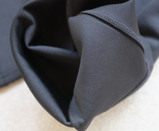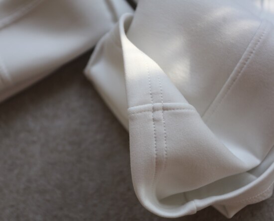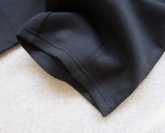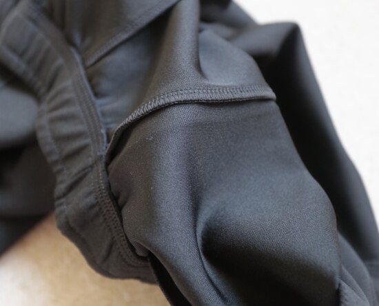 斜着的这条骨线 背面是三针五线 其他拼接处 是双针细密车缝 缝线都有弹力