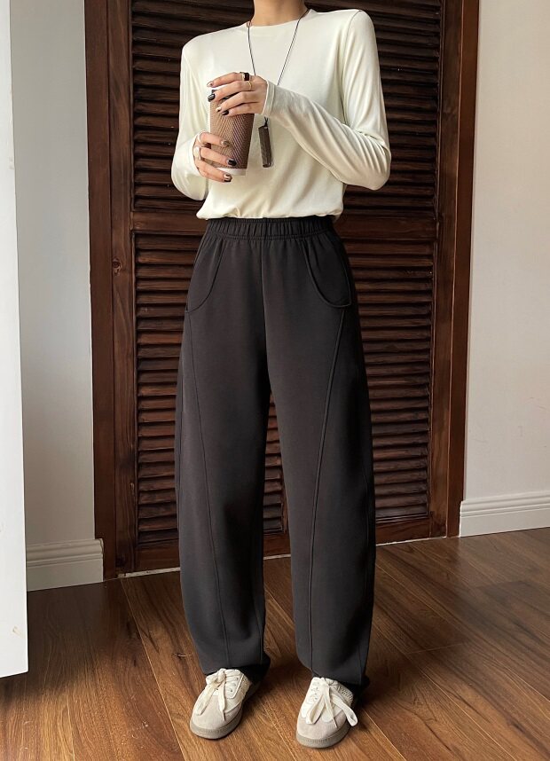 立体剪裁 臀部是自然弧出来的 斜线条下来 增加裤筒的挺阔感
