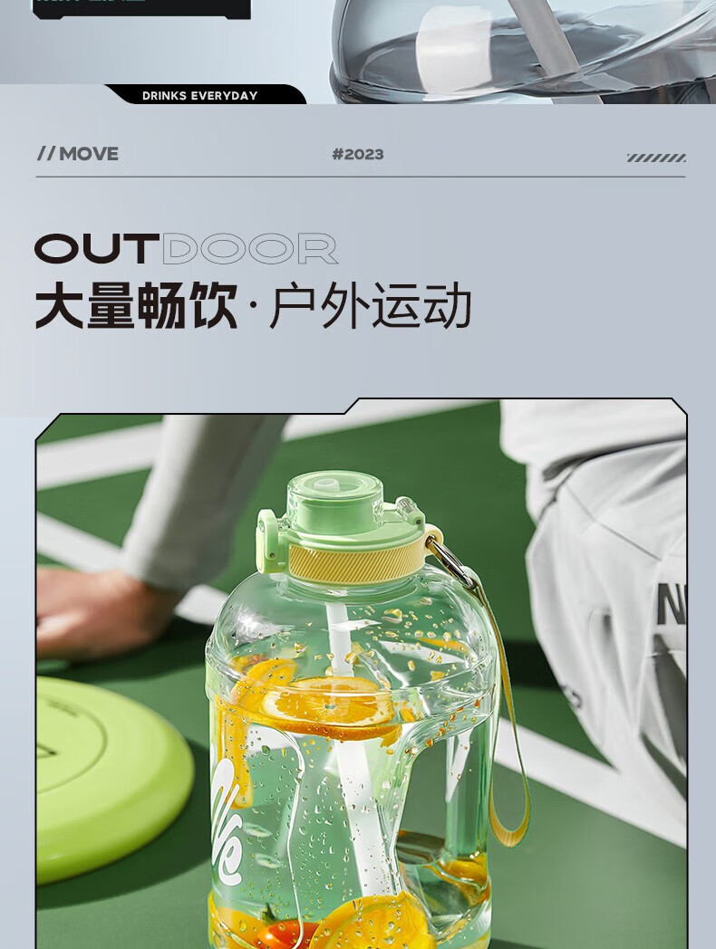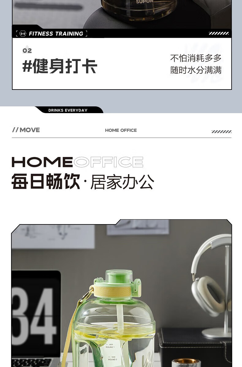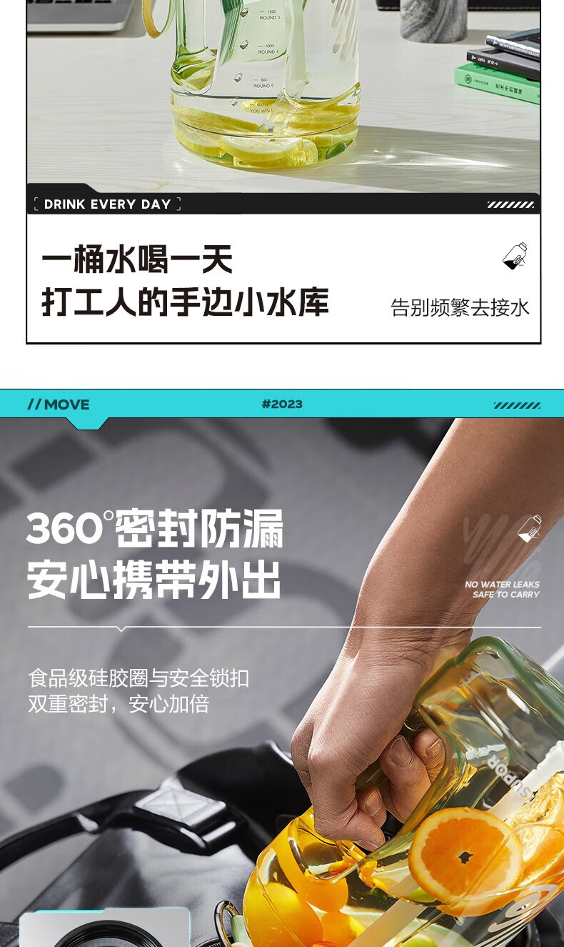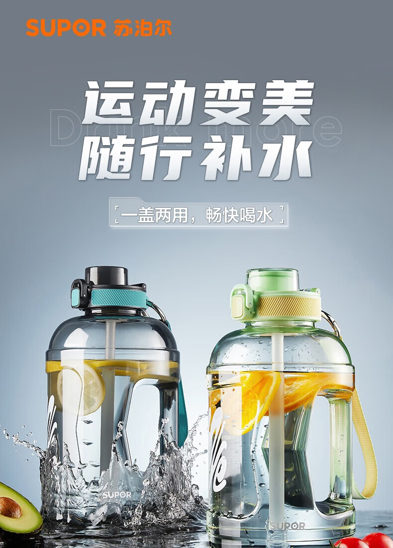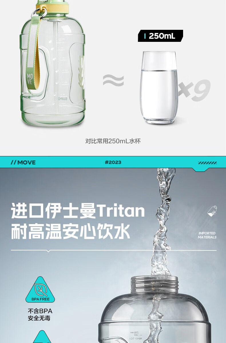 苏泊尔(SUPOR)水杯1.6L大容量吨桶吨健身运动男女吸管大肚顿顿桶杯子夏季水壶清透绿 KCP16LB20