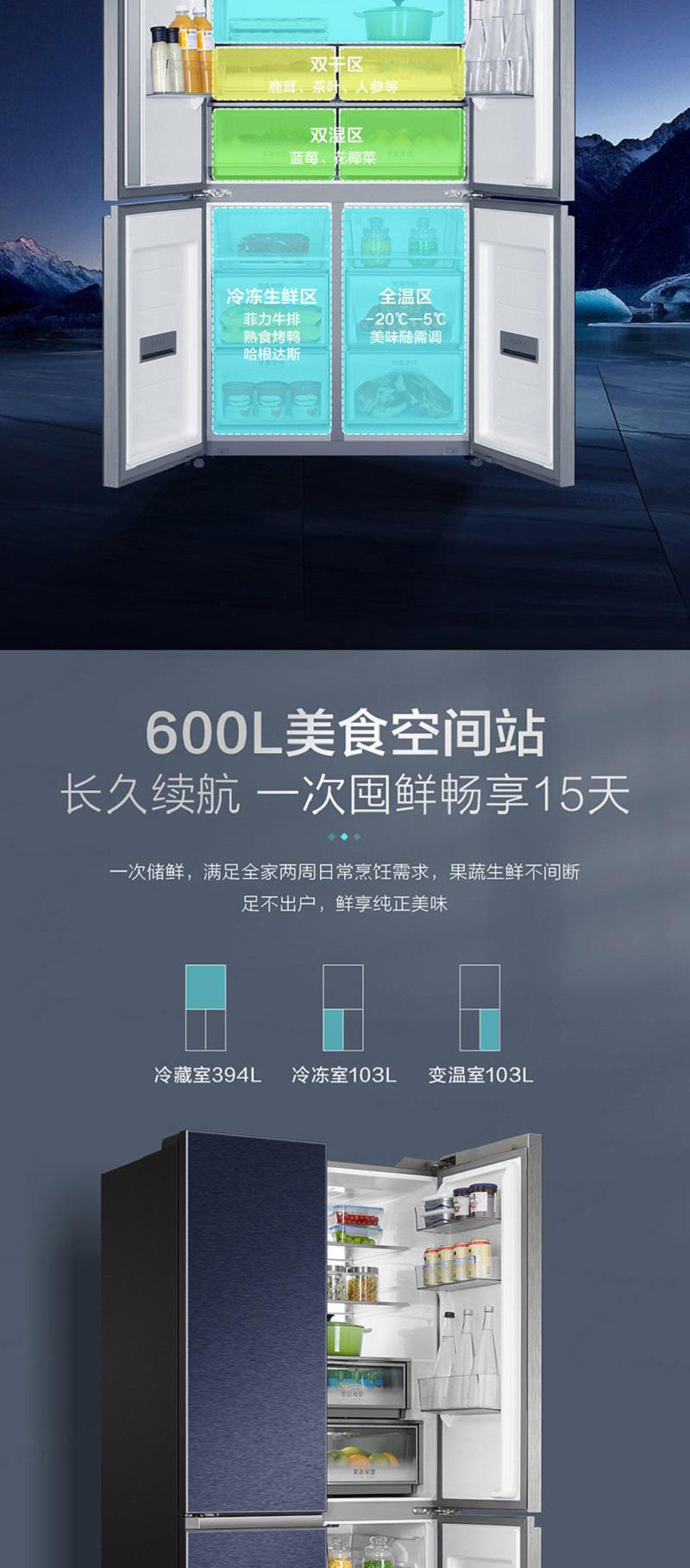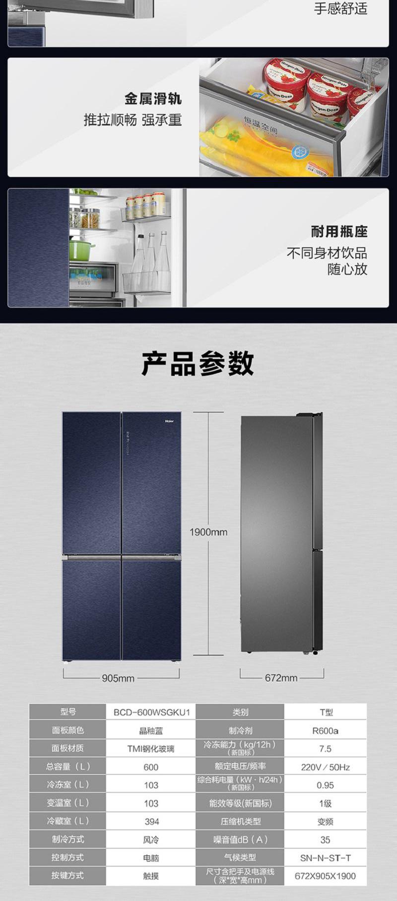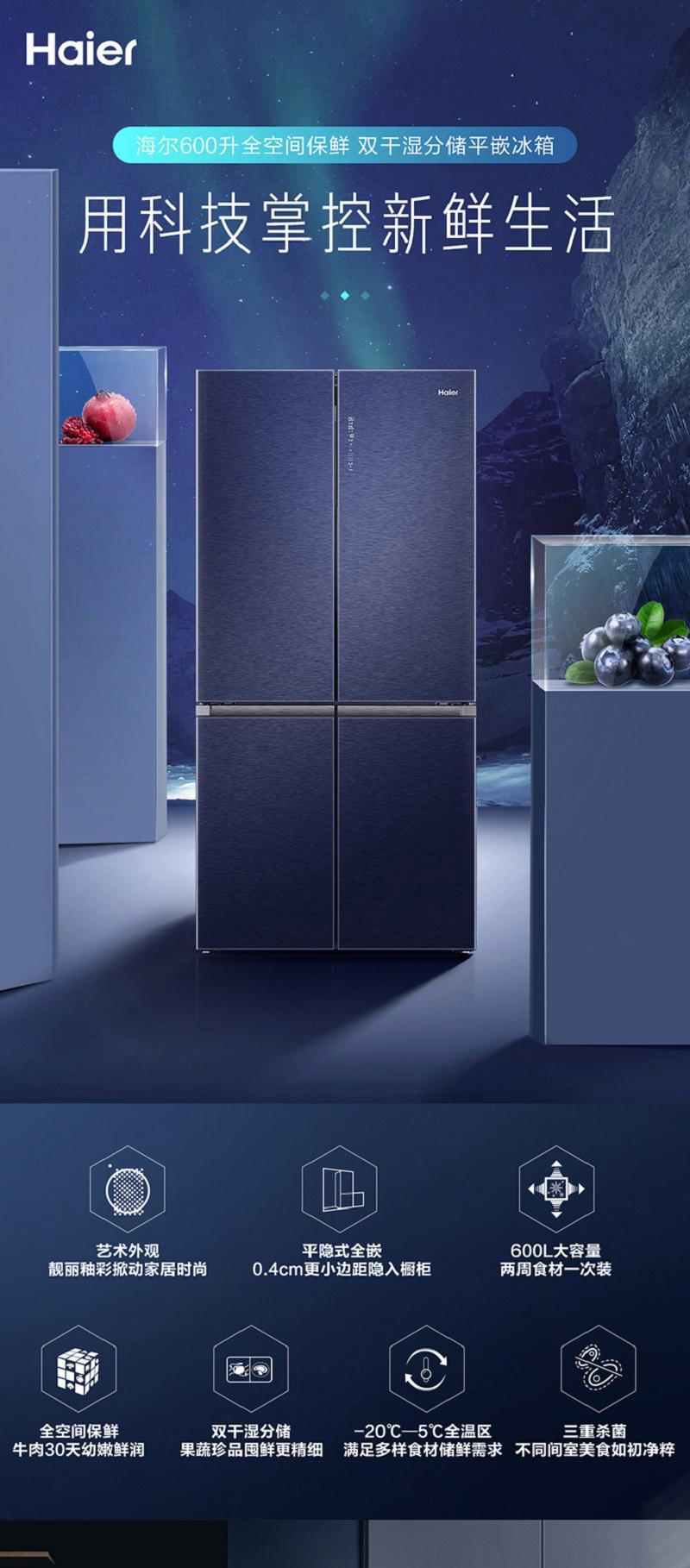 海尔(Haier)600升全空间保鲜零距离自由嵌入式十字对开门四门冰箱 BCD-600WSGKU1