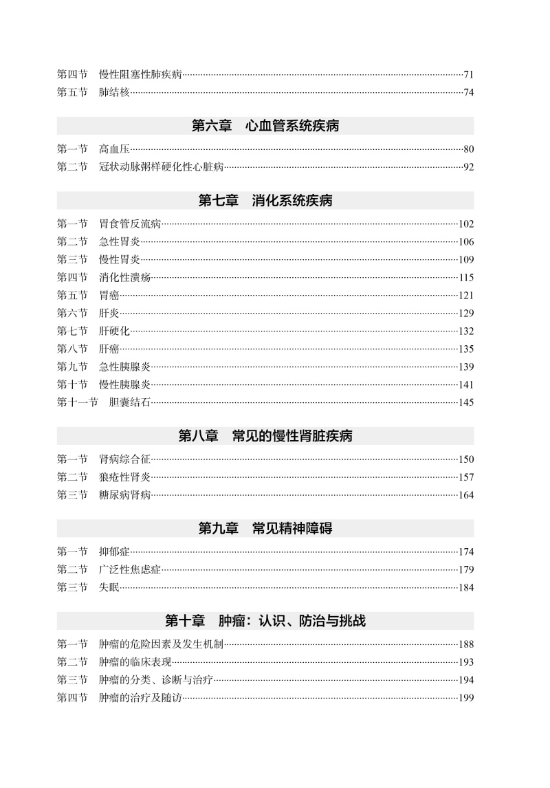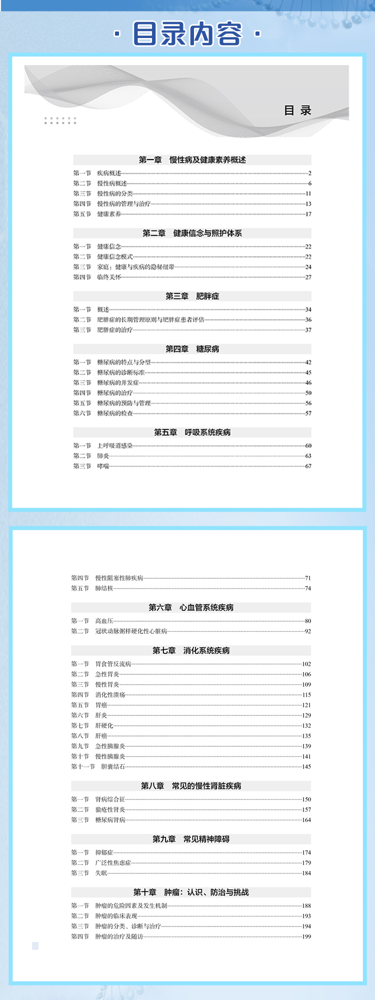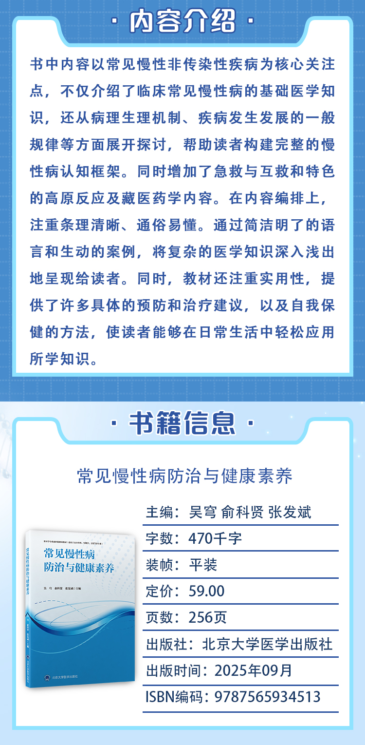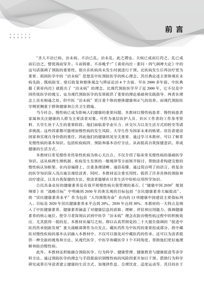 书中内容以常见慢性非传染性疾病为核心关注点,不仅介绍了临床常见慢性病的基础医学知识,还从病理生理机制、疾病发生发展的一般规律等方面展开探讨,帮助读者构建完整的慢性病认知框架。同时增加了急救与互救和特色的高原反应及藏医药学内容。在内容编排上,注重条理清晰、通俗易懂。通过简洁明了的语言和生动的案例,将复杂的医学知识深入浅出地呈现给读者。同时,教材还注重实用性,提供了许多具体的预防和治疗建议,以及自我保健的方法,使读者能够在日常生活中轻松应用所学知识。