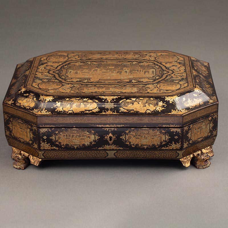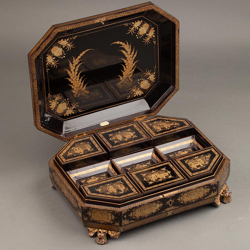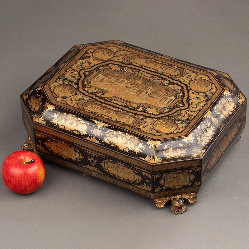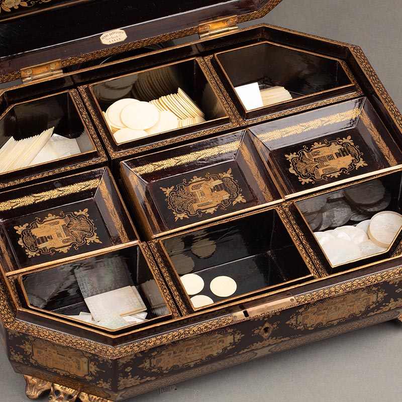 1830年代中国清代出品园邸人物主题黑漆描金八角游戏盒